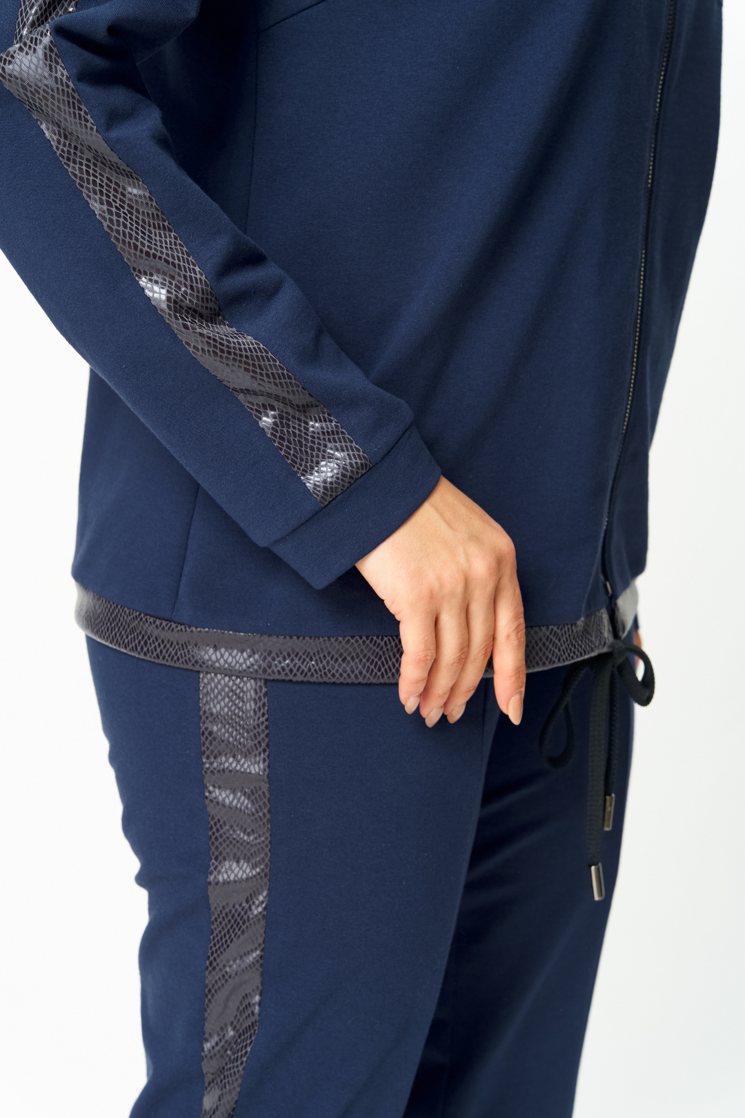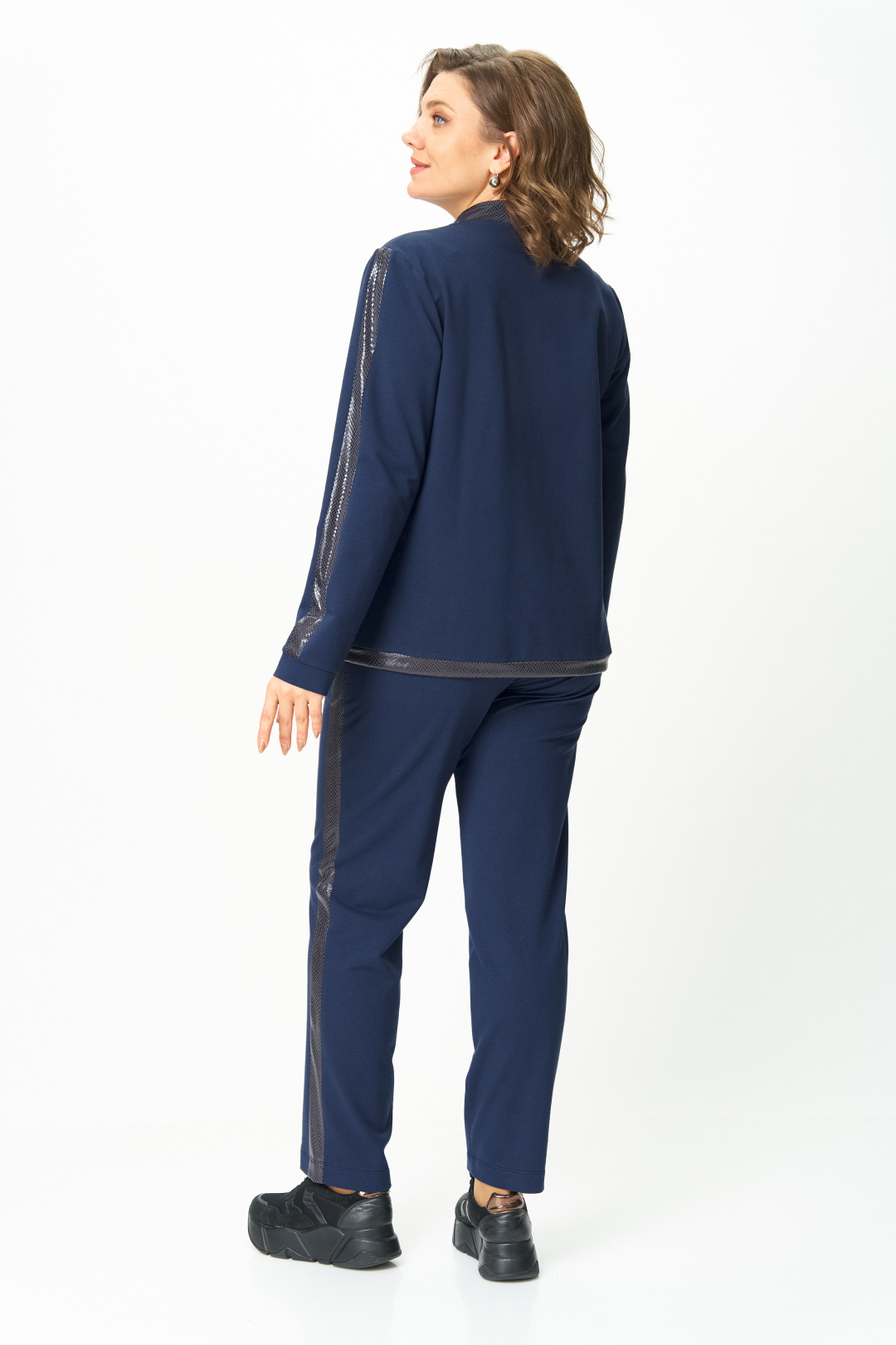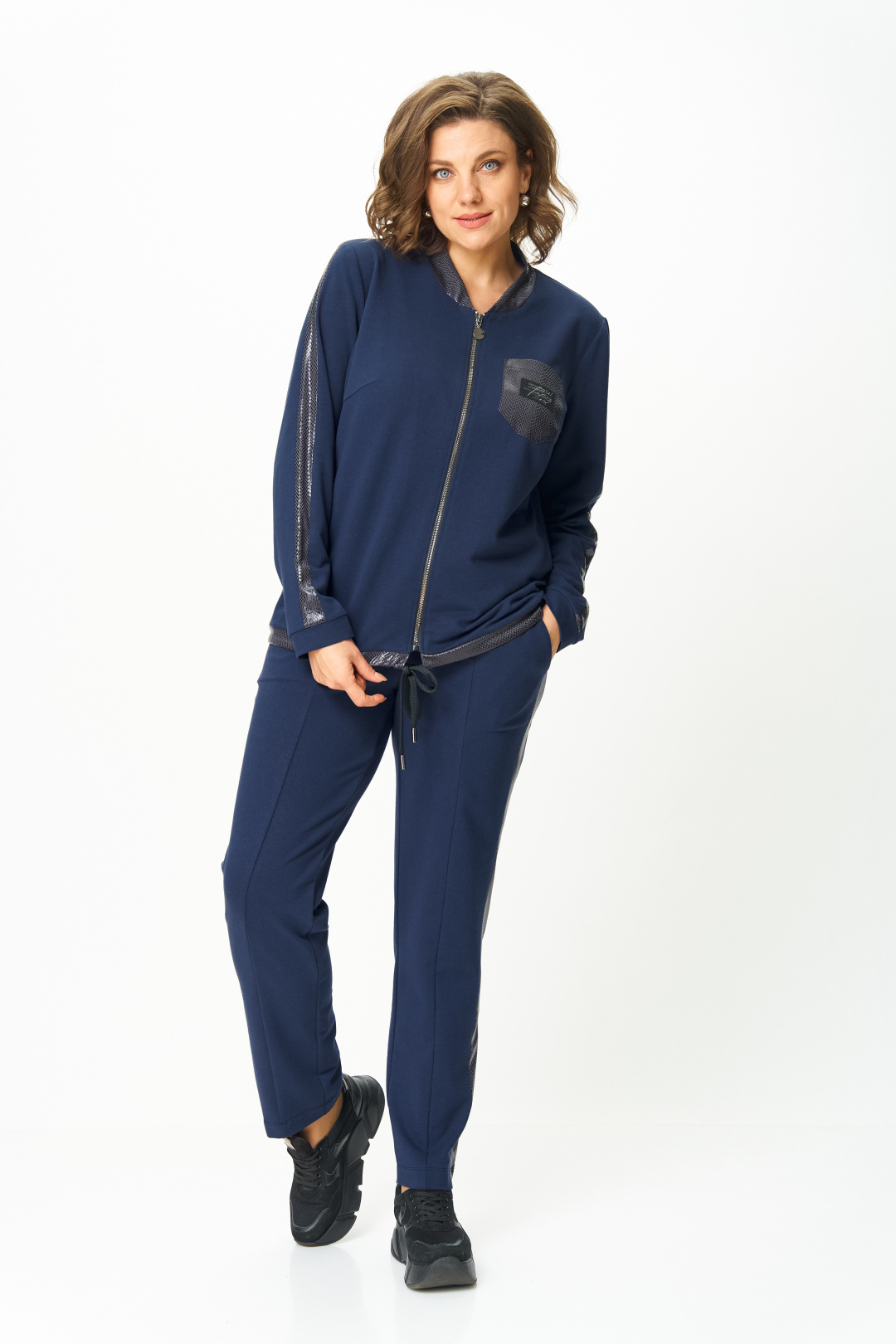 Костюм выполнен в спортивном стиле.