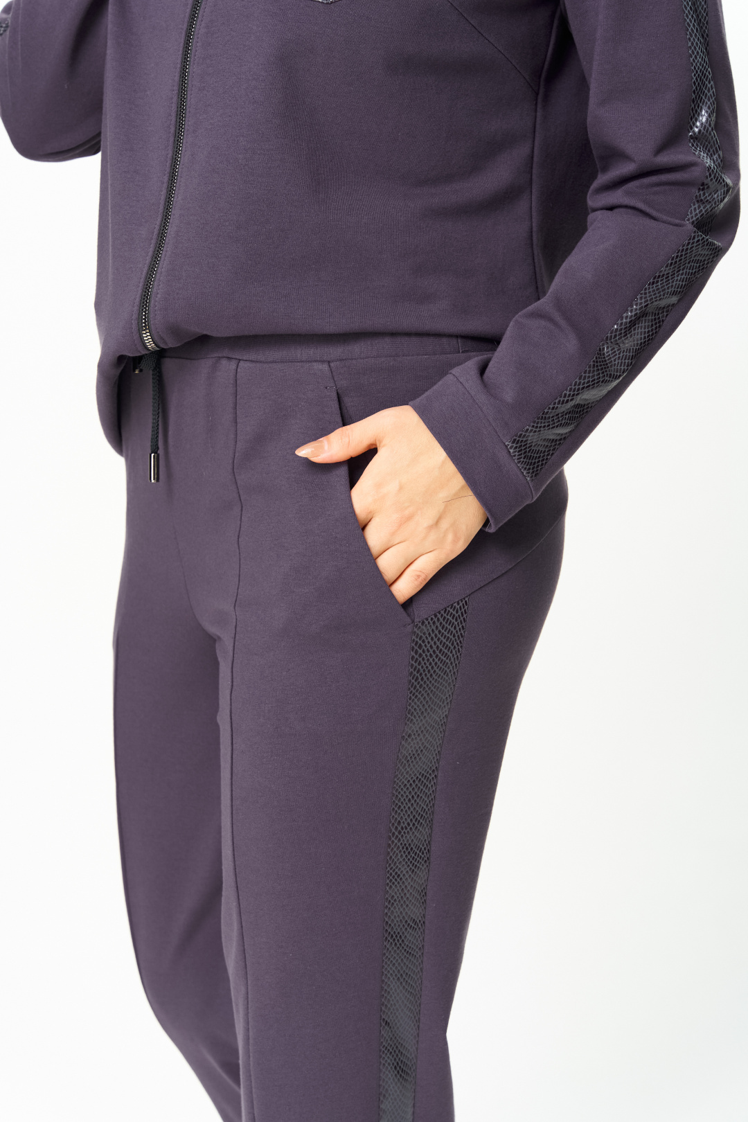 Брюки, зауженные к низу, по верху на задних половинках отрезные кокетки, по боковым швам от кокетки до низа отделочные лампасы, на уровне бедер в швах функциональные карманы. Верх брюк оформлен отрезным поясом с резинкой.