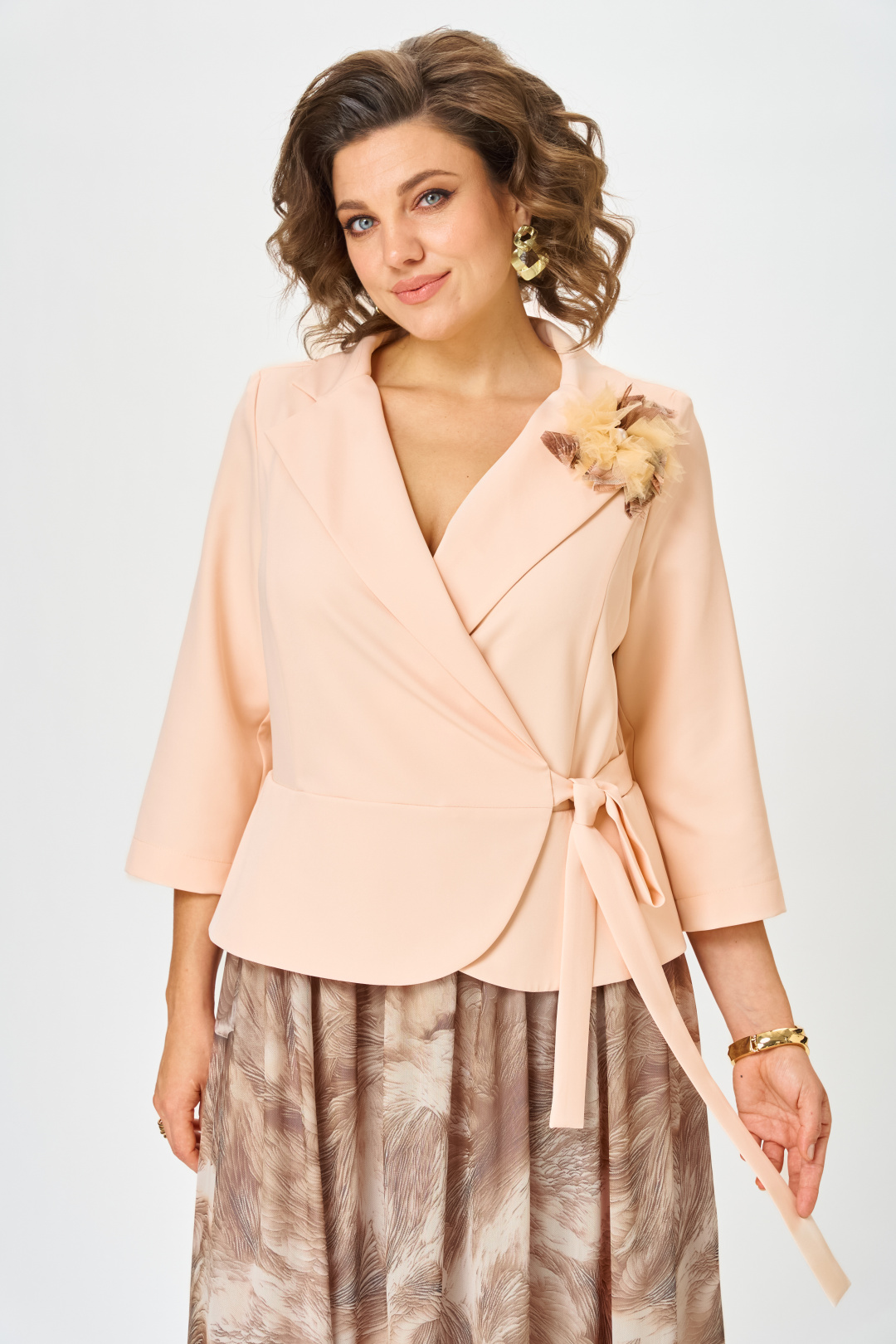 Платье полуприлегающего силуэта, верх жакетного типа с запахом. Юбка расширенная со сборкой по талии, на подкладке.