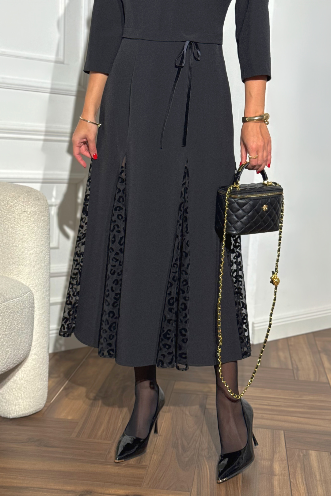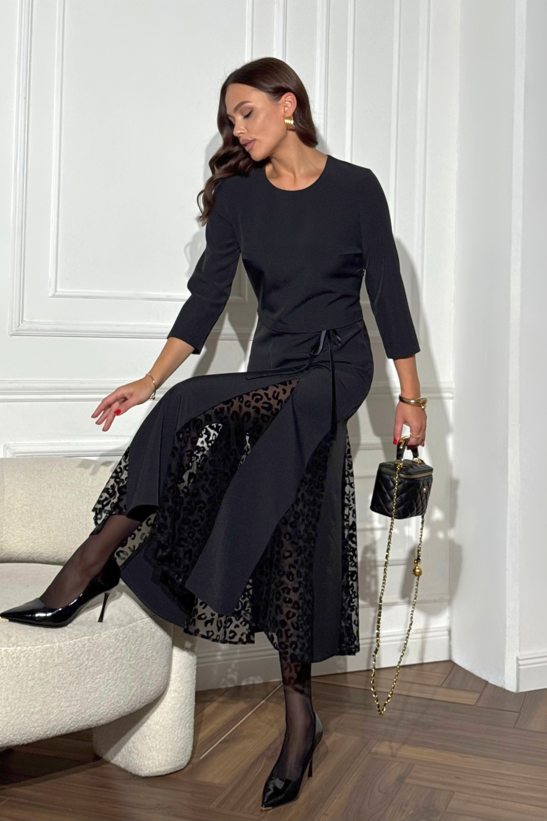 Платье полуприлегающего силуэта, отрезное по линии талии с кулисой, через которую протянут декоративный шнур.