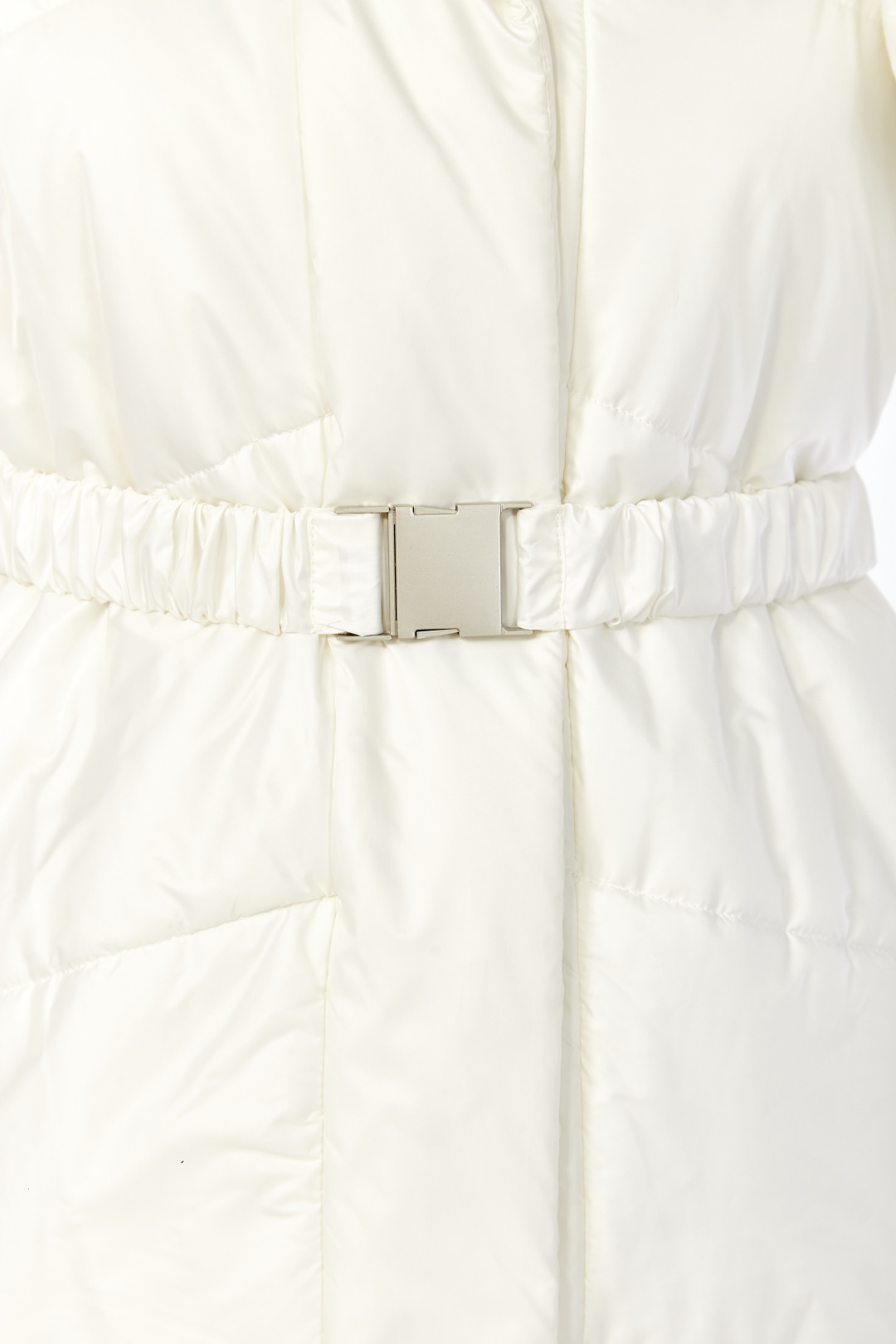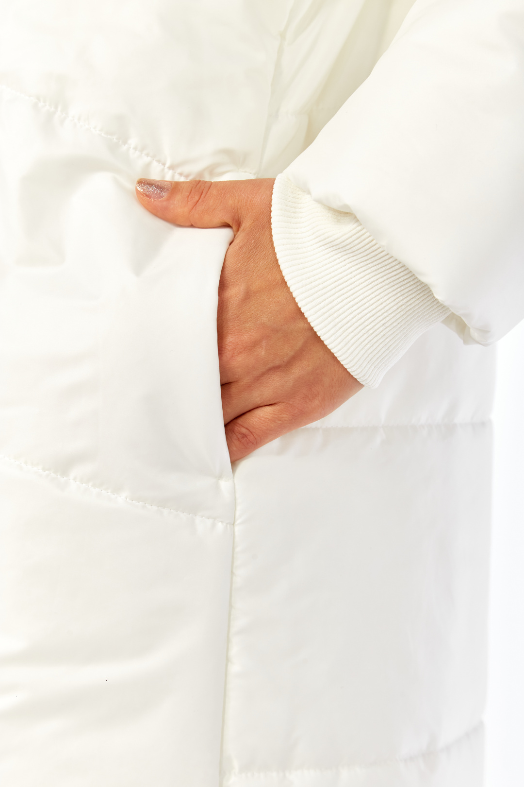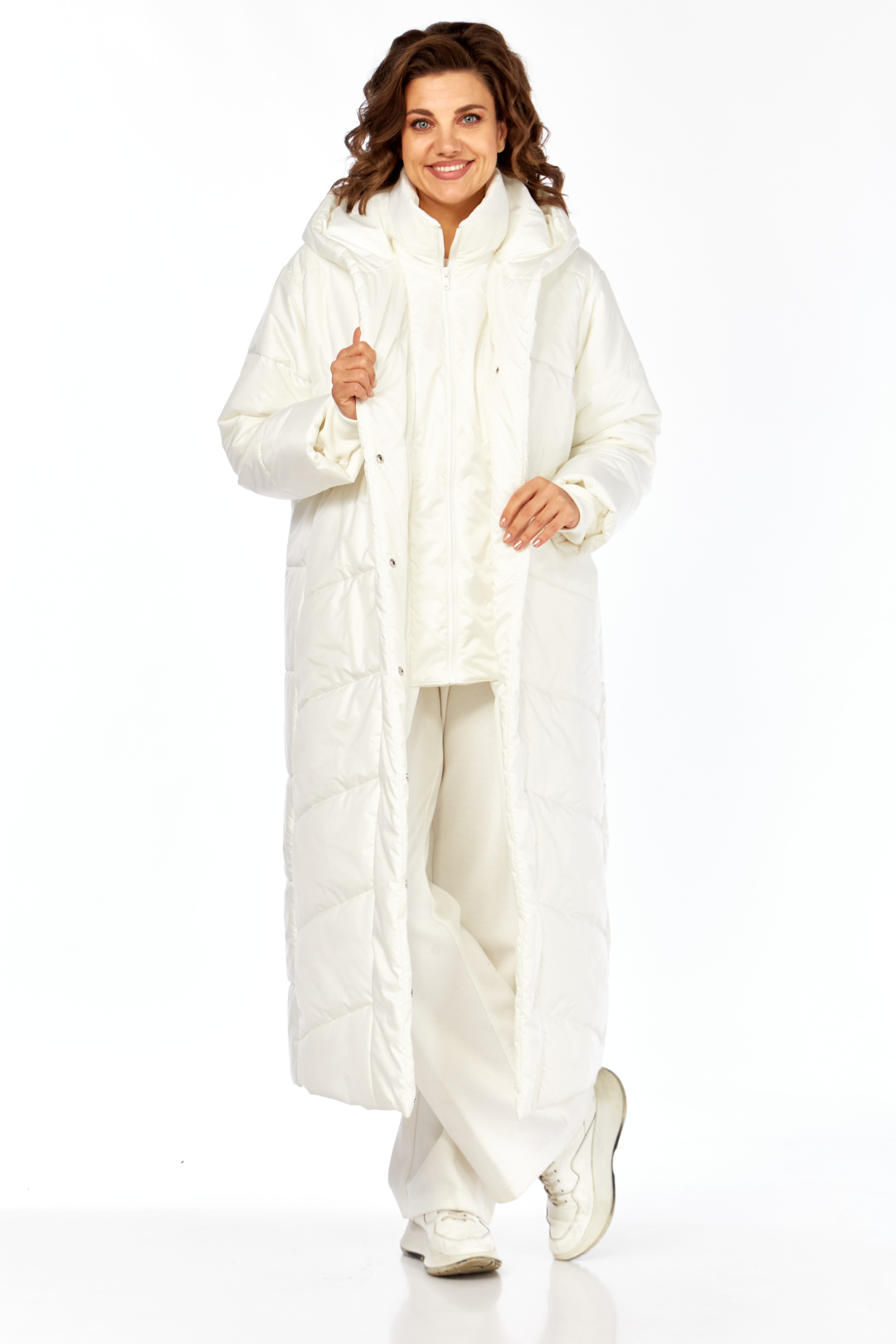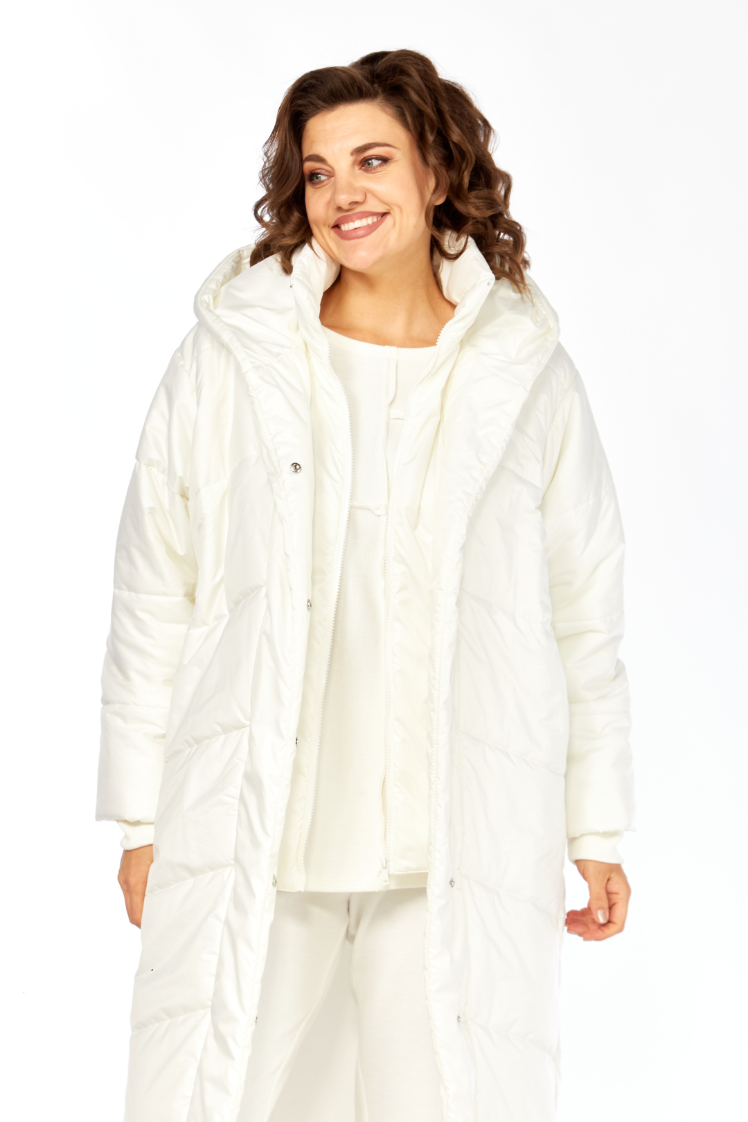 Пальто женское утепленное (длиной до щиколотки). Спинка с горизонтальной стежкой. Боковые швы смещены на перед. Полочки выстеганы по косой. Боковые карманы обработаны в швах. Рукав втачной, одношовный с трикотажными манжетами из-под подгибки. Паьлто с притачной манишкой, которая с воротником-стойкой и на "молнии". Капюшон соединен с планкой, которая застегивается на кнопки сверху до низа изделия. Температурный режим до -10 градусов. Длина по спинке 128 см, длина рукава 60+5 см.