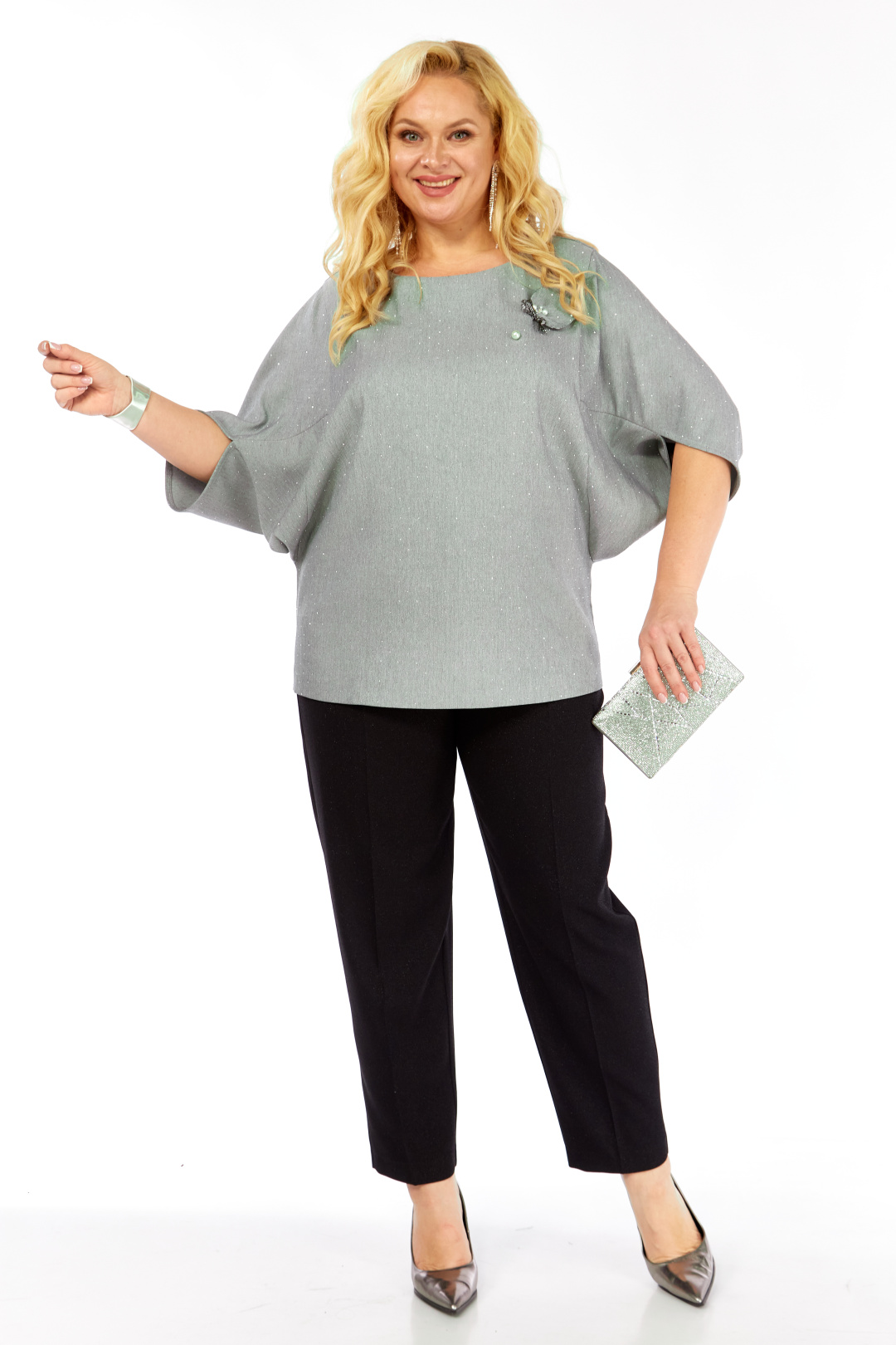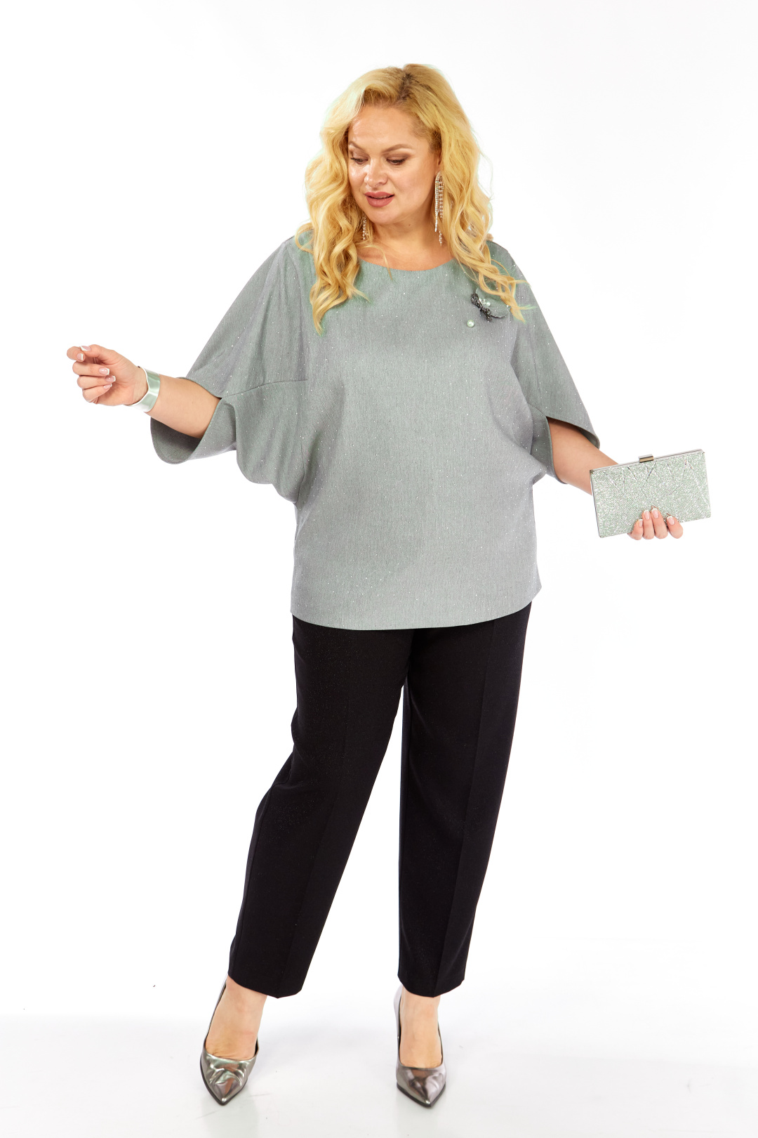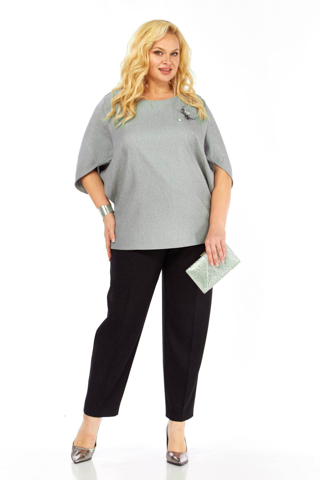 Комплект 2-ух предметный, состоит из блузки и брюк. Уникальная блуза, сочетает в себе изысканный дизайн и комфорт. Прекрасно подойдет для праздничных мероприятий. Блуза полуприлегающего кроя из ткани на поверхности которой присутствует легкое элегантное мерцание кристаллов. Горловина аккуратной округлой формы. Эффектные рукава с фантазийным решением — усиливают модный акцент и придают дополнительный шарм. Декоративным элементом является съемная дизайнерская брошь. Брюки слегка зауженные к низу. Пояс притачной, частично на резинке. Застежка спереди на тесьму-молнию, петлю-пуговицу.