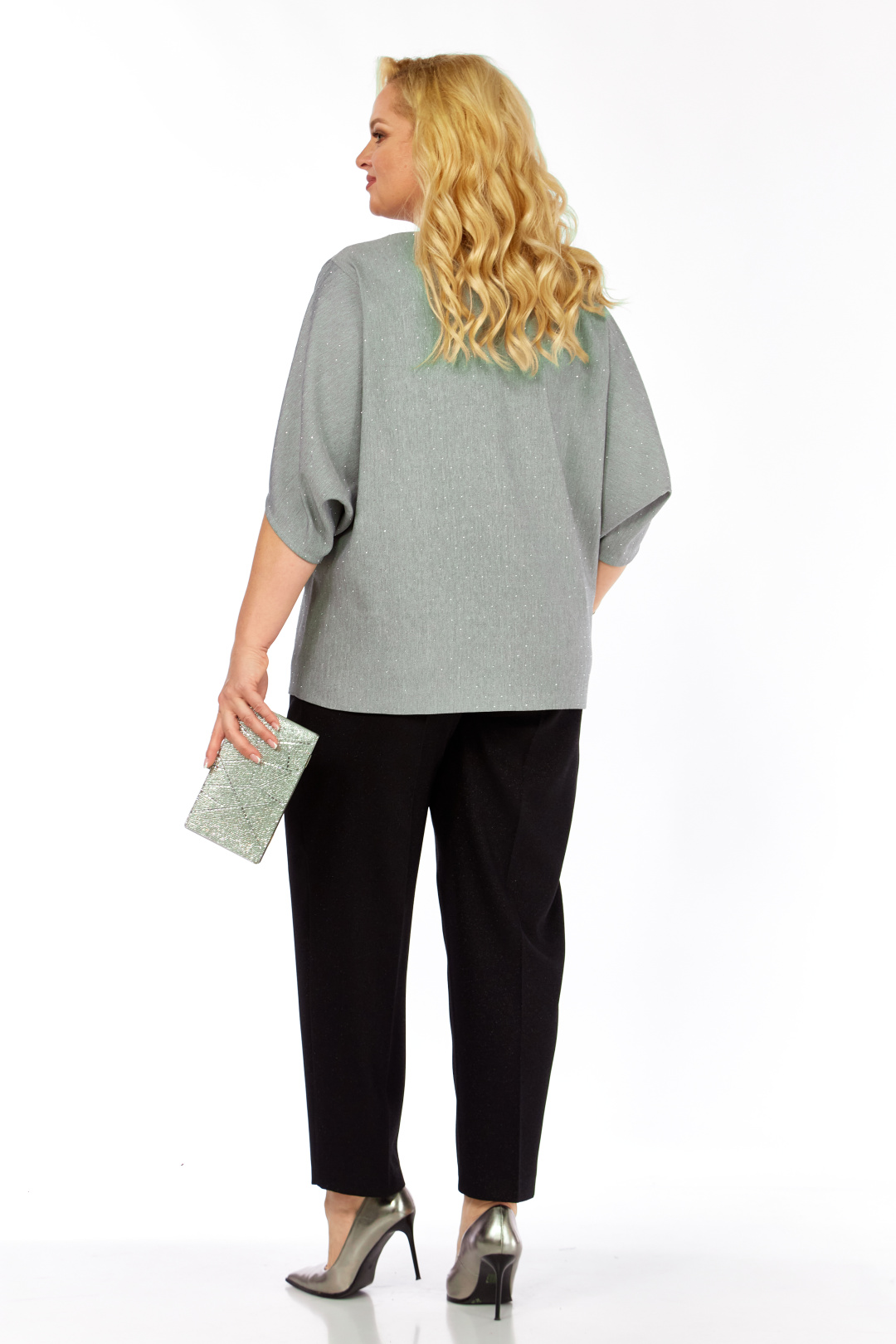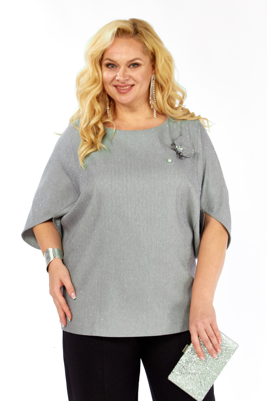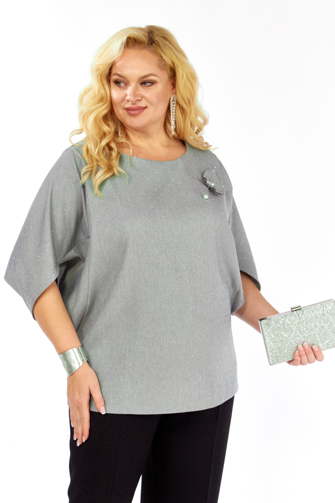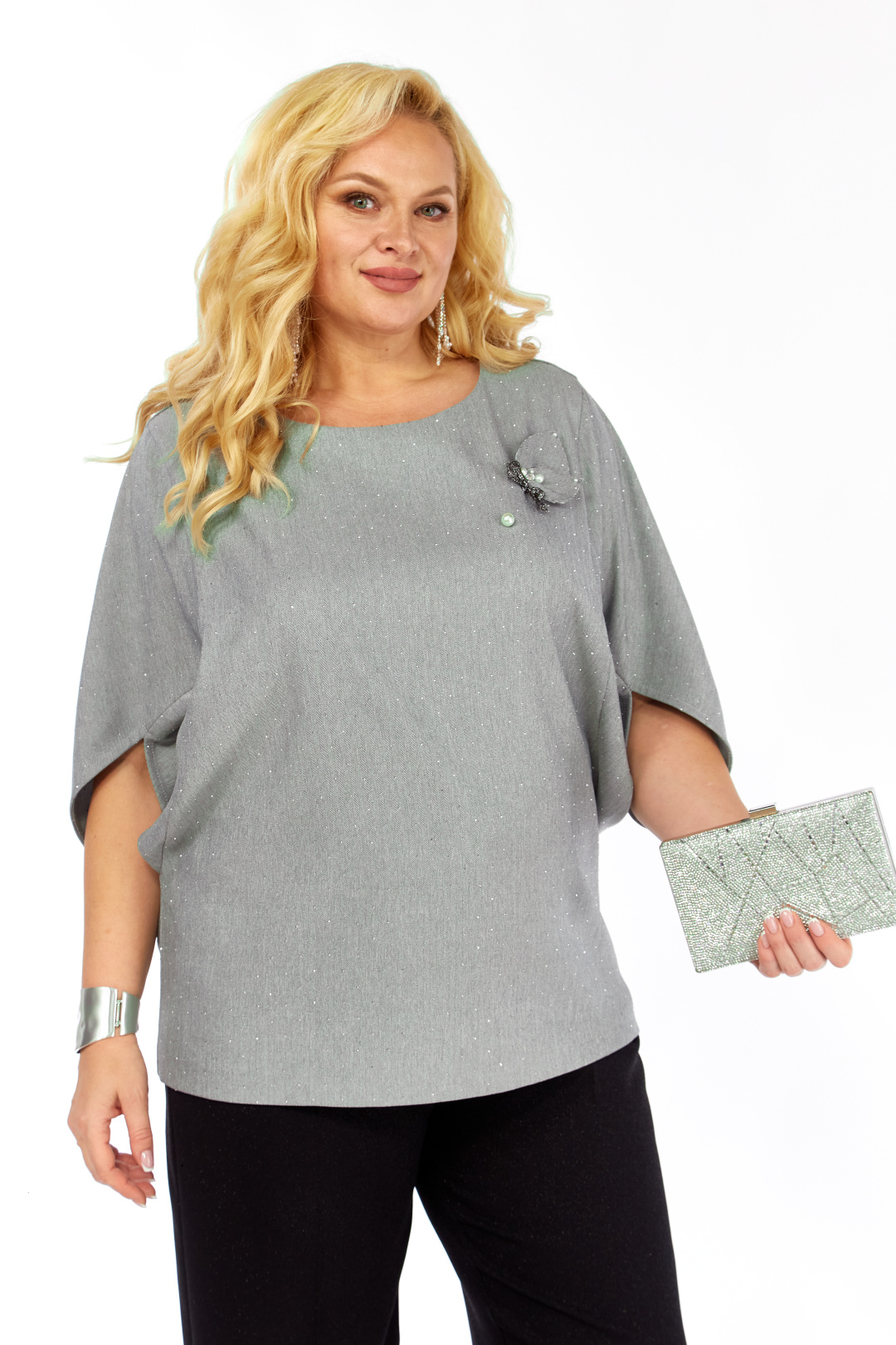 Комплект 2-ух предметный, состоит из блузки и брюк. Уникальная блуза, сочетает в себе изысканный дизайн и комфорт. Прекрасно подойдет для праздничных мероприятий. Блуза полуприлегающего кроя из ткани на поверхности которой присутствует легкое элегантное мерцание кристаллов. Горловина аккуратной округлой формы. Эффектные рукава с фантазийным решением — усиливают модный акцент и придают дополнительный шарм. Декоративным элементом является съемная дизайнерская брошь. Брюки слегка зауженные к низу. Пояс притачной, частично на резинке. Застежка спереди на тесьму-молнию, петлю-пуговицу.