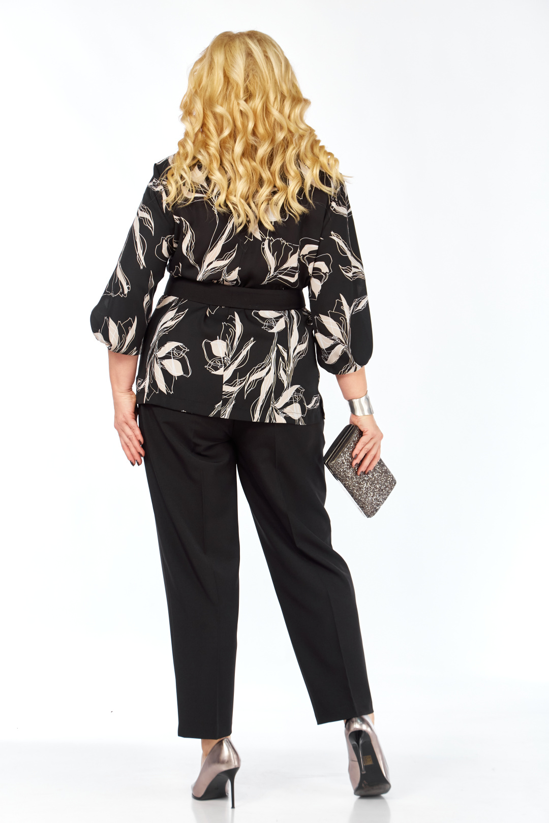 Комплект женский брючный 2-х предметный. Блузка прямого силуэта выполнена из струящейся принтованной ткани, выглядит эффектно, создает современный стиль образу. Горловина аккуратной округлой формы. Рукав втачной, свободный с фантазийным решением, длина 7/8. В комплект входит пояс, низ обработан металлической бахромой, что служит элементом украшения. Средний шов спинки вверху переходит в застежку на 6 навесных петель, пуговиц. В боковых швах предусмотрены разрезы. Брюки классические, слегка зауженные к низу, на притачном поясе, застежка на тесьму-молнию и одну петлю, пуговицу.