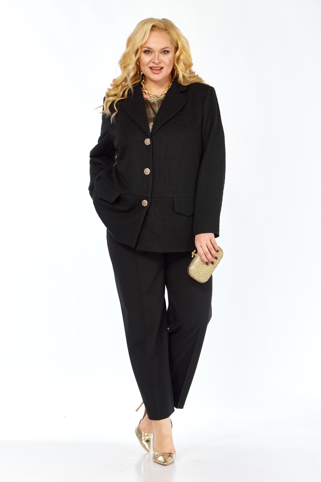 Брючный комплект предназначен для элегантных женщин, прекрасно подойдет на торжественные мероприятия. Выполнен из трикотажного полотна в стиле Шанель, состоит из жакета, блузки и брюк. Стильный классический жакет, прекрасный вариант на каждый день. Модель прямого силуэта с центральной бортовой застежкой на петли-пуговицы и с фигурным клапаном. Низ изделия обработан отрезной деталью, спинка со средним швом, переходящим в шлицу с оформлением декоративными пуговицами. Рукав втачной, полной длины. Жакет частично на подкладке (полочки и спинка). Блуза выполнена из эффектной ткани, легкое мерцание добавит притягательности Вашему образу. Блуза прямого силуэта с нагрудными вытачками, спущенной линией плеча. Низ ассиметричный в боковых швах имеются разрезы. Брюки классические, слегка зауженные к низу, на притачном поясе, застежка на тесьму-молнию и одну петлю, пуговицу.