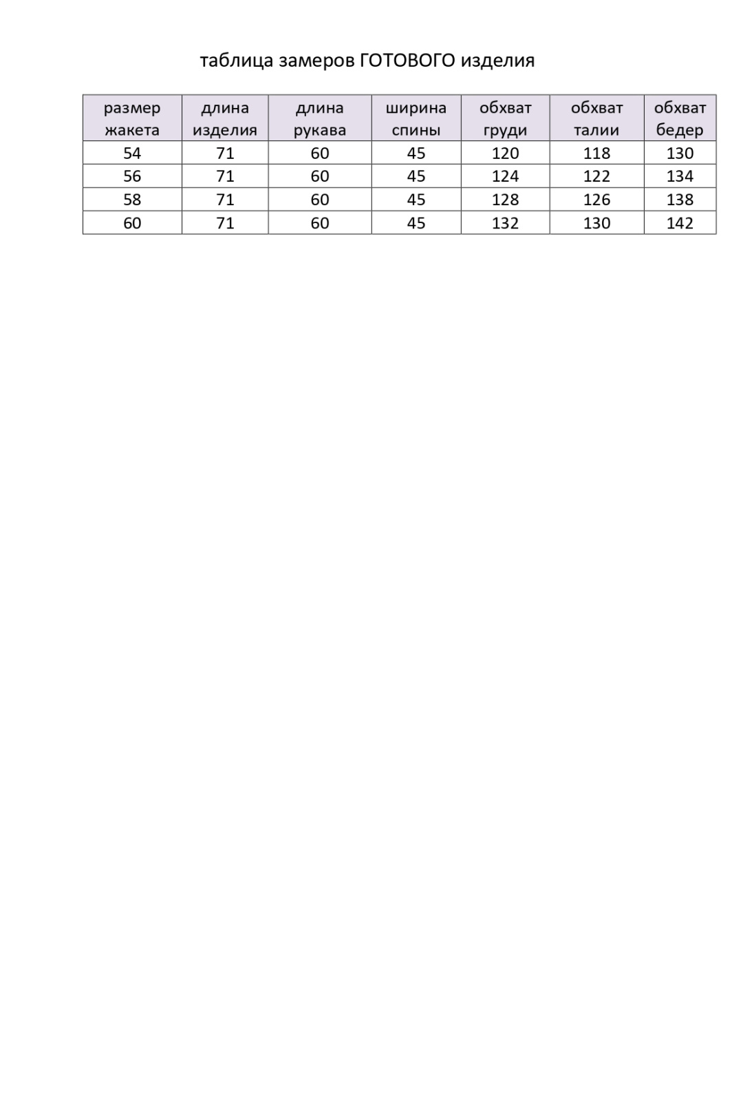 длина изделиядлина рукаваширина спиныобхват грудиобхват талииобхват бедер