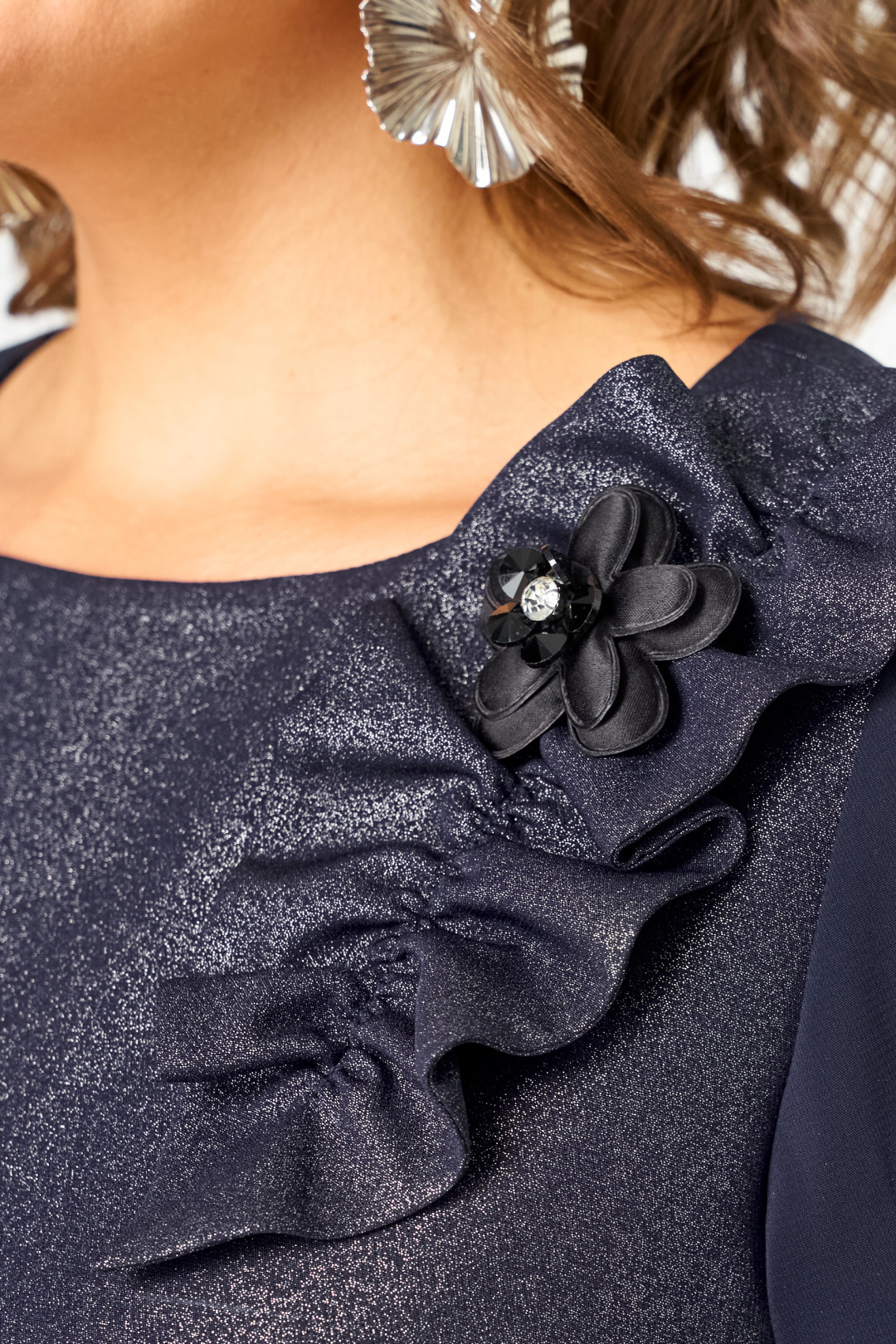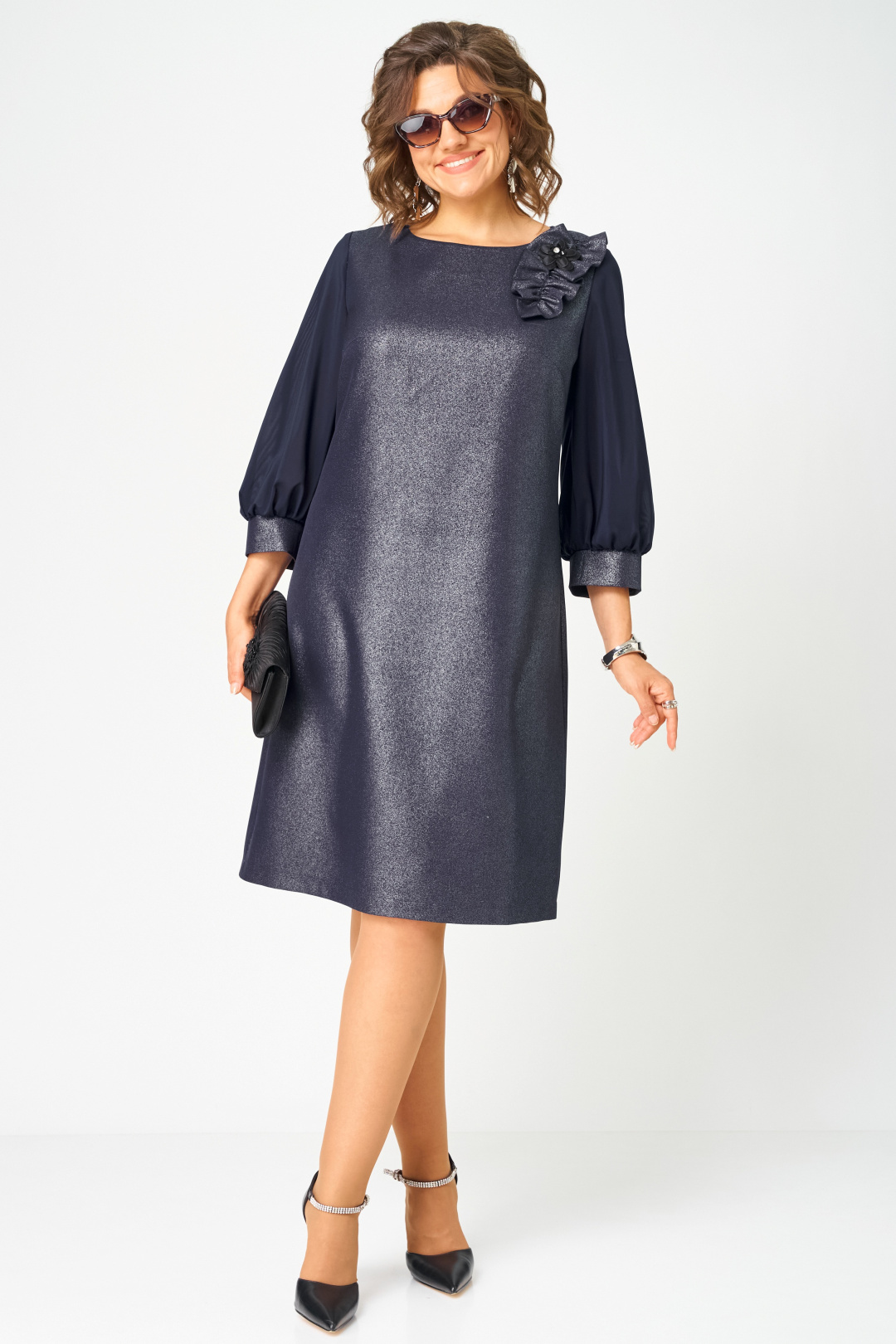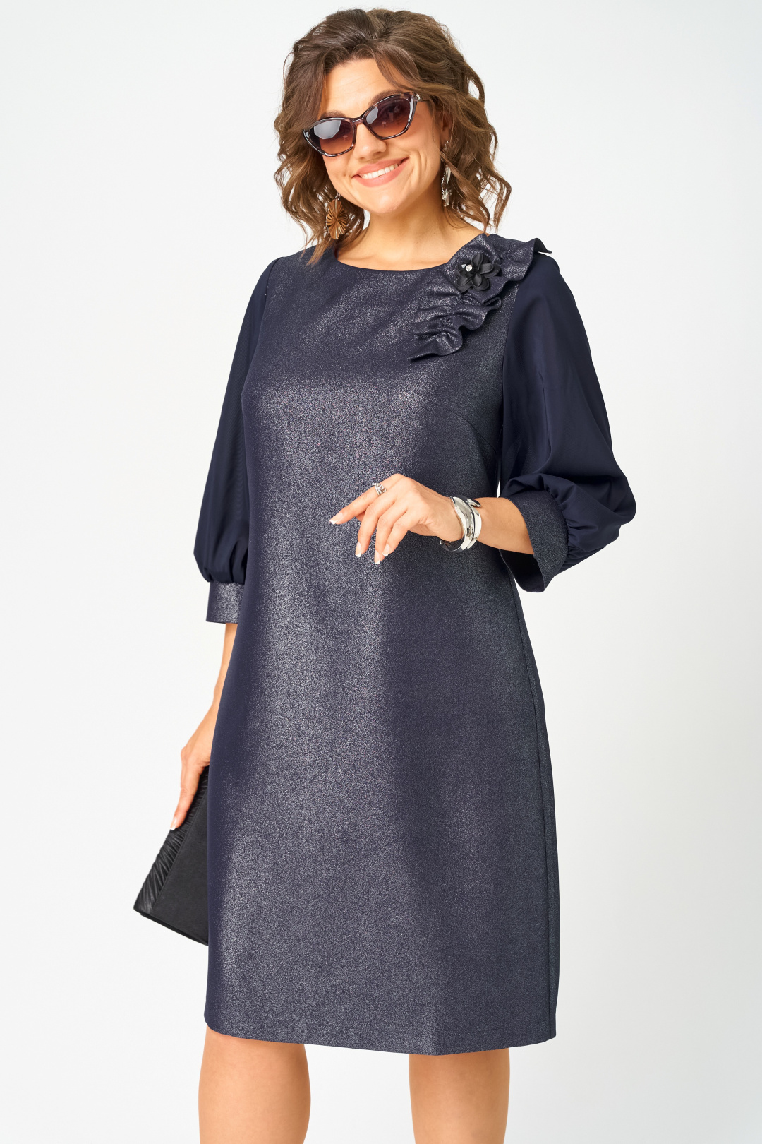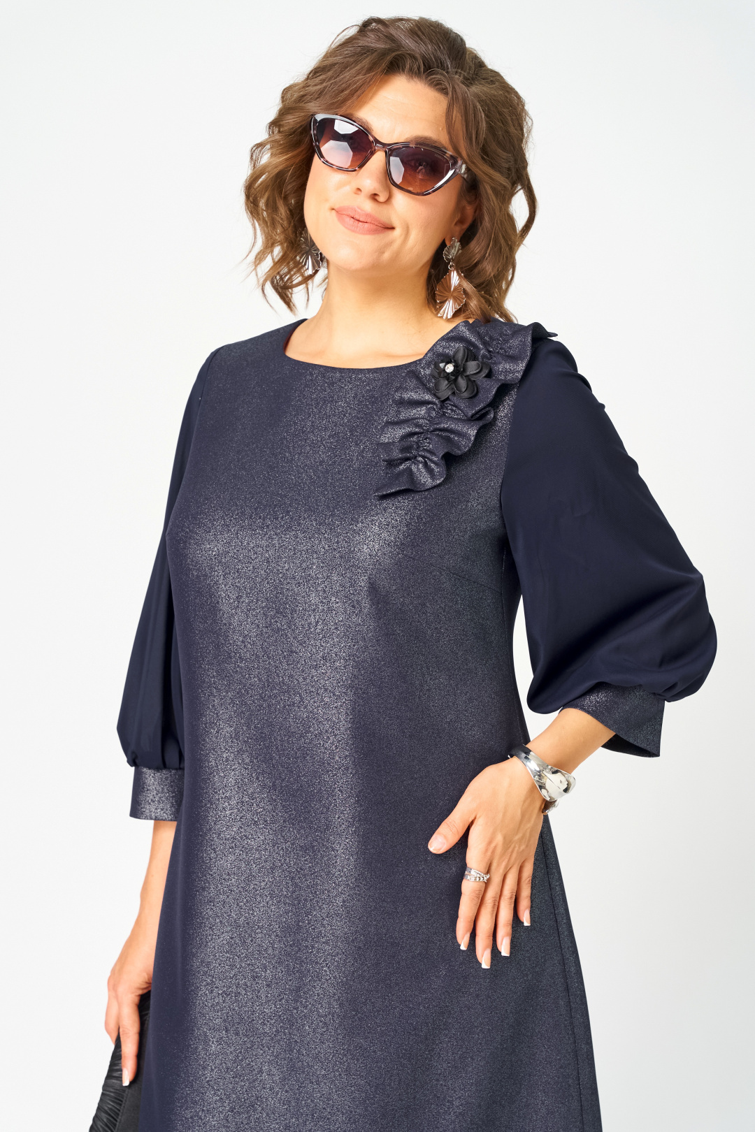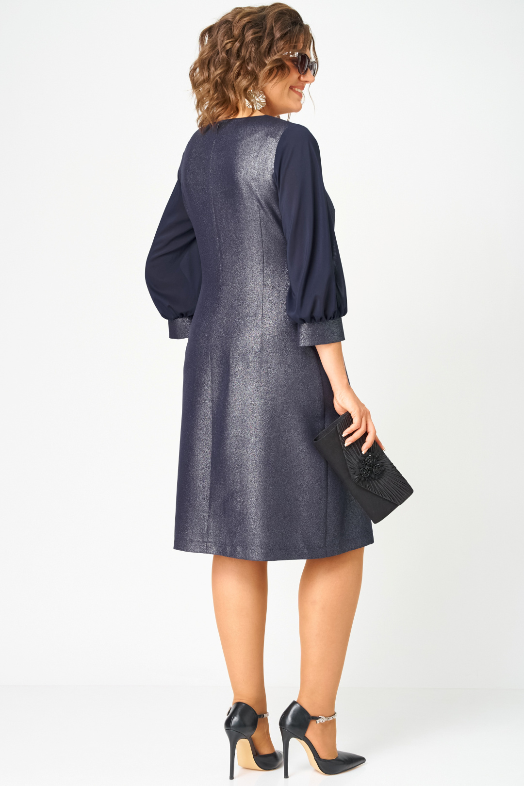 Платье женское полуприлегающего силуэта выполнено из плательной ткани с мерцающим пропитанным блеском (не сыпется) в сочетании с шифоном. Вырез горловины круглый на обтачке, по полочке нагрудные втачки, рукав втачной из шифона 7/8 по низу на сборке и притачной манжете. По спинке потайная тесьма - молния и вытачки.Декором платья служит декоративный пришивной элемент со съемной брошью.