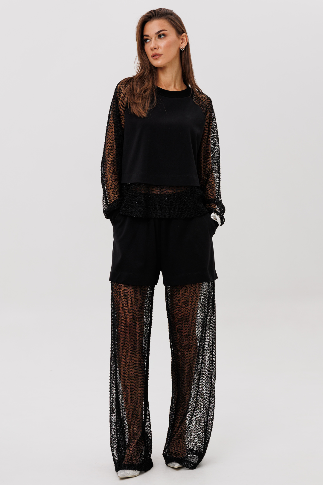 Современный брючный комплект, который создаёт эффект многослойности и лёгкого сияния. Джемпер выполнен из мягкого, комфортного вискозного полотна с нейлоном и дополнен воздушными рукавами из мерцающей сетки с россыпью микропайетки. Брюки на удобном эластичном поясе имеют прозрачную нижнюю часть в тон — подвижную, блестящую и подчёркивающую силуэт. Стильное решение для тех, кто ценит тренды и оригинальное звучание образа.