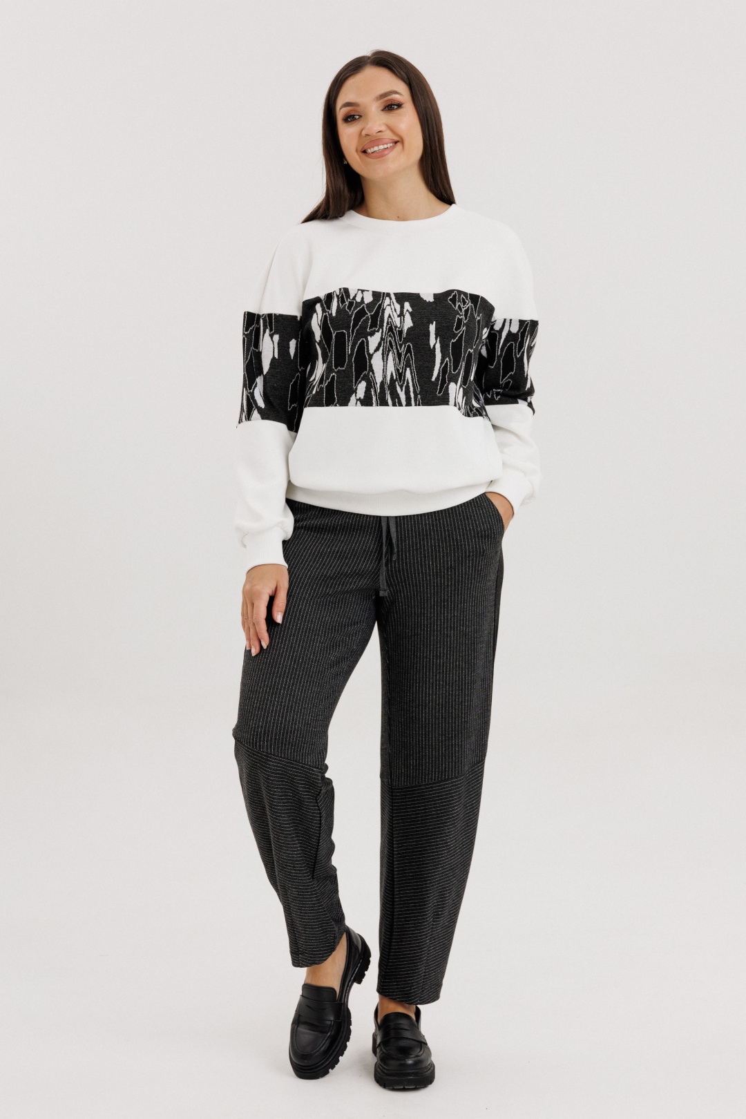 Свитшот украшен эффектным контрастным принтом в чёрно-белой гамме, придающим образу динамику и современное звучание. Брюки со средней посадкой и лёгким заужением к низу обеспечивают свободу движений и идеально сидят по фигуре.