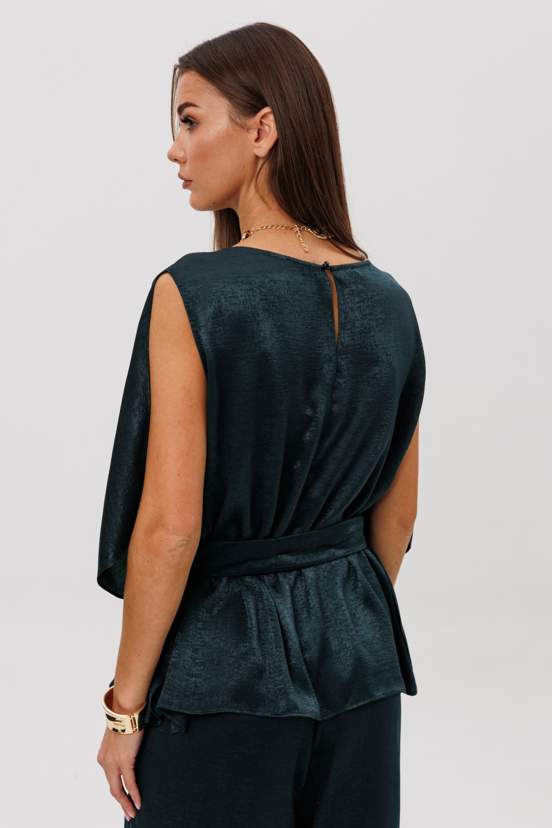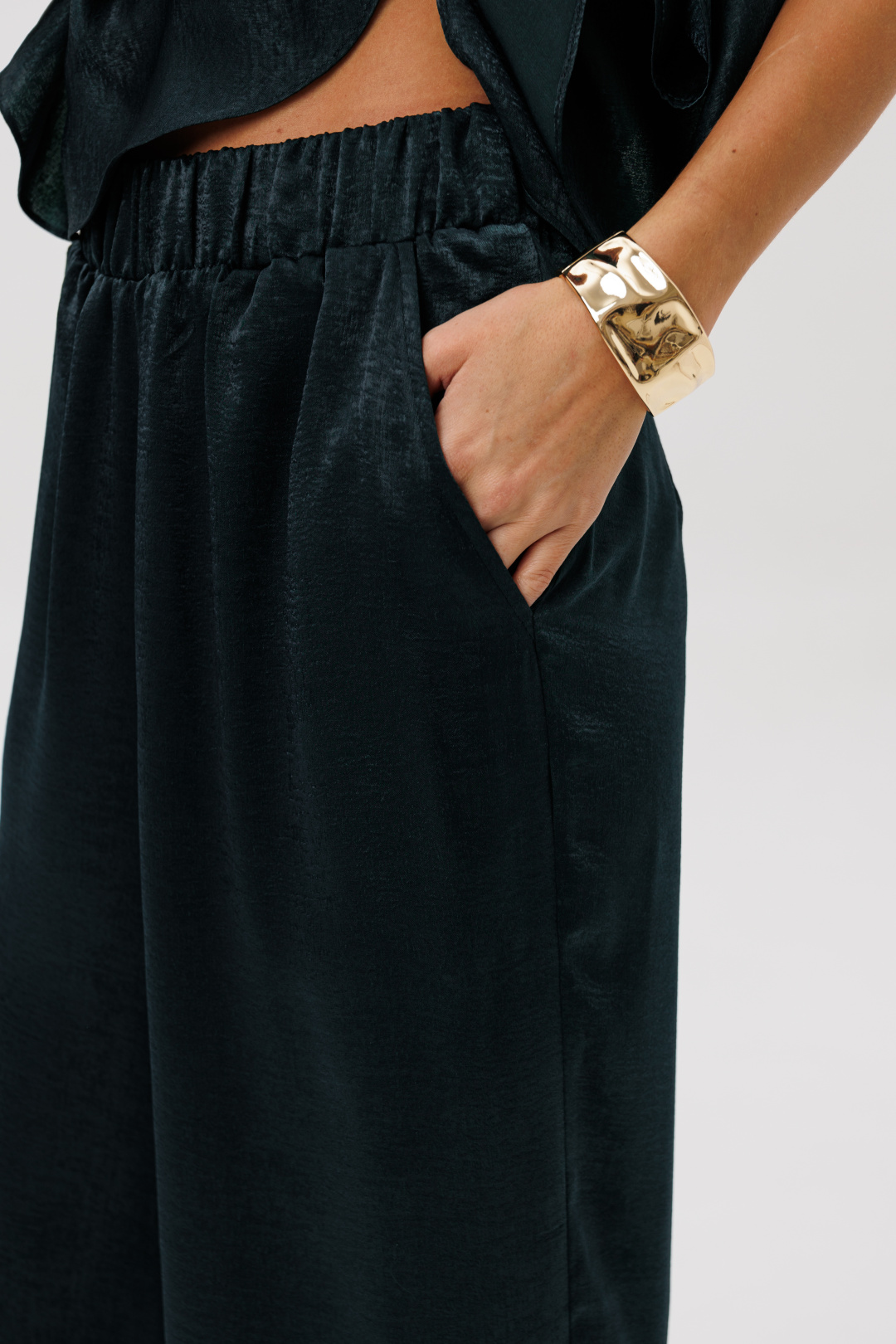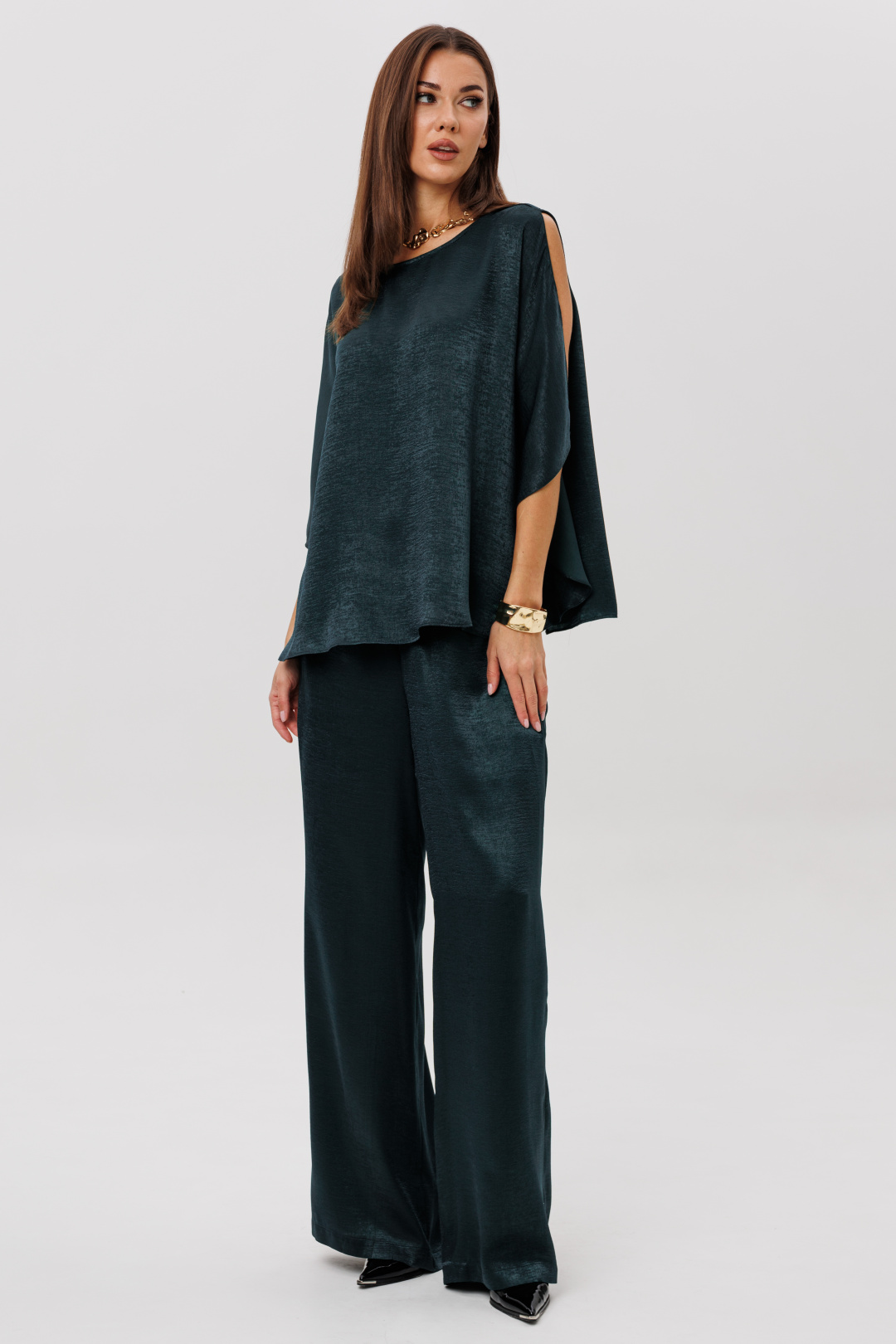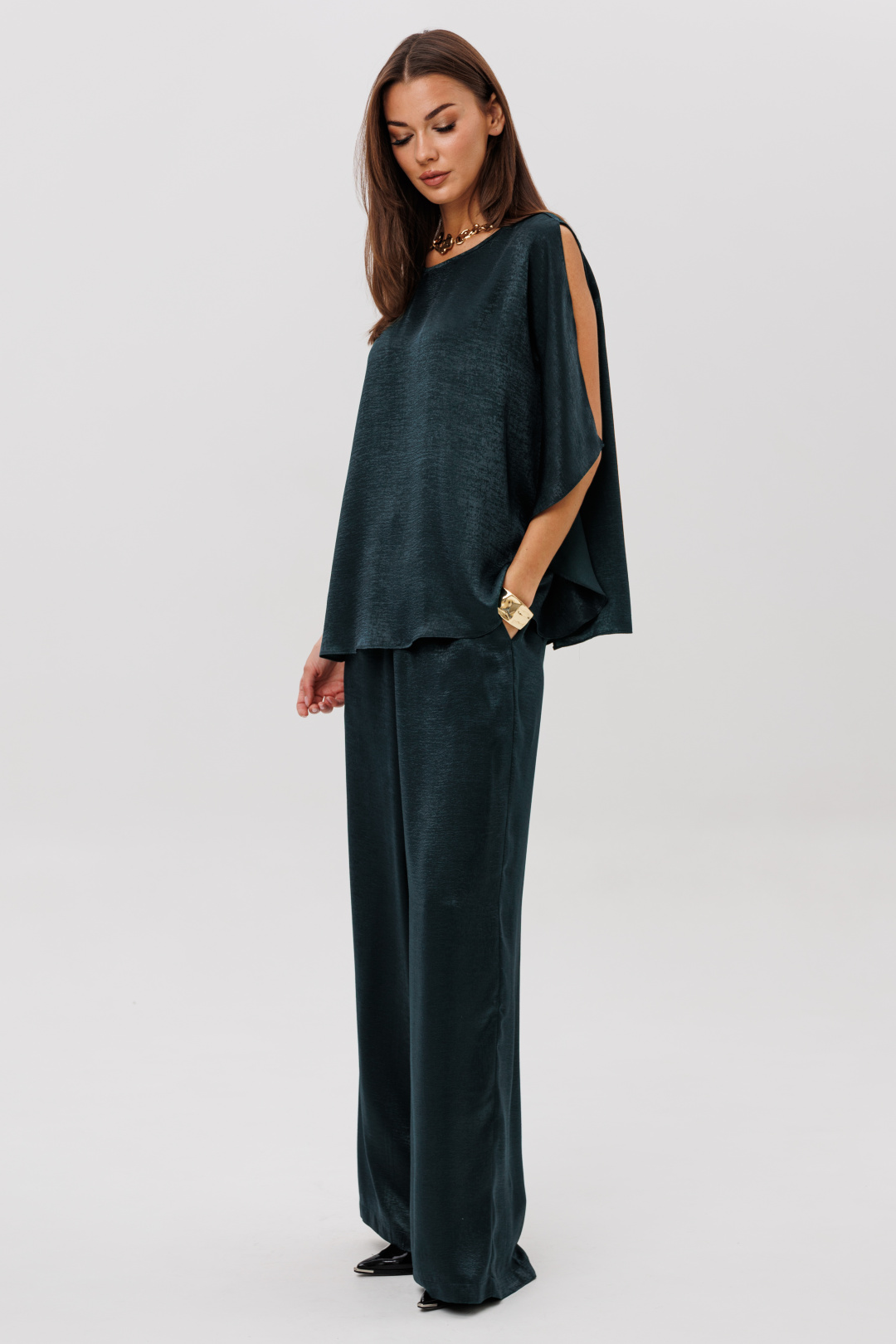 Роскошный брючный комплект из высококачественного атласа — это готовый образ для особых случаев и стильных выходов. Свободная блуза красиво драпируется, мягко играет на свету и позволяет носить её как в расслабленном варианте, так и подчёркивая талию поясом. Широкие брюки на комфортной резинке создают эффект удлинённых ног и дарят полную свободу движений. Современная элегантность, которая всегда смотрится дорого.