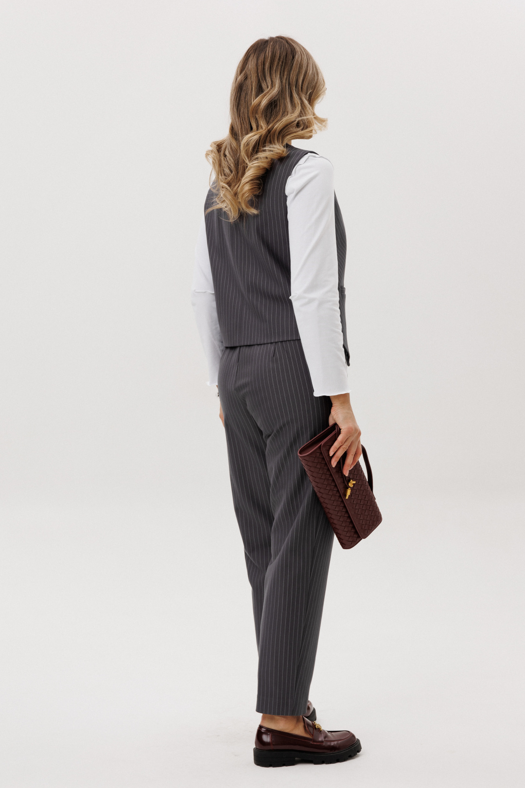 Модель выполнена из плотной трикотажной ткани с тонкой вертикальной полоской, которая визуально вытягивает силуэт и подчёркивает стройность. Жилет без рукавов застёгивается на декоративные пуговицы, создавая выразительный акцент в образе. Брюки классические, прямые. Джемпер трикотажный, с длинным рукавом, полуприлегающего силуэта.