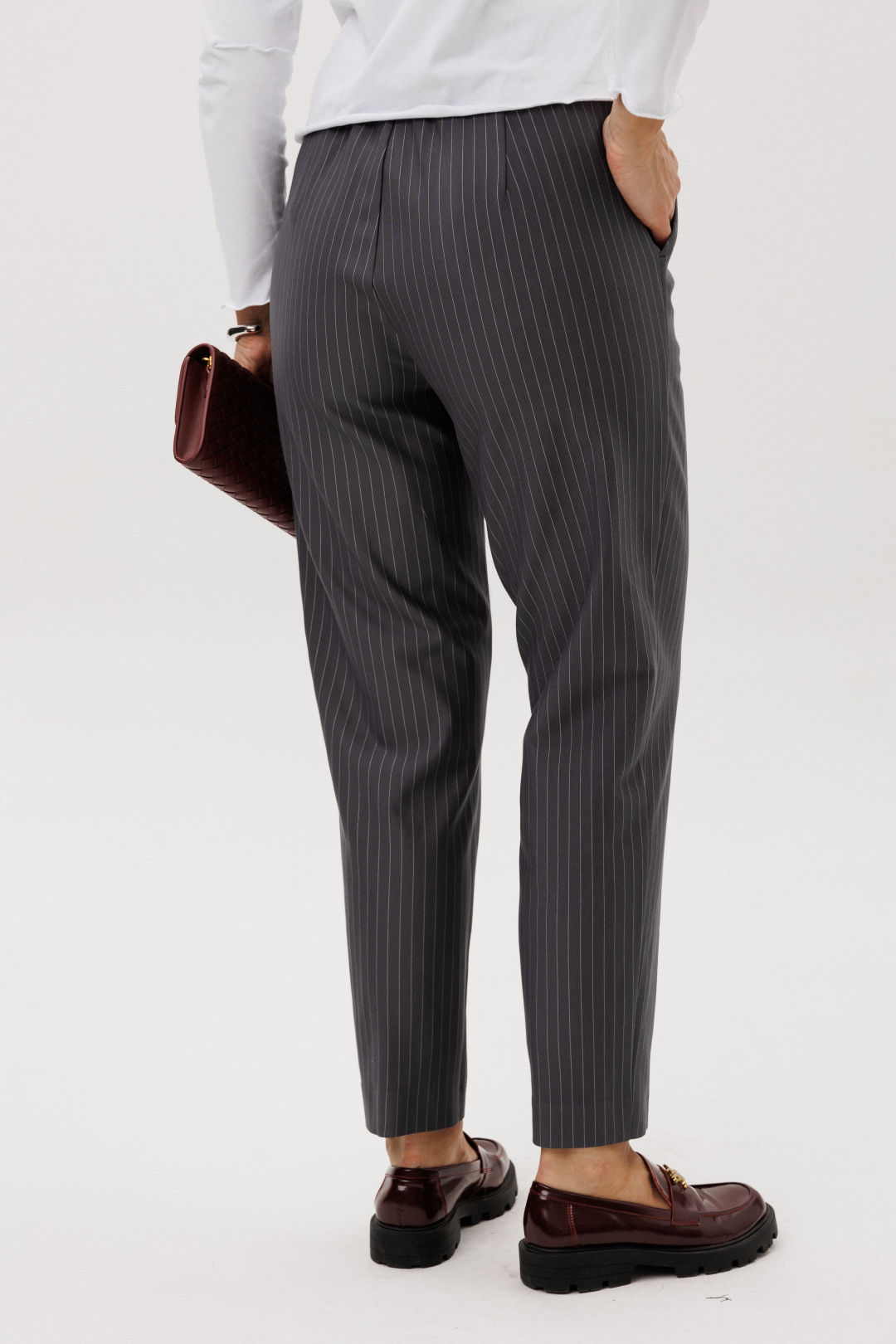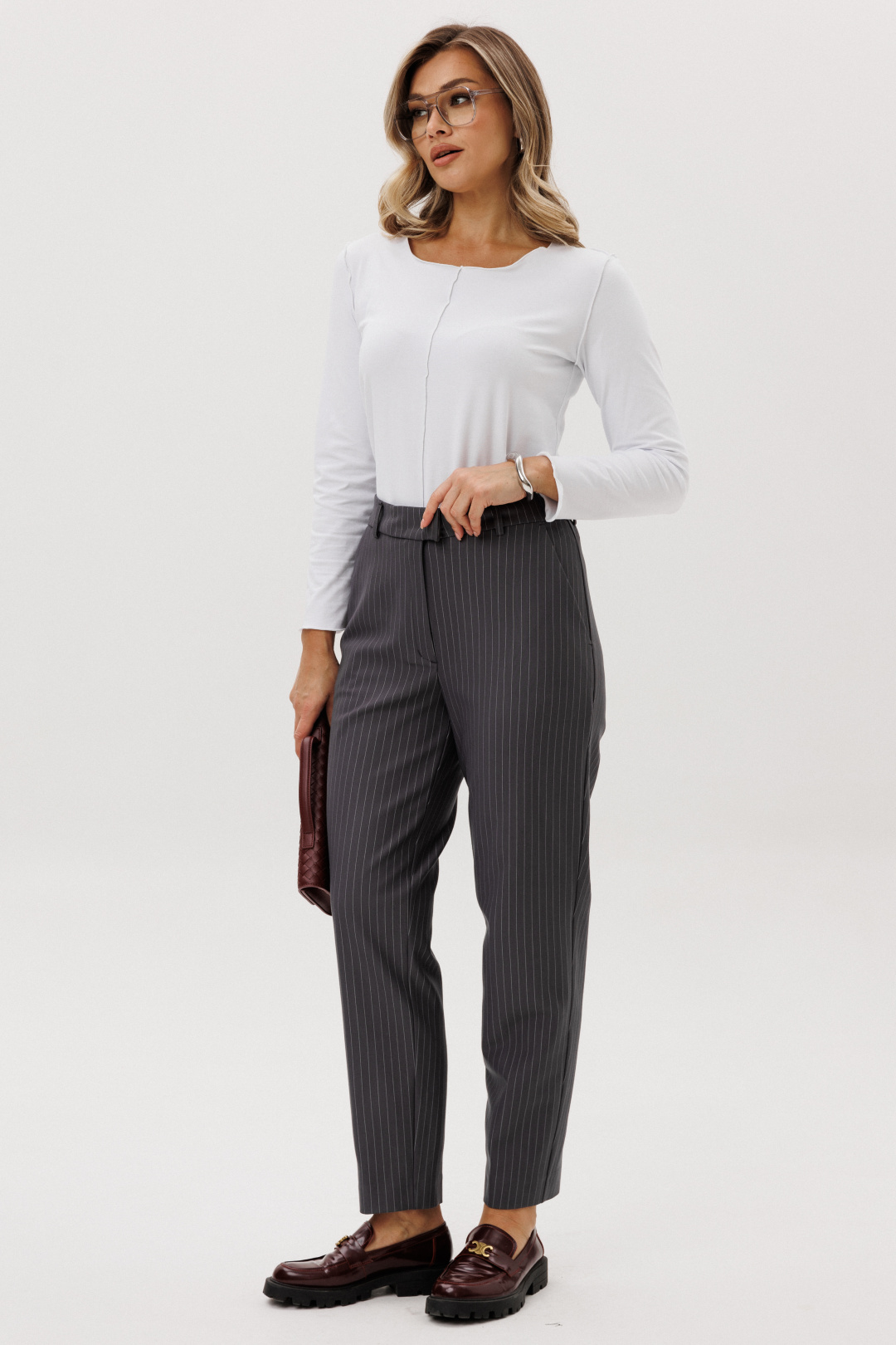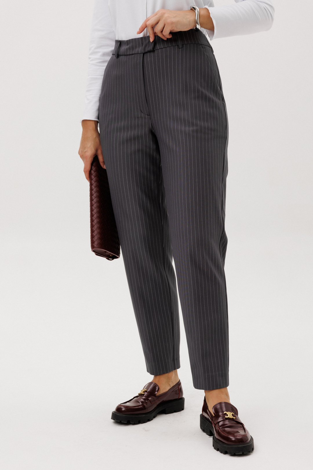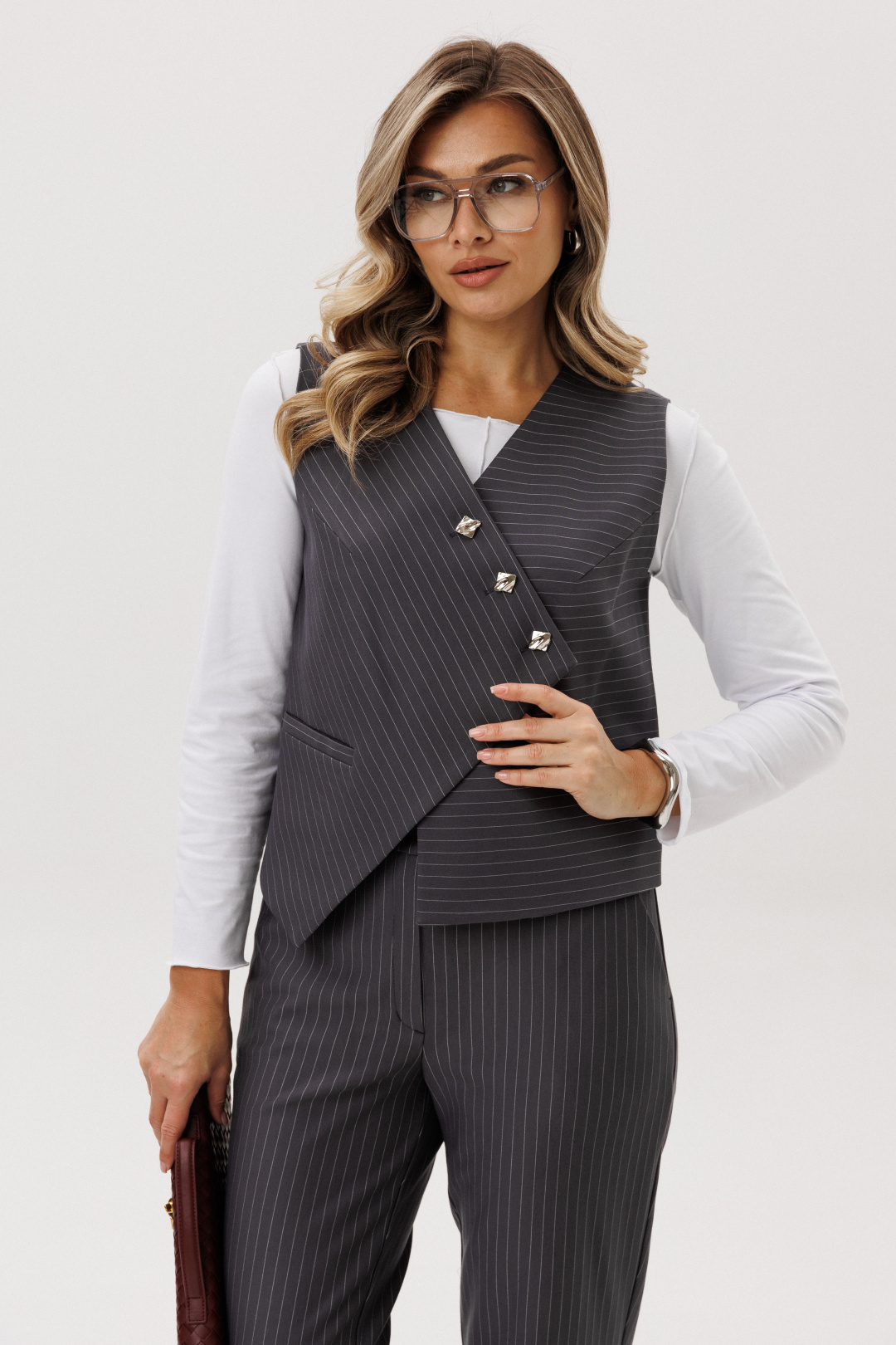 Стильный женский костюм в полоску — идеальное сочетание элегантности и современного минимализма. Комплект состоит из жилета оригинального кроя с асимметричной застёжкой, брюк и джемпера с длинным рукавом.