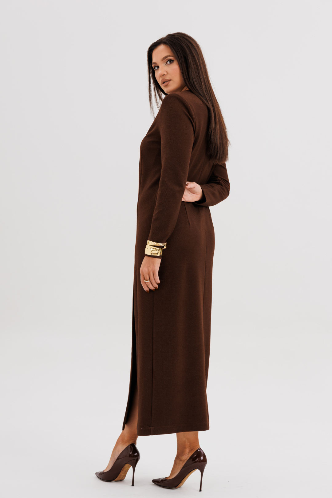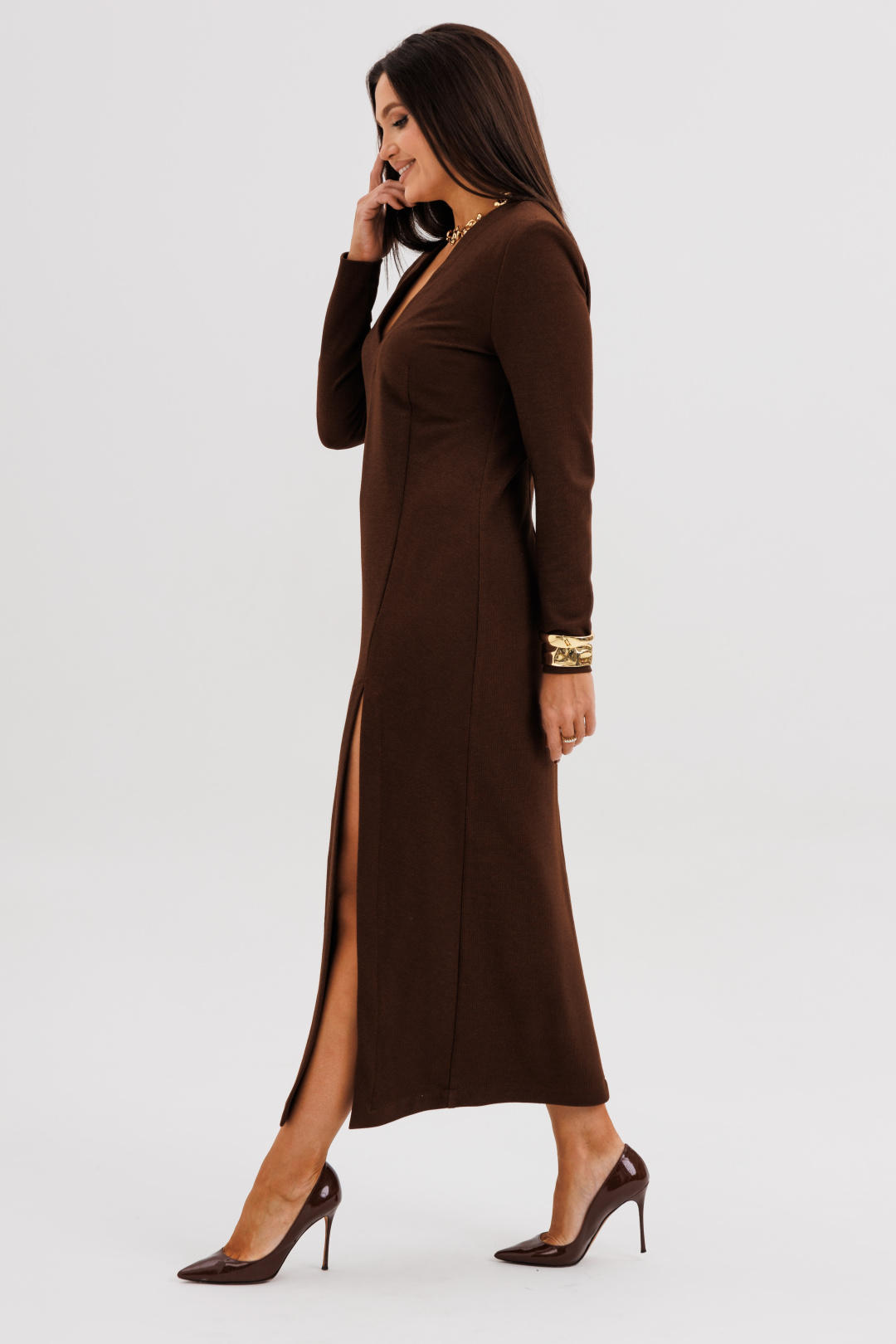 Шикарное платье из мягкого трикотажного полотна с едва заметным вкраплением люрекса — идеальное сочетание комфорта и элегантности. Втачной крой с лёгким прилеганием подчёркивает силуэт, а асимметричный рельеф визуально вытягивает фигуру, добавляя образу динамики. Глубокий V-вырез создаёт женственный акцент, а эффектный разрез спереди придаёт образу уверенность и утончённую привлекательность.