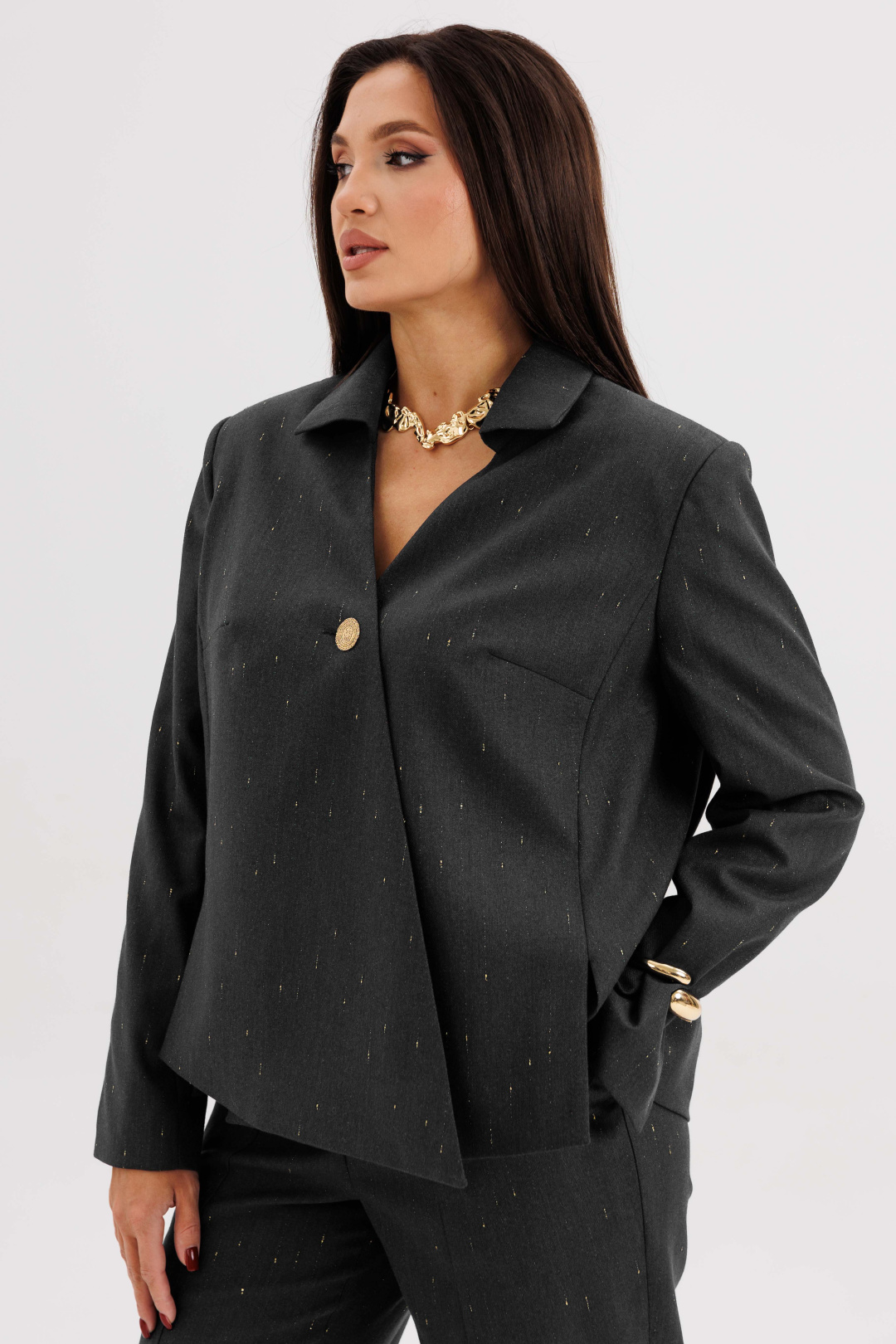 Жакет прямого силуэта выполнен с необычной асимметричной линией борта, которая добавляет образу индивидуальности и лёгкий дизайнерский акцент. Застёжка на крупные декоративные пуговицы придаёт образу выразительность.
