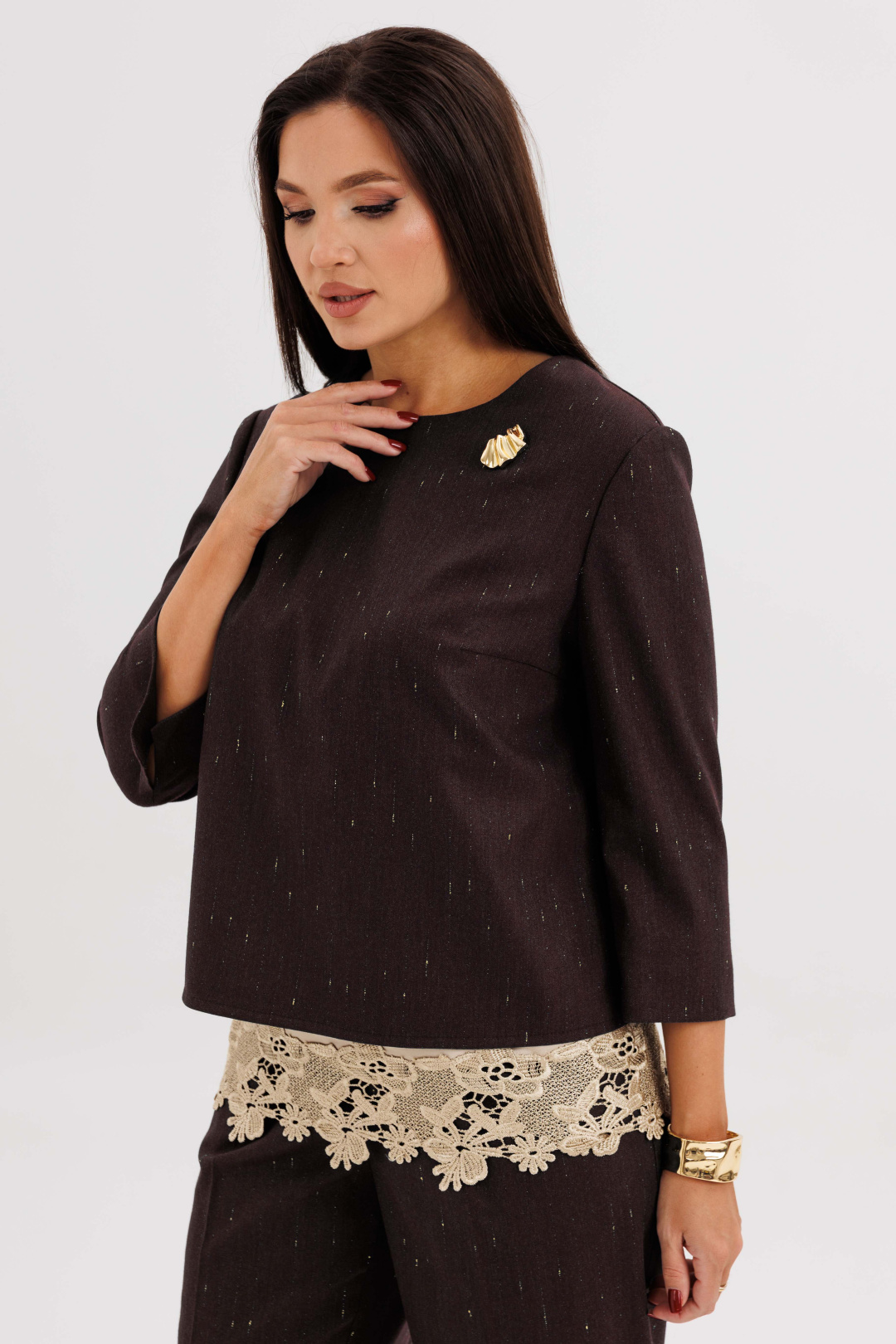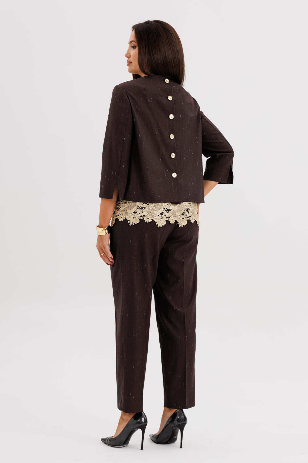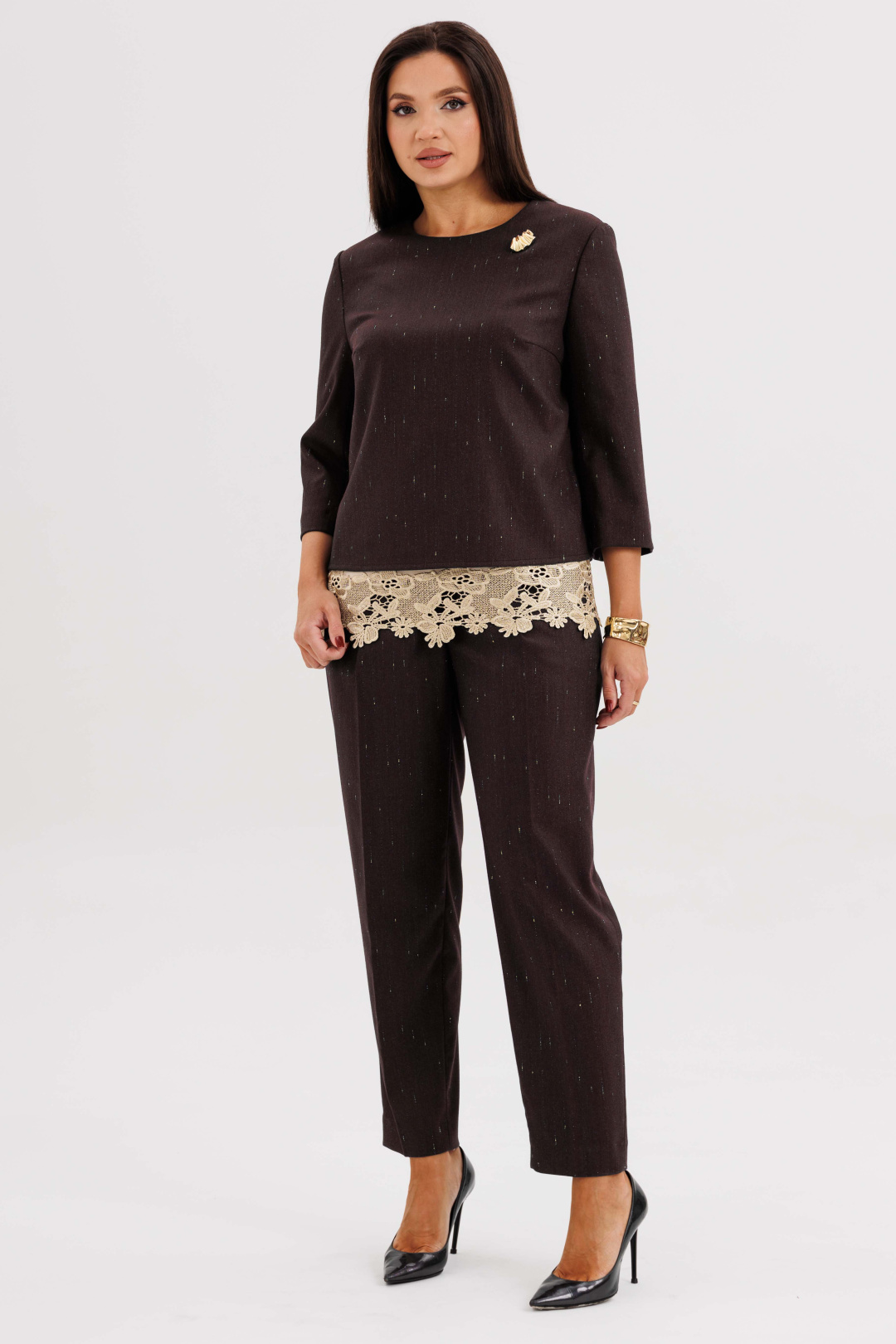 Главный акцент комплекта — нижний атласный топ с роскошной кружевной отделкой, создающий эффект многослойности и добавляющий наряду нотку романтичности. Верхняя блуза с рукавом ¾ лаконична и элегантна, а прямые брюки визуально вытягивают силуэт, делая образ стройнее и гармоничнее.