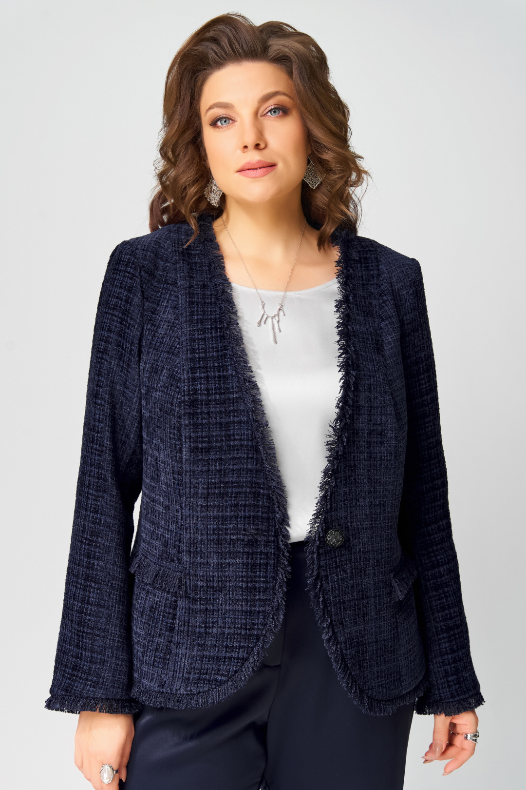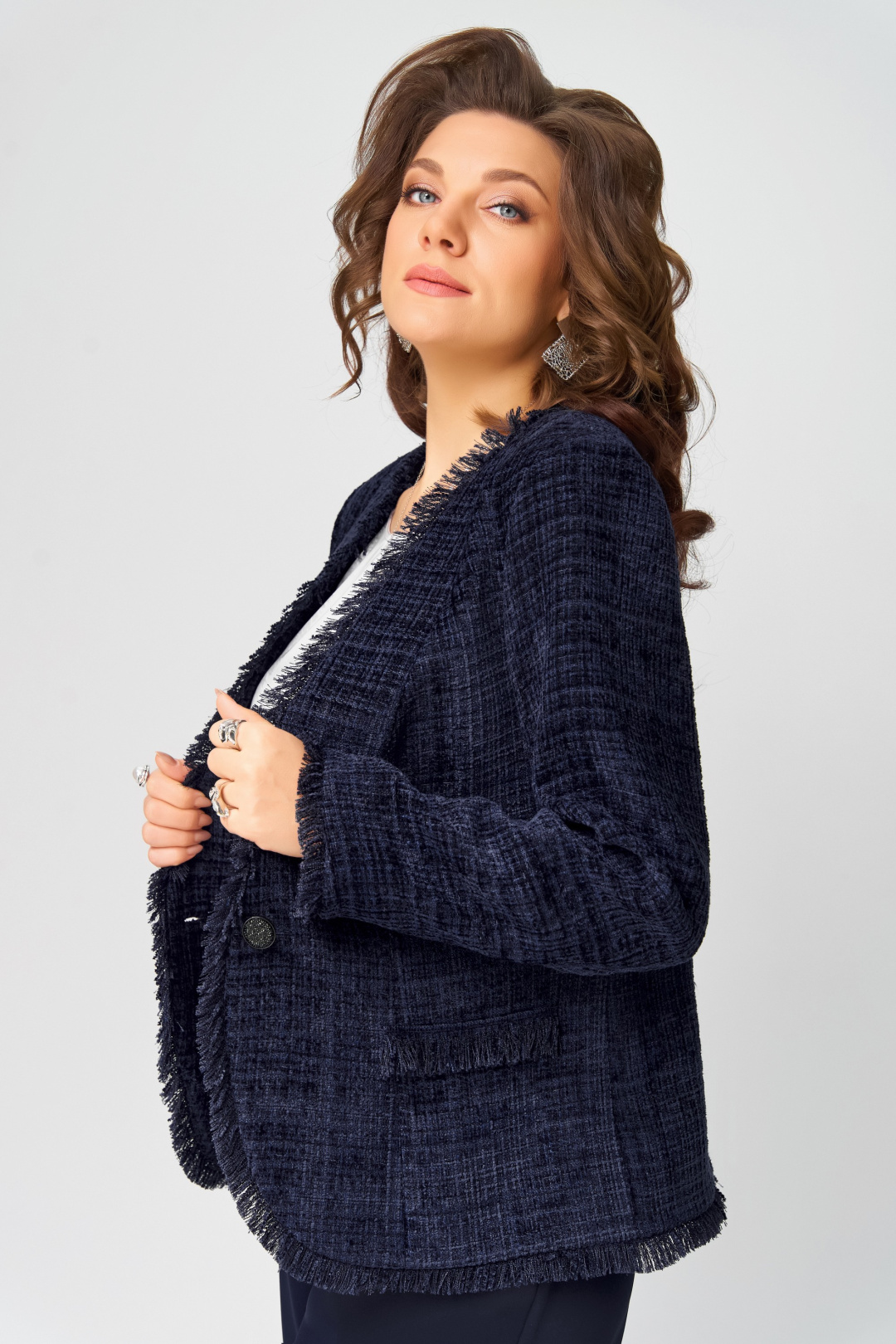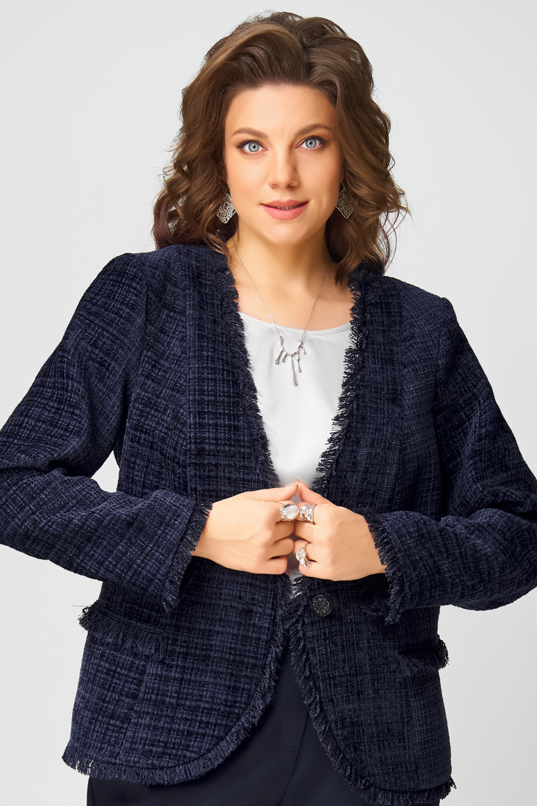 Жакет из твидовой ткани на подкладке, полуприлегающего силуэта. Однобортная застёжка на пуговицу, рельефные линии по полочке и спинке, декоративная трепка по борту, низу и рукавам создают фактурный акцент. Карман-обманка добавляет стильную деталь.