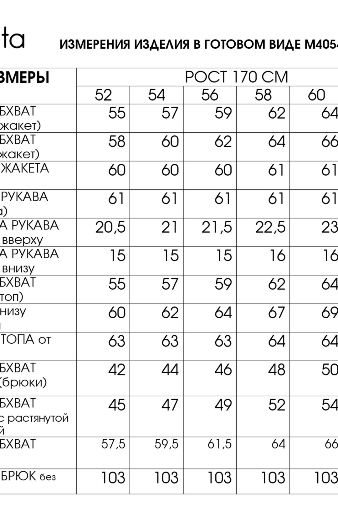Состав: жакет: 60% вискоза, 36% полиамид 4% спандекс; брюки: 70% полиэстер, 30% вискоза; блузка: 95% искусственный шелк, 5% спандекс