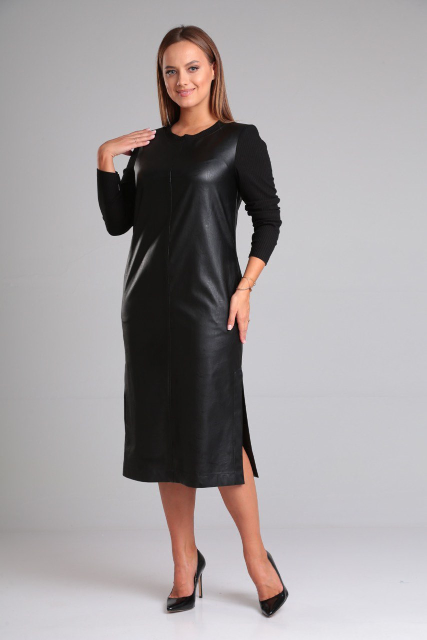 "Платье прямого силуэта из экокожи, комбинированной с трикотажными (""лапша"") рукавами и горловиной. Средний шов на полочке с вытачкой отстрочены отделочной строчкой. Декоративная функциональная молния в горловину спинки для удобства одевания. В боковых швах карманы и высокие разрезы. Изнанка экокожи на хлопковой основе." длина платья 114см, длина рукава 61см
