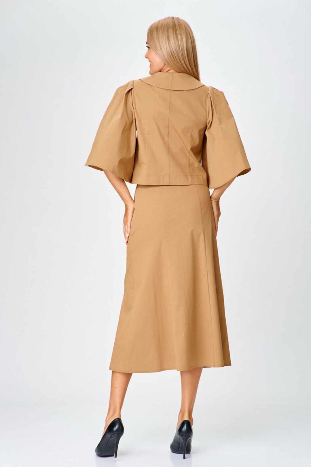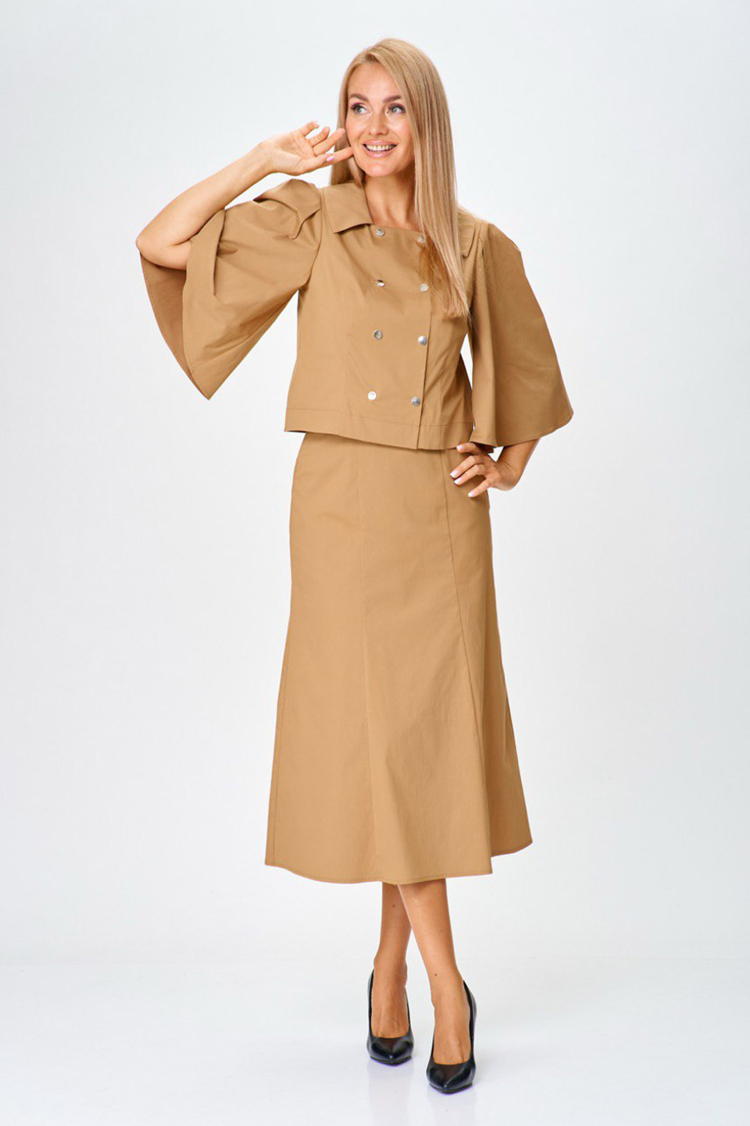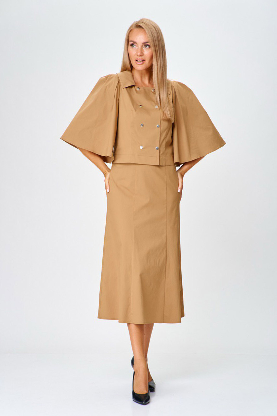 Комплект 2-х предметный. Жакет без подкладки, двухбортный с застежской на кнопке. Горловина оформлена плосколежащим воротником. Жакет прямого силуэта, на полочке с выточкой от низа под грудь. Главную роль в жакете играет втачной рукав, очень широкий, расклешонный со складками по окату. Спинка со средним швом и талиевыми вытачками. Юбка на подкладке, "шестиклинка" красивого расширенного к низу силуэта. Верх юбки оформлен притачным поясом, с застежкой на кнопку. Потайная молния в левом боковом шве.