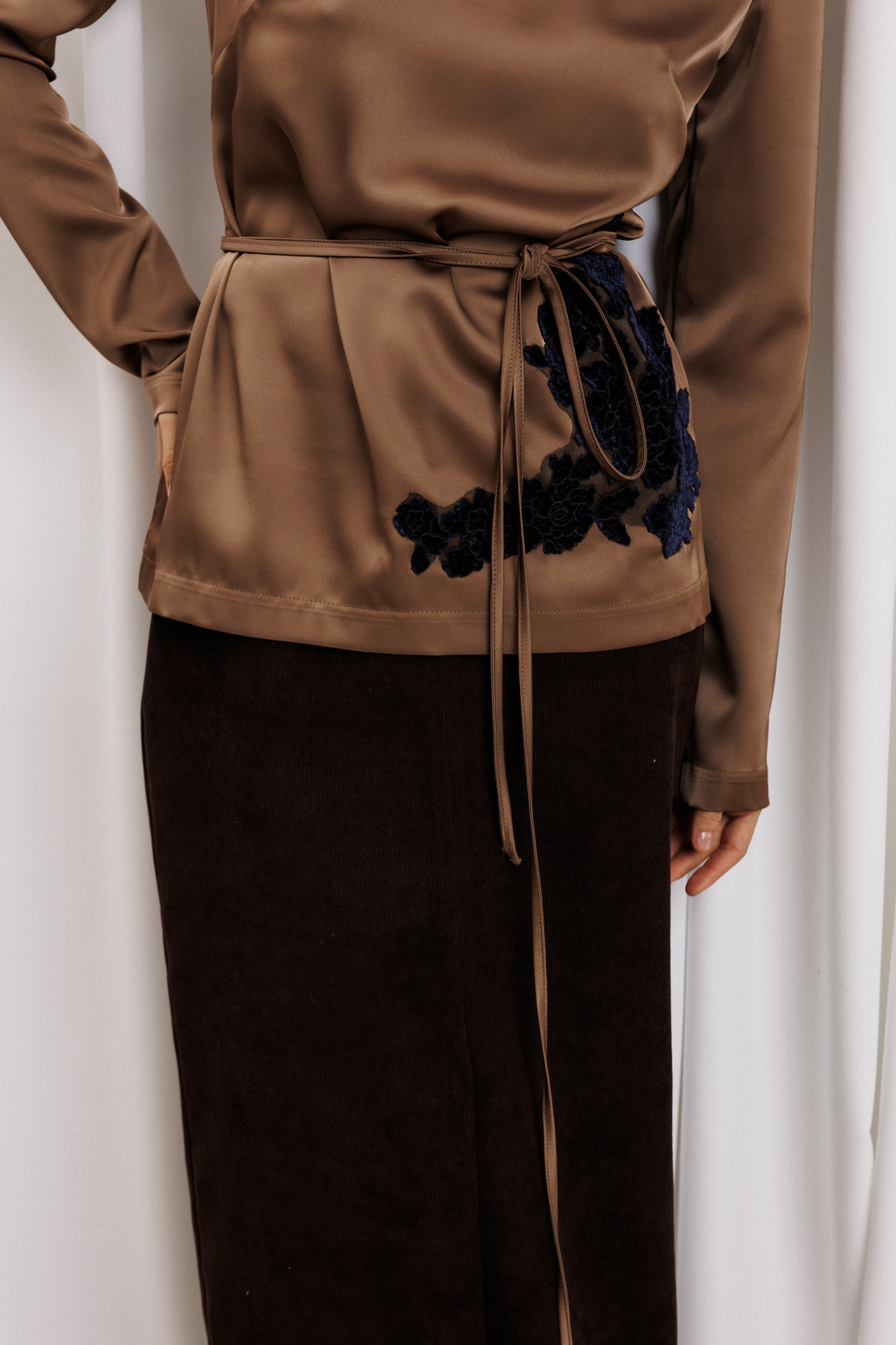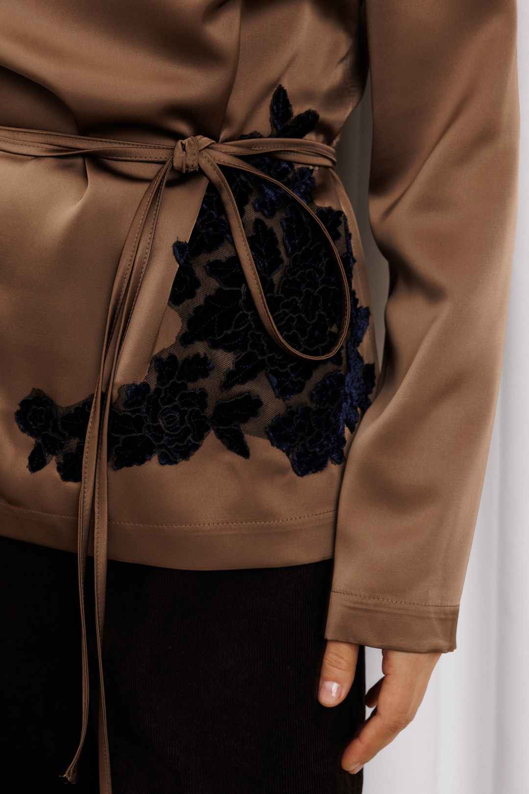 Блузка прямого силуэта выполнена из атласной ткани. Перед с нагрудной вытачкой. Спинка со средним швом и застежкой "капелькой" на петлю и пуговицу сверху. Рукав втачной одношовный. В боковых швах разрезы. По переду настрочена аппликация из велюровых цветов на сетке. К блузке прилагается пояс из основной ткани. Длина блузки - 63 см, длина рукава - 61 см. Изделие подходит на рост 164-170