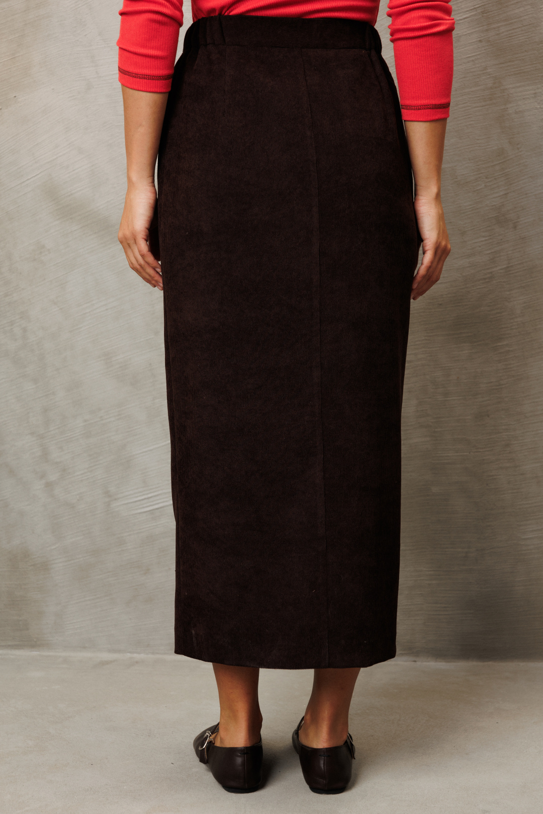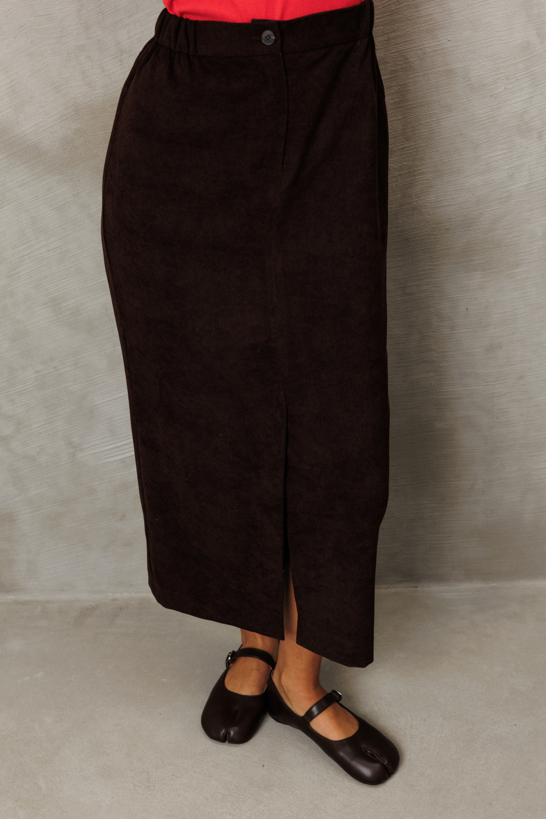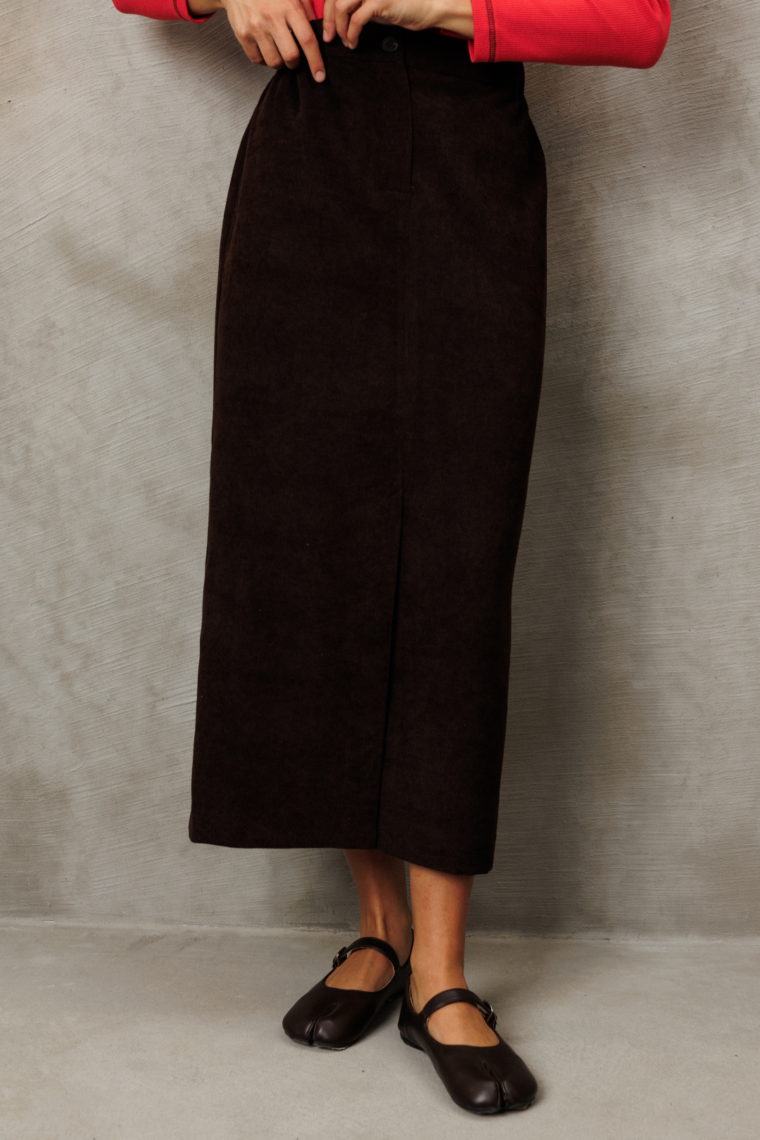 Юбка прямого силуэта выполненная из мягкой вельветовой ткани. Передняя честь юбки с вытачками, со средним швом и застежкой гульфиком на молнии и щлицей спереди. Задняя часть юбки с вытачками. Юбка на притачном поясе с затежкой на петлю и пуговицу спереди и резинками по бокам. Юбка на подкладке. Длина юбки с учетом пояса - 90 см.