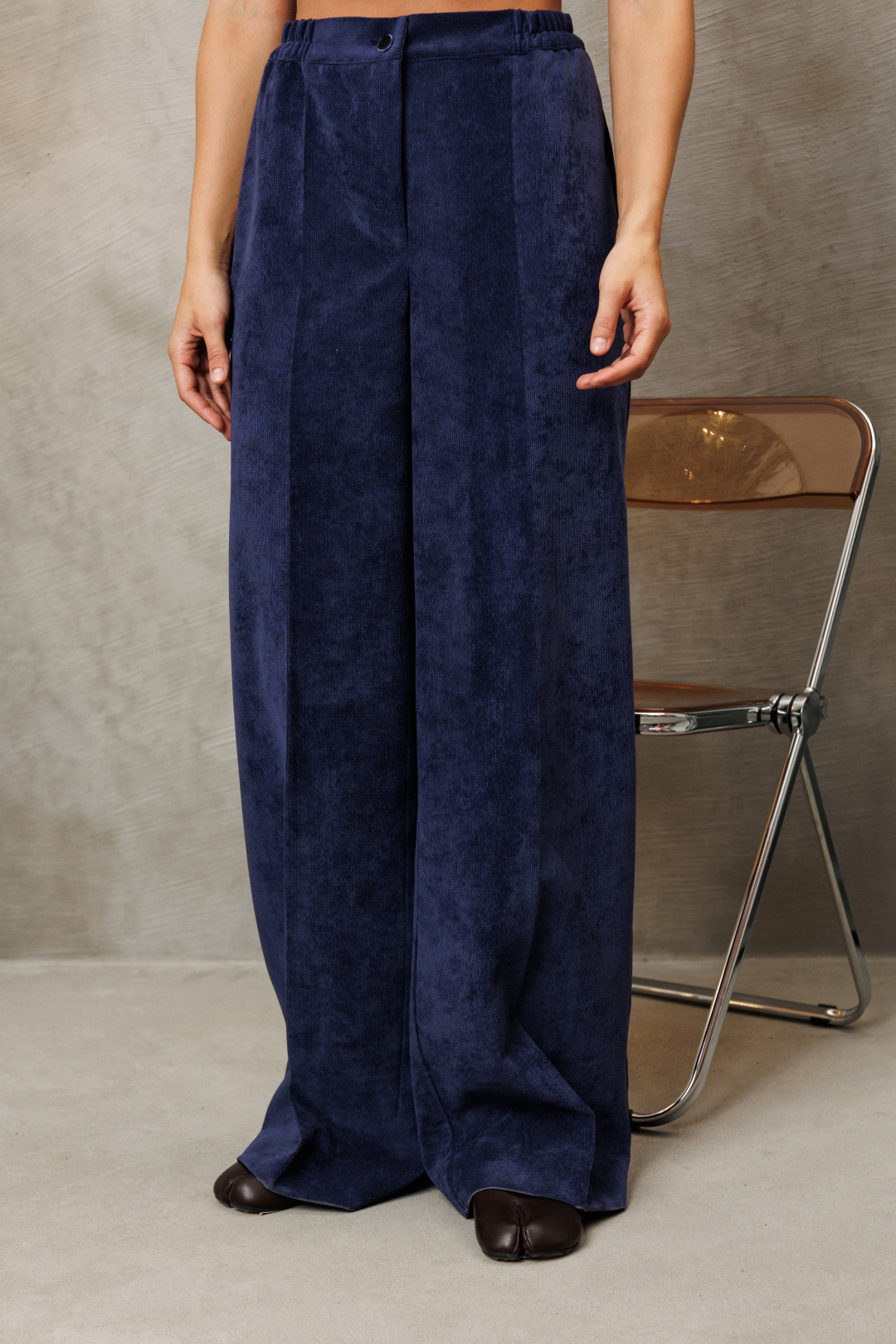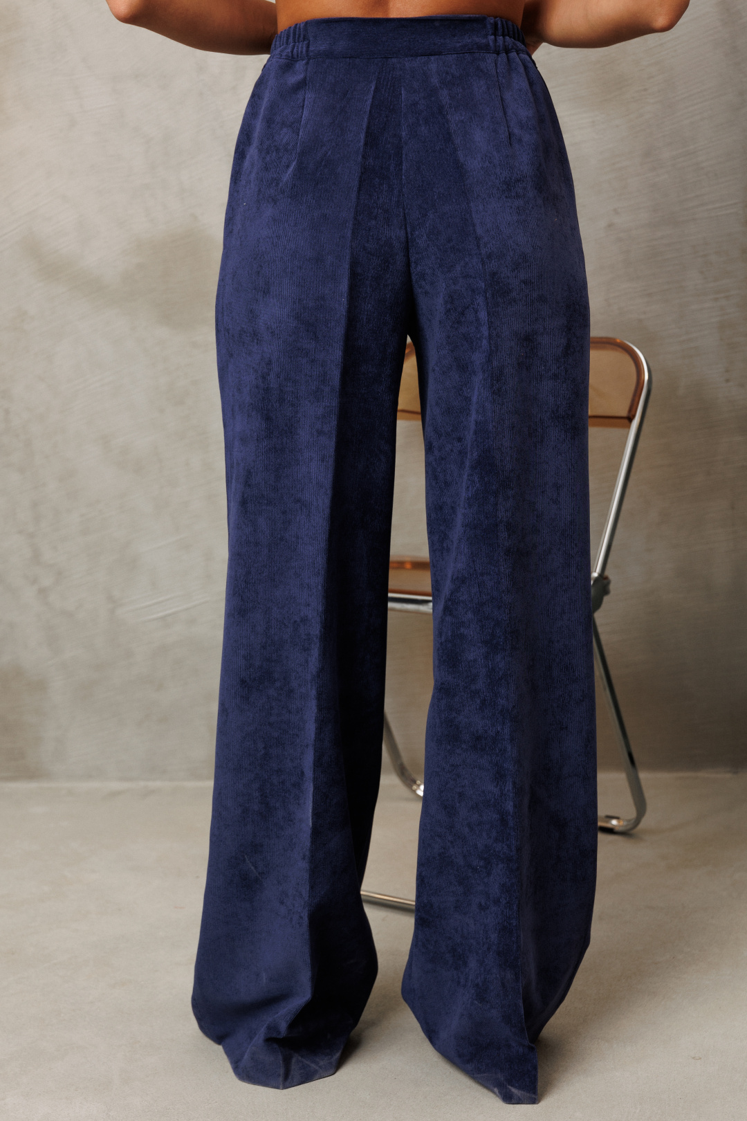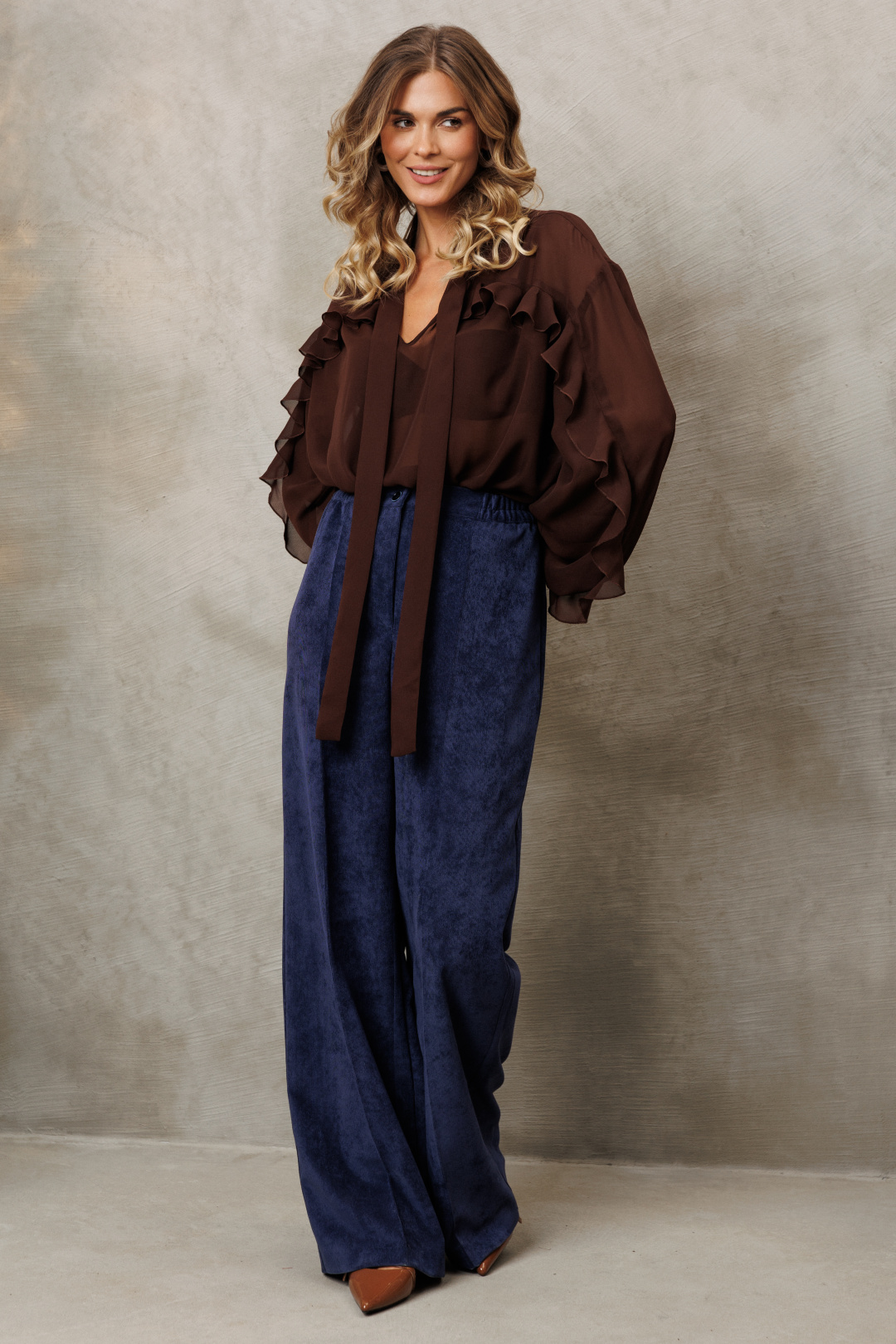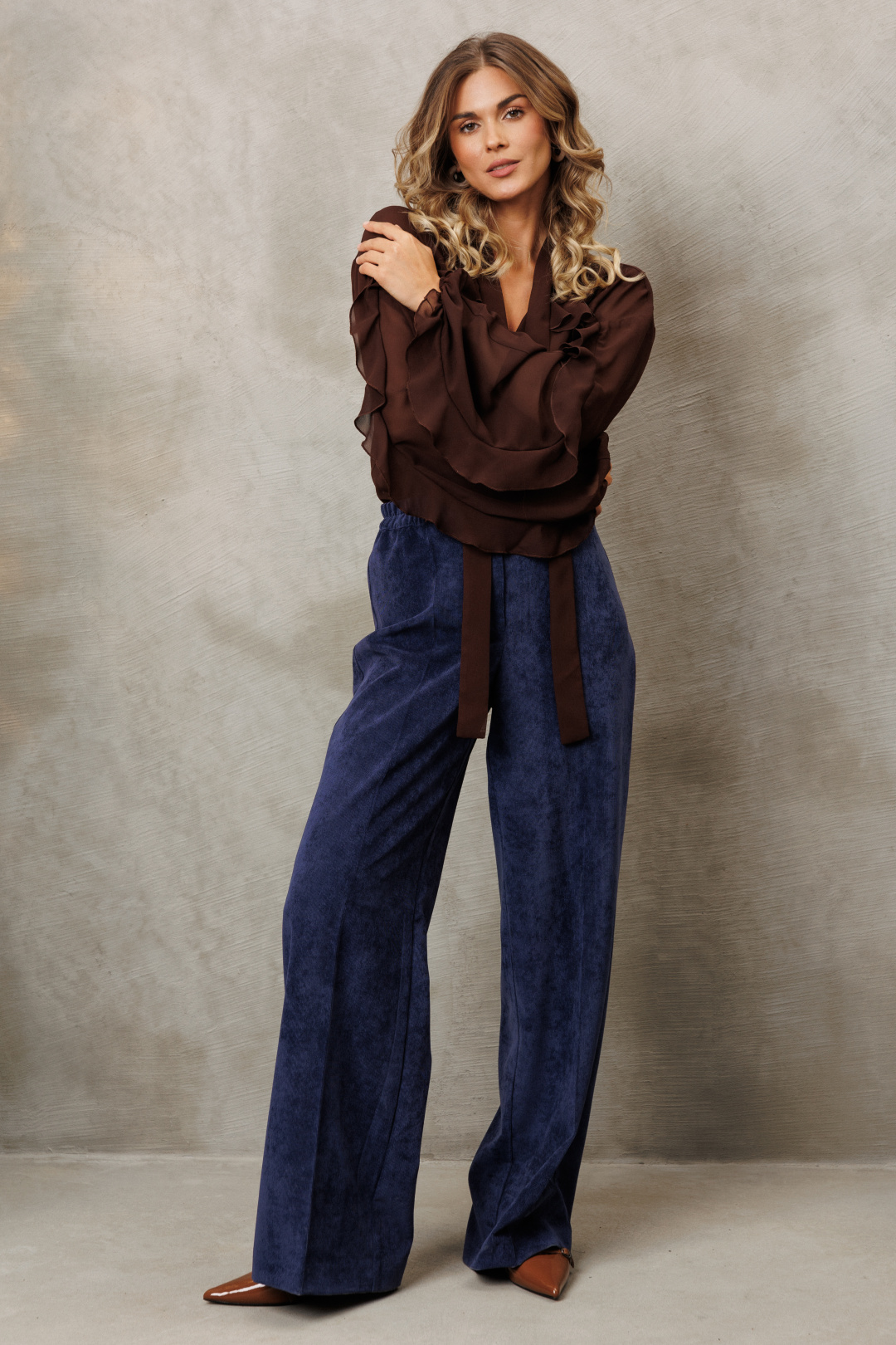 Костюм состоит из блузки и брюк. Блузка свободного силуэта из струящейся шифоновой ткани. Перед и спинка с кокеткой и сборкой. Рукав спущенный свободный с резинкой понизу. Вдоль линии кокетки и рукава вставлена рюша. Горловина V-образной формы с воротником стойкой переходящей в бант. Брюки палаццо с притачным поясом из мягкой вельветовой ткани. Спереди застежка гульфик на молнии и петлей и пуговицей по поясу. По задней частям брюк вытачки. Пояс с резинкой в боковых частях. Брюки с заутюженными стрелками. Длина блузки - 67см, длина рукава - 60 см. Длина брюк с учетом пояса - 109 см.