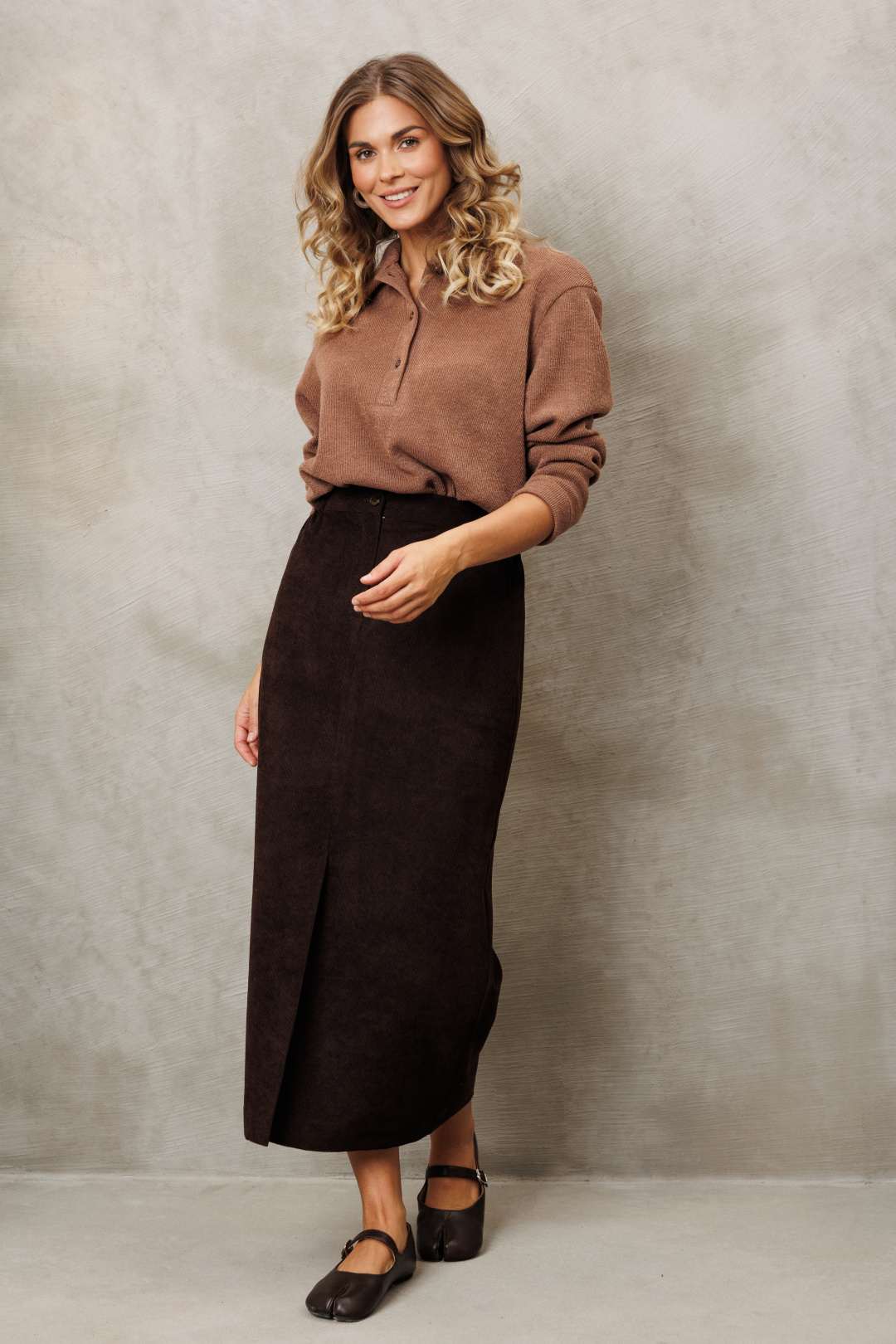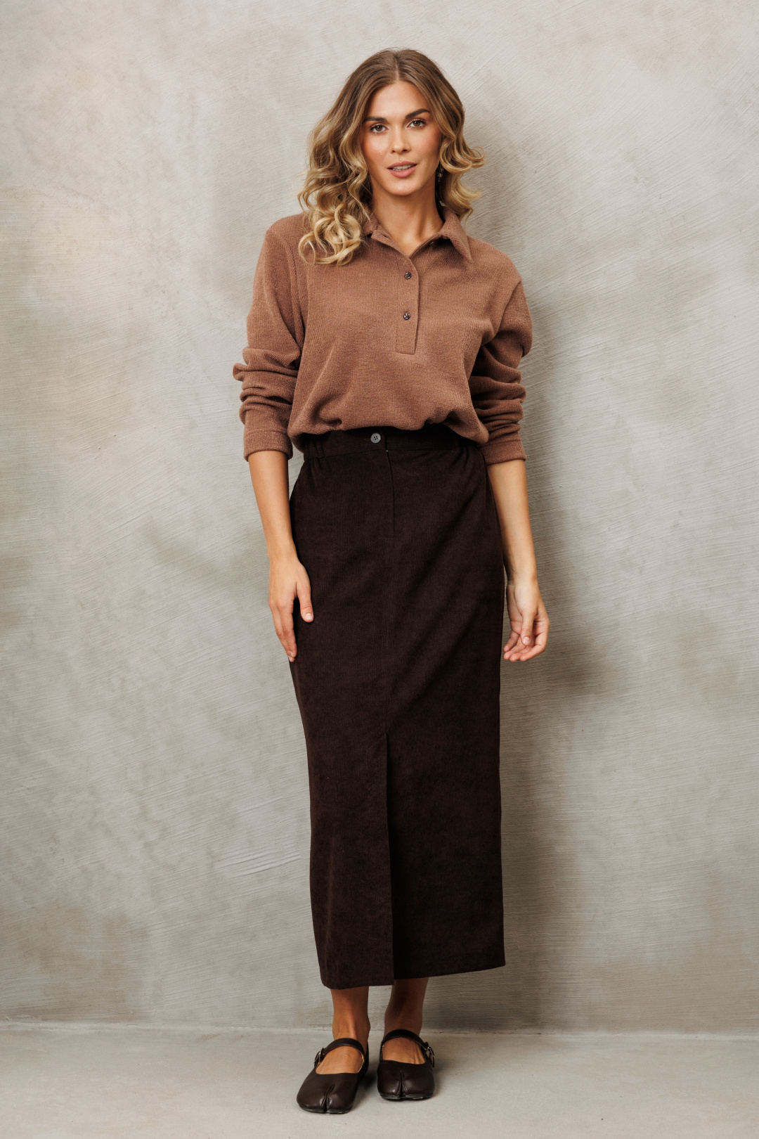 Костюм состоит из джемпера и юбки. Джемпер прямого силуэта с воротником поло из теплого трикотажного полотна. Рукав втачной одношовный. Длина джемпера- 66 см, длина рукава - 60 см. Юбка прямого силуэта выполненная из мягкой вельветовой ткани. Передняя честь юбки с вытачками, со средним швом и застежкой гульфиком на молнии и щлицей спереди. Задняя часть юбки с вытачками. Юбка на притачном поясе с затежкой на петлю и пуговицу спереди и резинками по бокам. Юбка на подкладке. Длина юбки с учетом пояса - 90 см.
