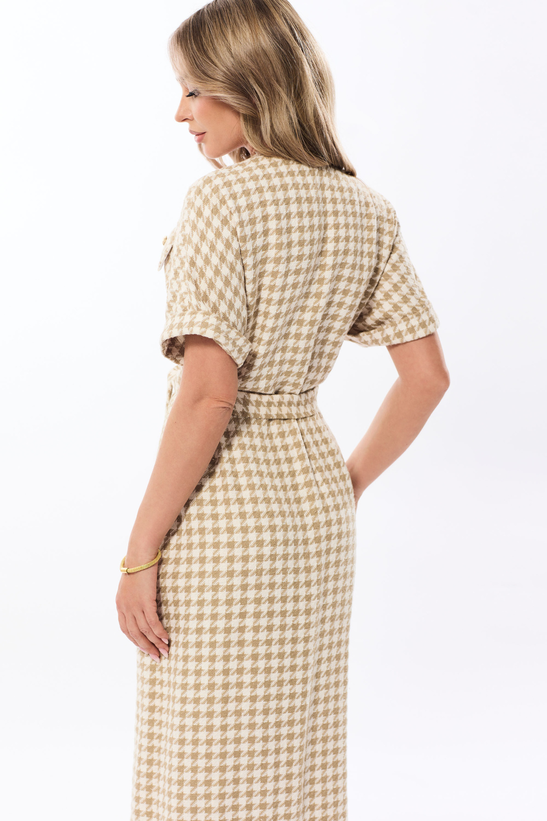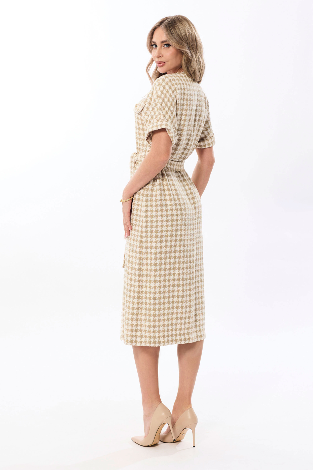 Элегантное женское платье прямого силуэта выполнено из высококачественной ткани с крупным принтом в клетку мягких оттенков бежевого и белого цвета. Дизайн платья включает центральную застежку на петли и пуговицы спереди, что придает ему аккуратный вид. Платье дополнено безворотниковым дизайном с глубоким V-образным вырезом, который подчеркивает линию шеи и делает образ женственным. По переду платья на уровне груди расположены функциональные клапаны с петлей и пуговицей. Короткий цельнокроенный рукав с отложной манжетой добавляет изящества. Края платья и горловина украшены втачной бахромой из основной ткани, что создает дополнительный акцент на текстильных деталях. Платье оснащено также шлевками по боковым швам для съемного пояса, позволяющего подчеркнуть талию. Платье без подкладки обеспечивает легкость и комфорт при носке. Это платье станет отличным выбором как для деловых встреч, так и для повседневной носки, благодаря своему стильному дизайну и универсальной цветовой палитре.