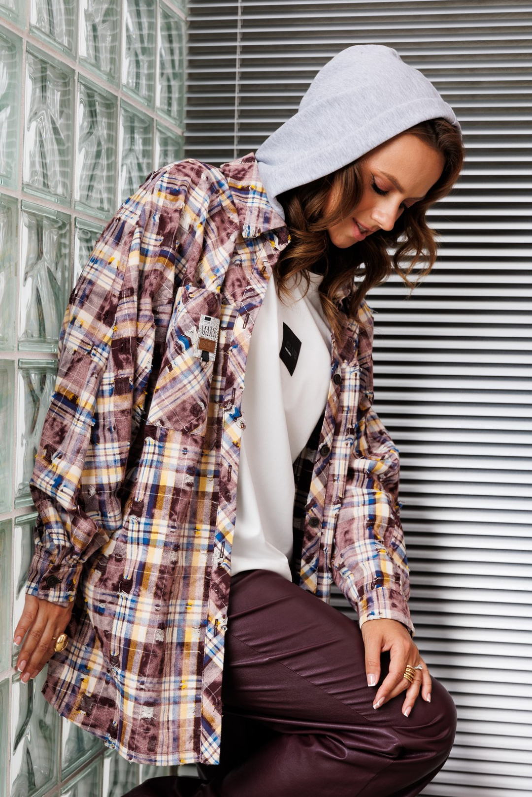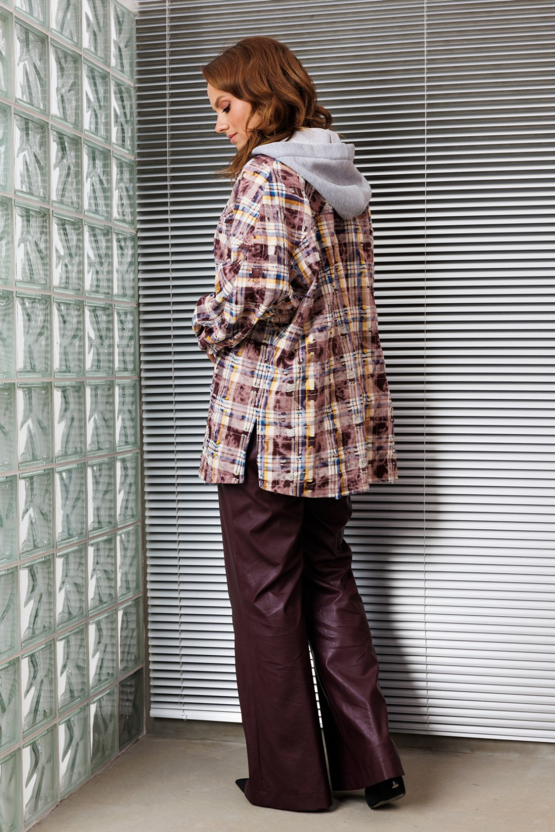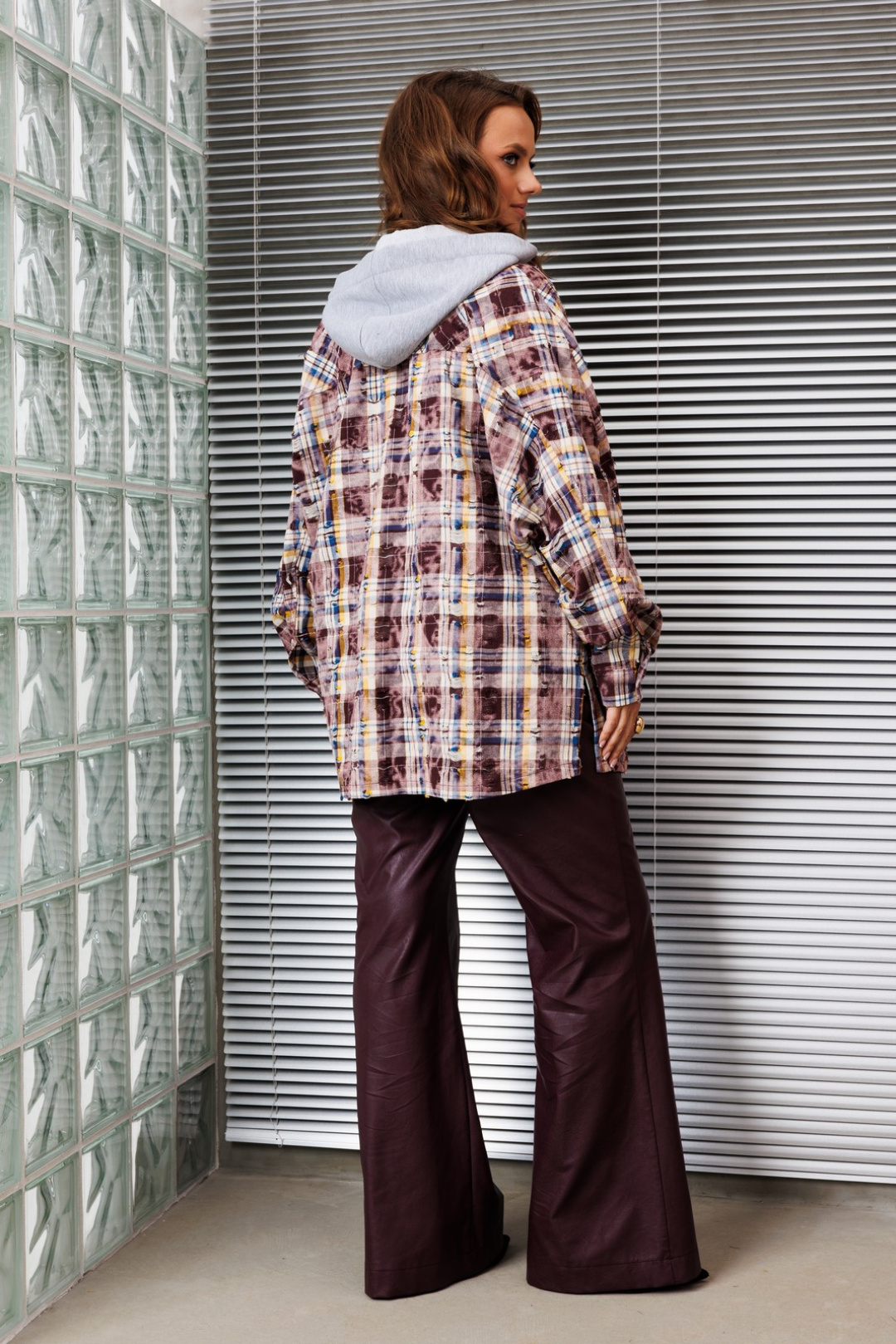 Рубашка свободного силуэта силуэта, горловина с рубашечным воротником. Рукав спущенный на манжете внизу. Застежка на петли и пуговицы По переду накладные карманы .