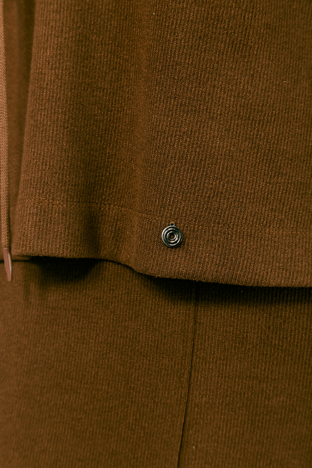 Костюм женский, юбочный, изготовлен из трикотажного полотна, состоит из джемпера и юбки. Джемпер свободного кроя. Горловина оформлена отложным воротником на стойке и планками, декорированными люверсами, с протянутым в них шнуром. Рукава спущенные, длинные. Низ изделия разной длины, в боковых швах разрезы. Кокетка спинки, планки и воротник джемпера выполнены из отделочной ткани. Юбка с цельнокроенным поясом на резинке. На передней части шов, внизу обработана шлица. Юбка на подкладке.