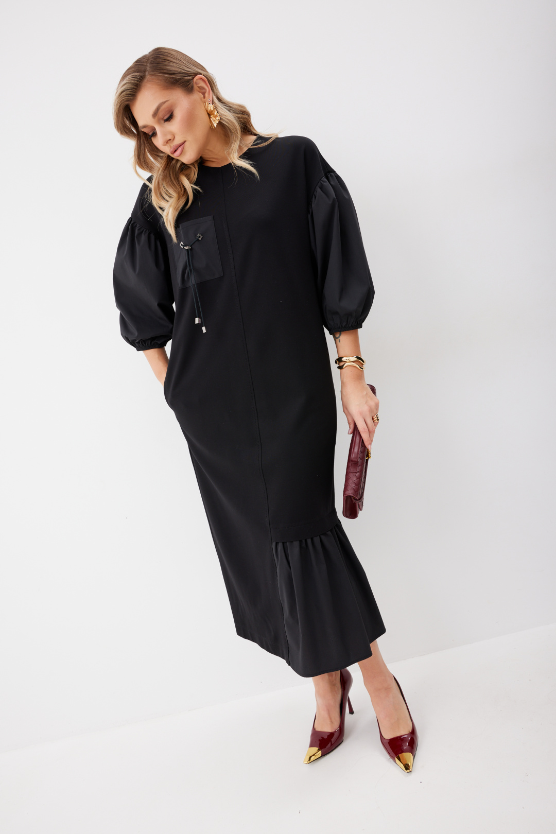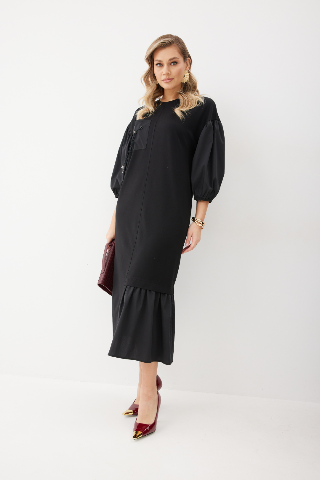 Платье женское прямого силуэта без подкладки из трикотажной ткани длиной до середины икры. Передняя часть платья со средним швом. По левой половинке переда внизу платья пришит волан из ткани – компаньона. По правой половинке переда настрочен нагрудный карман из ткани – компаньона с декоративными элементами. В боковых швах платья функциональные карманы. Спинка платья со средним швом, в котором расположена застежка – «молния». По низу левой половинки спинки пришит волан из ткани – компаньона. Горловина имеет округлую форму. Линия плеча спущена. Рукав выполнен из ткани – компаньона со сборкой вверху рукава и резинкой по низу рукава. Длина изделия по спинке 126 см, длина рукава от горловины 63 см.