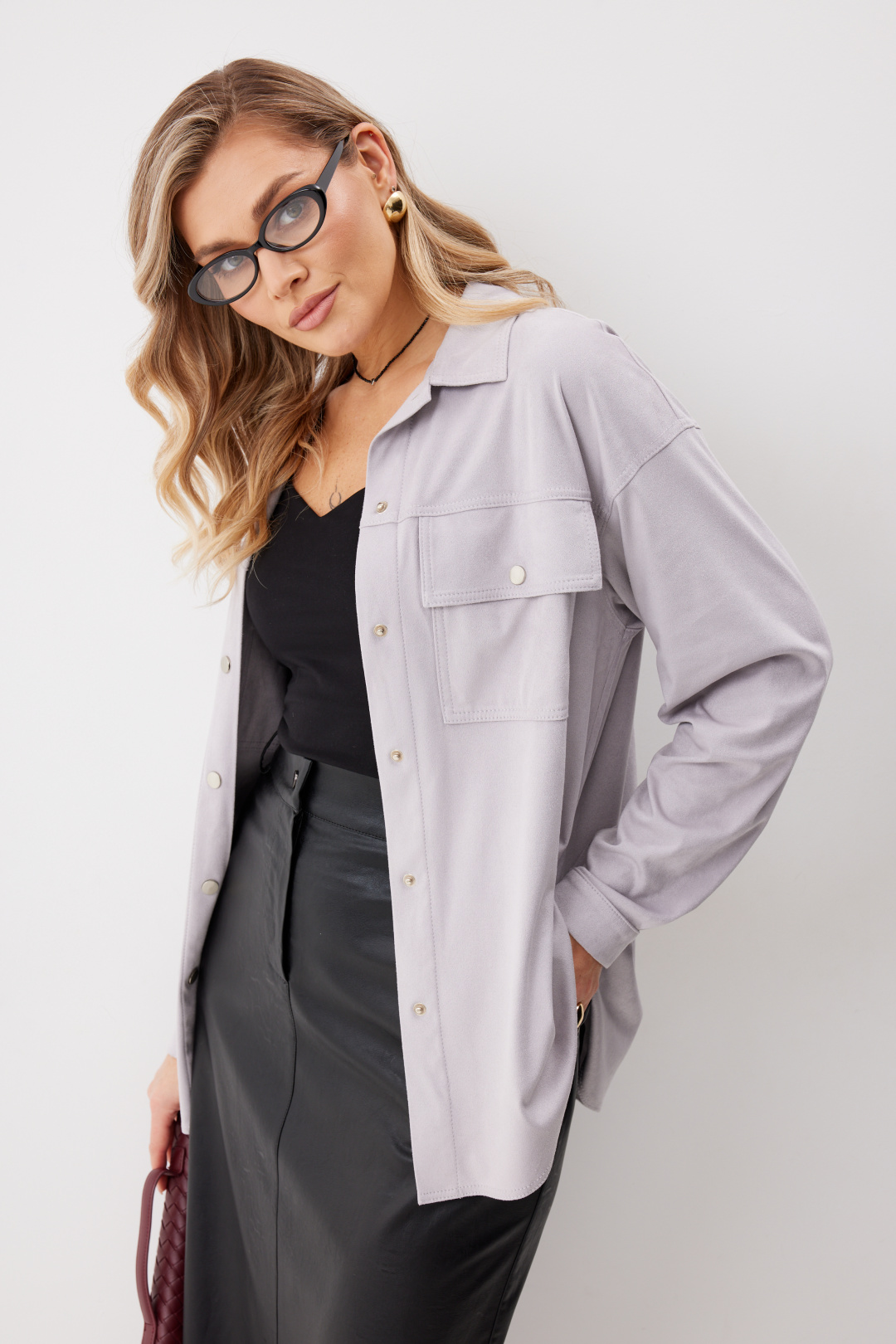 Блузка женская прямого силуэта из замшевой ткани длиной за линию бедер. По переду блузки отрезные кокетки и нагрудные накладные карманы с клапаном, застегивающиеся на кнопку. Спинка с отрезной кокеткой и встречной складкой. Линия плеча спущена. Рукав рубашечный втачной по низу с 2 –мя складками и отрезной манжетой, застегивающейся на кнопку. Воротник втачной рубашечный. Линия низа имеет фигурную форму. Воротник, кокетки, карманы, линия проймы отстрочены отделочными строчками. Застежка на кнопки центральная.Длина спинки изделия 73,5 см, длина рукава от горловины 77,5 см.