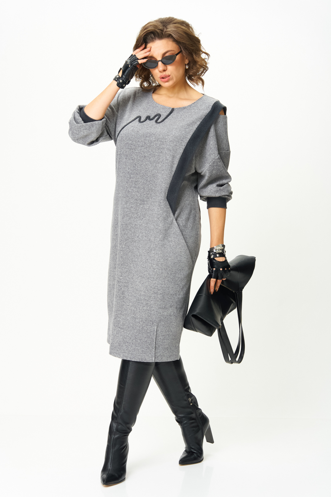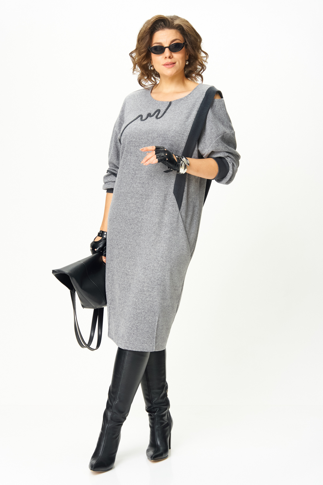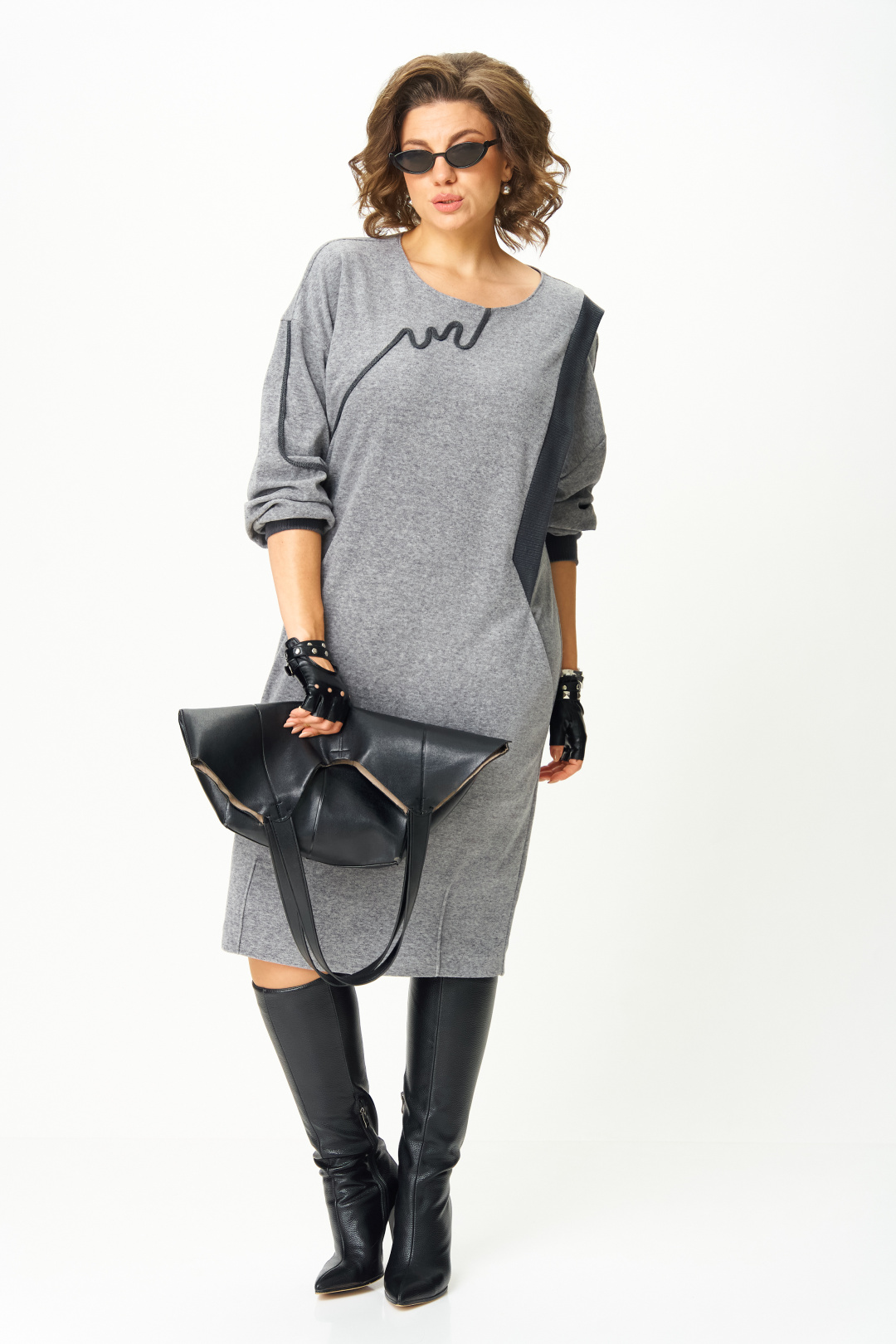 Элегантное трикотажное платье в сером цвете воплощает собой комфорт и стиль в одном образе. Умело скроенный прямой крой слегка заужен к низу, создавая изящную силуэтную линию. Рукава длиной три четверти заканчиваются стильной манжетой, добавляя аккуратности в образ. Необычным элементом служат прорезные карманы на передней части платья, декорированные декоративным шнуром, привносящим нотку утончённости в дизайн. Это платье является идеальным выбором для создания современного городского образа.
