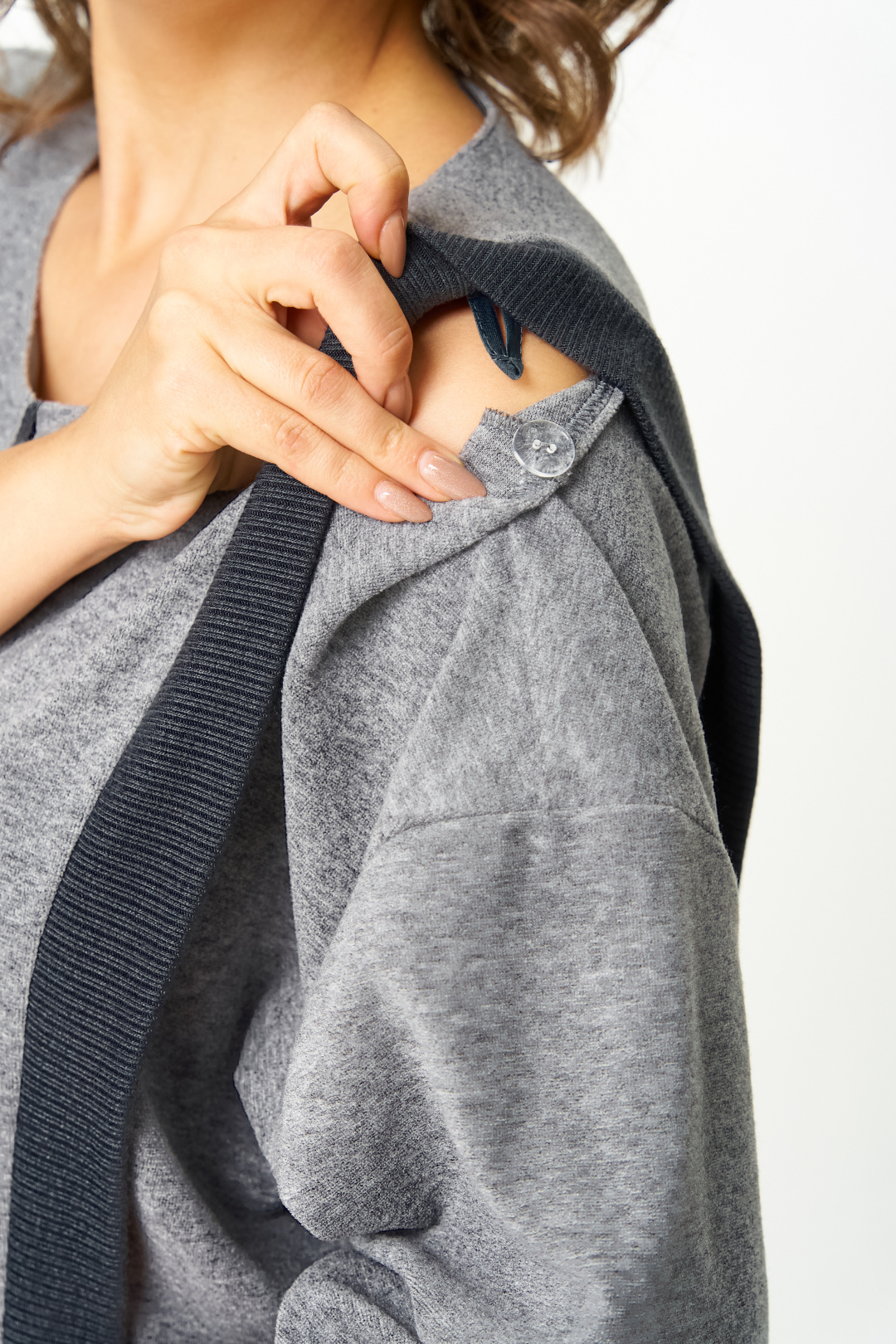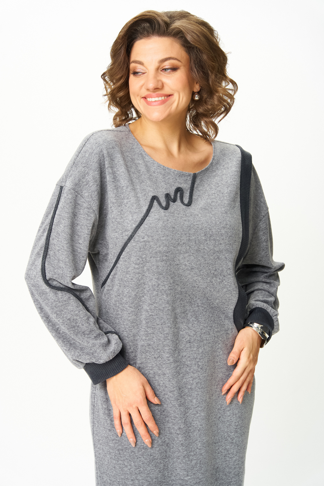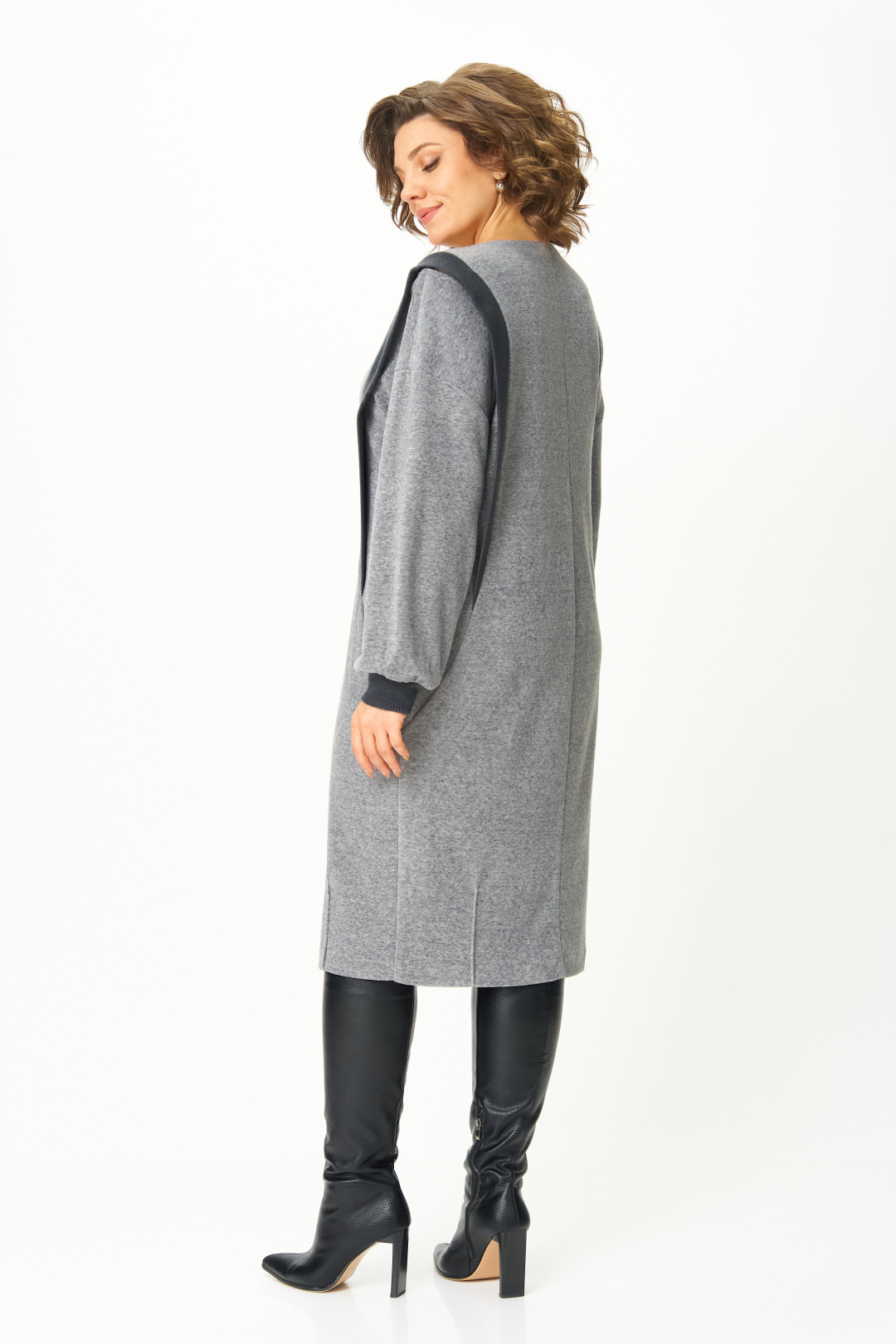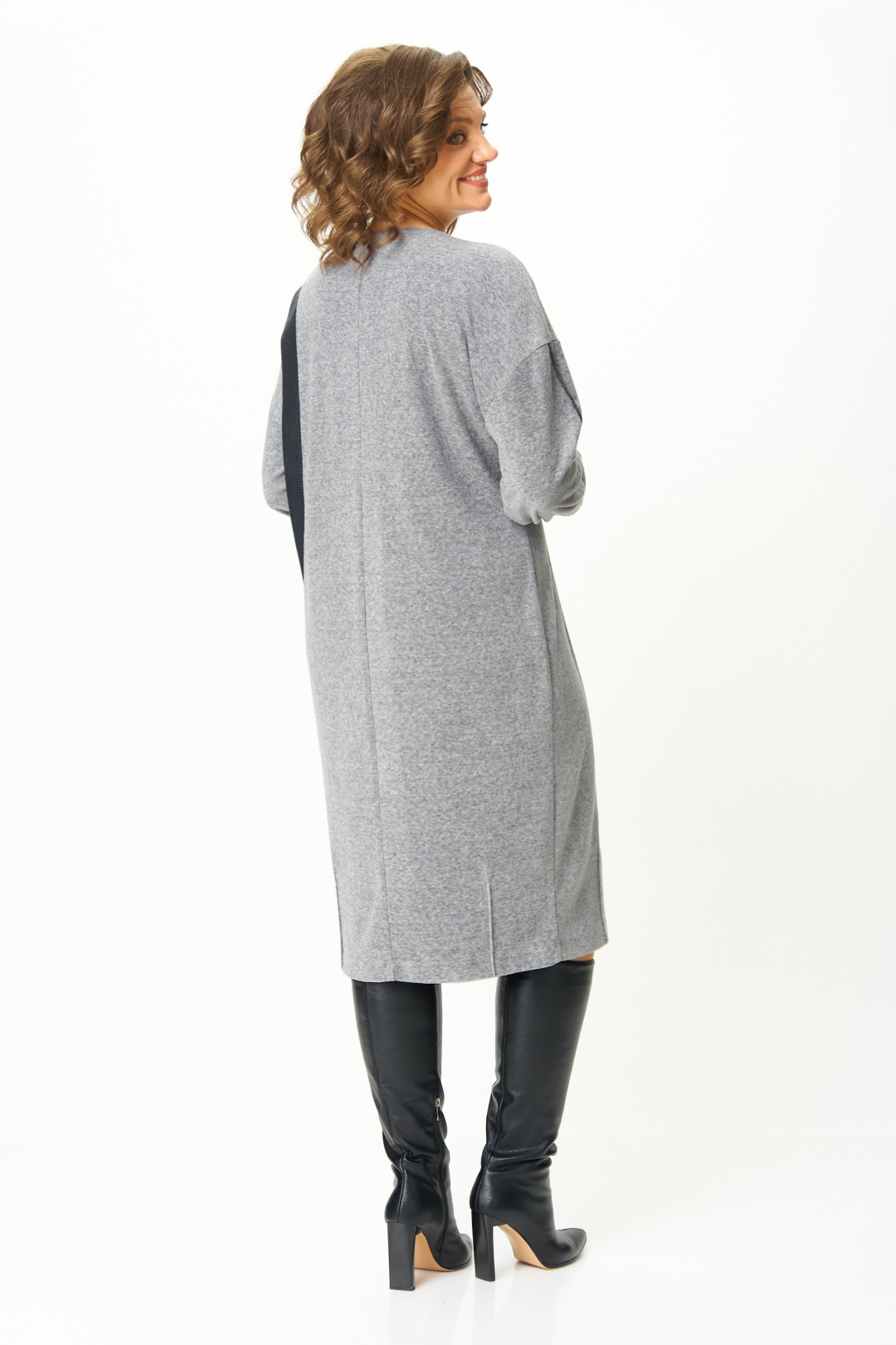 Элегантное трикотажное платье в сером цвете воплощает собой комфорт и стиль в одном образе. Умело скроенный прямой крой слегка заужен к низу, создавая изящную силуэтную линию. Рукава длиной три четверти заканчиваются стильной манжетой, добавляя аккуратности в образ. Необычным элементом служат прорезные карманы на передней части платья, декорированные декоративным шнуром, привносящим нотку утончённости в дизайн. Это платье является идеальным выбором для создания современного городского образа.