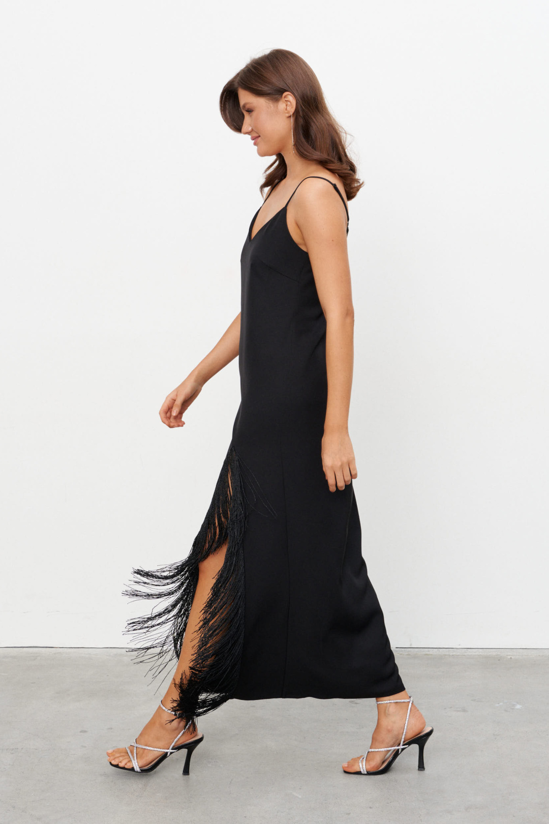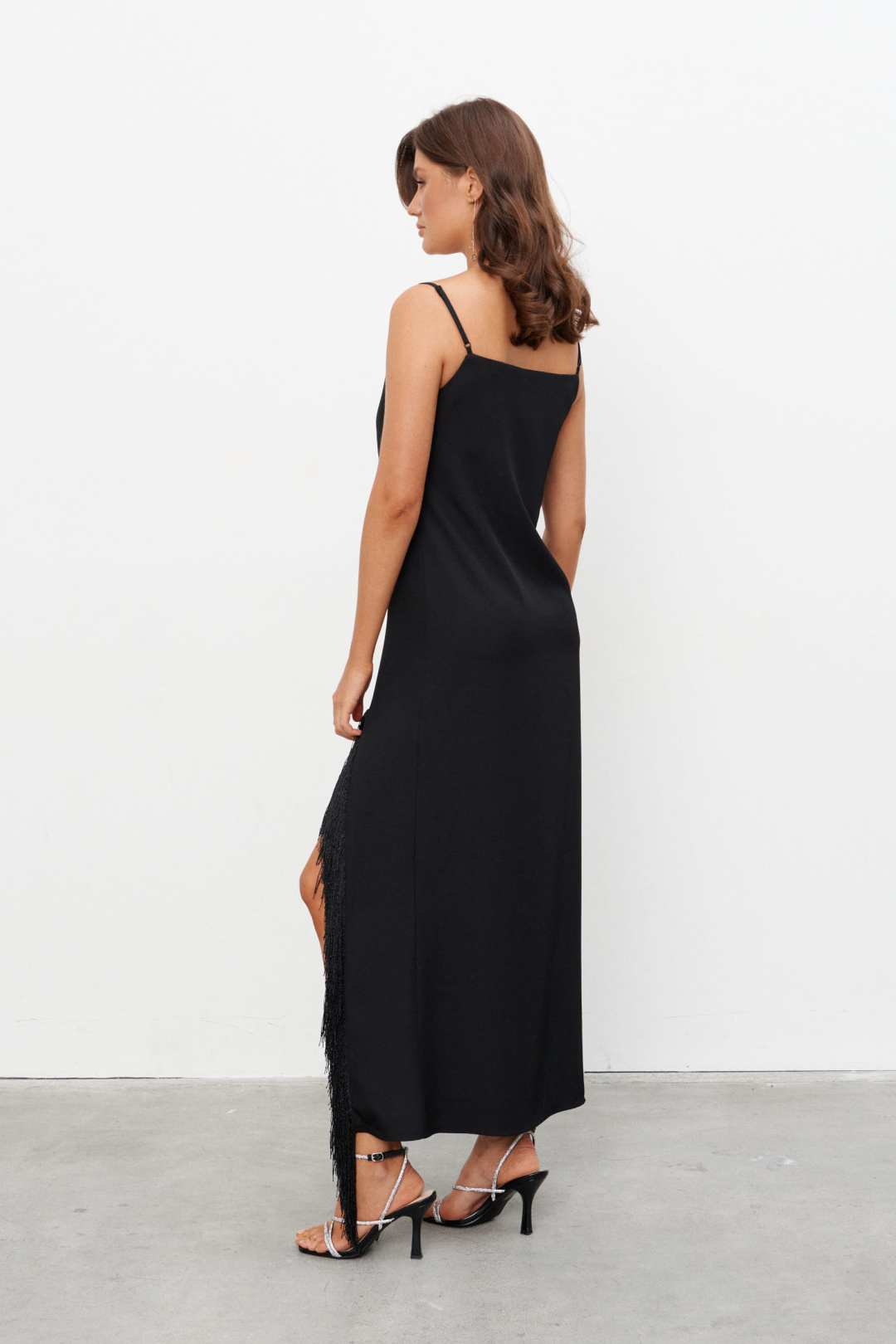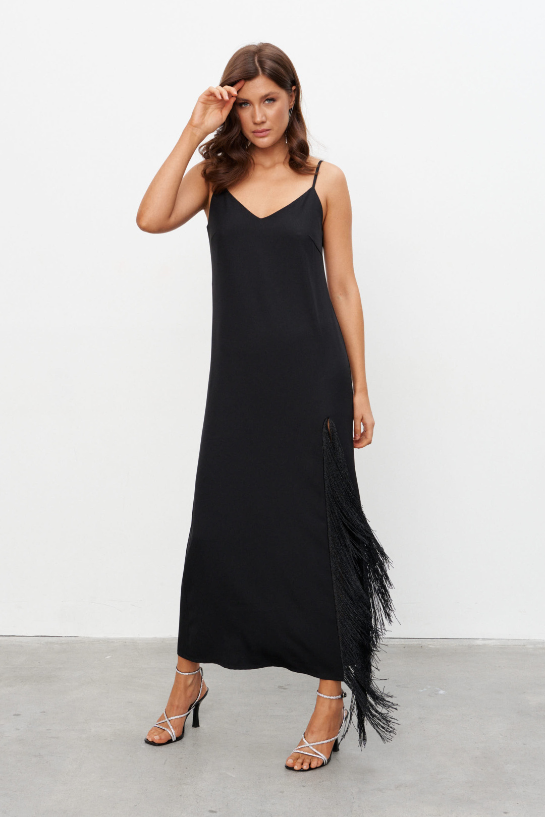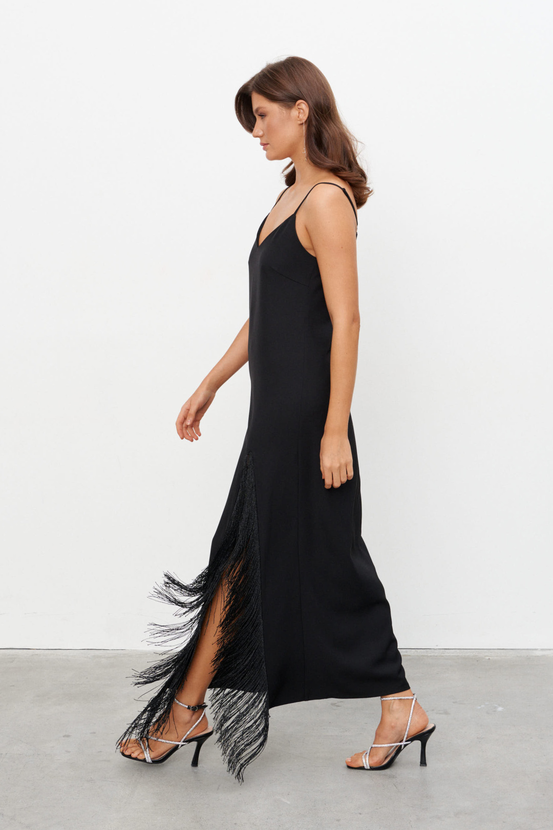 • платье-комбинация из струящейся ткани длиной макси с высоким разрезом, обрамлённым бахромой. Платье на бретелях длину которых можно регулировать. Застёжка на потайную молнию сбоку.