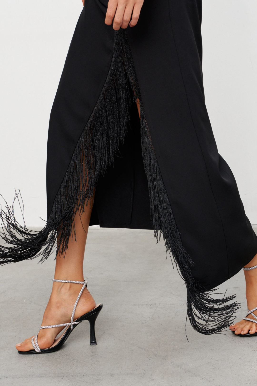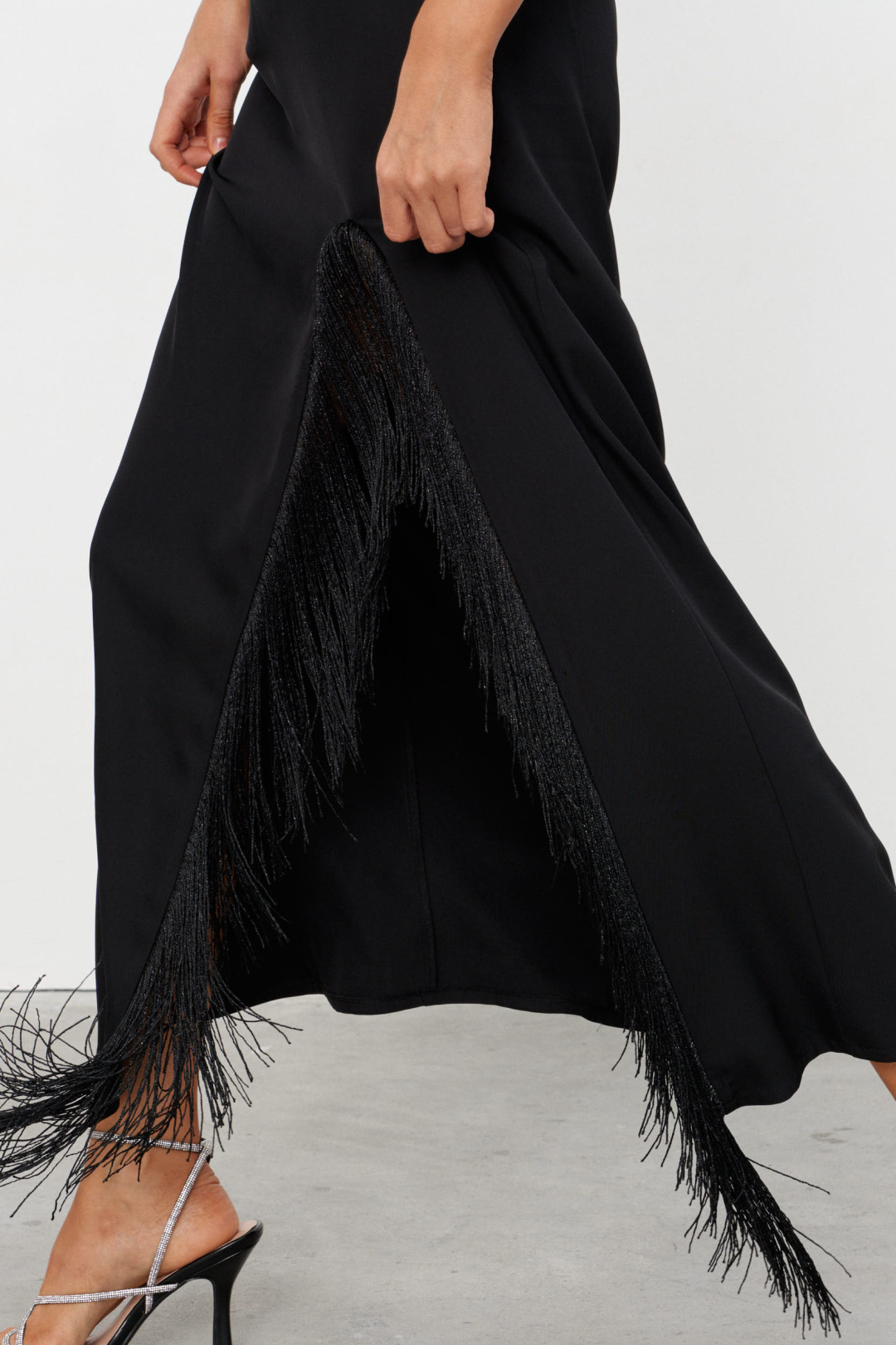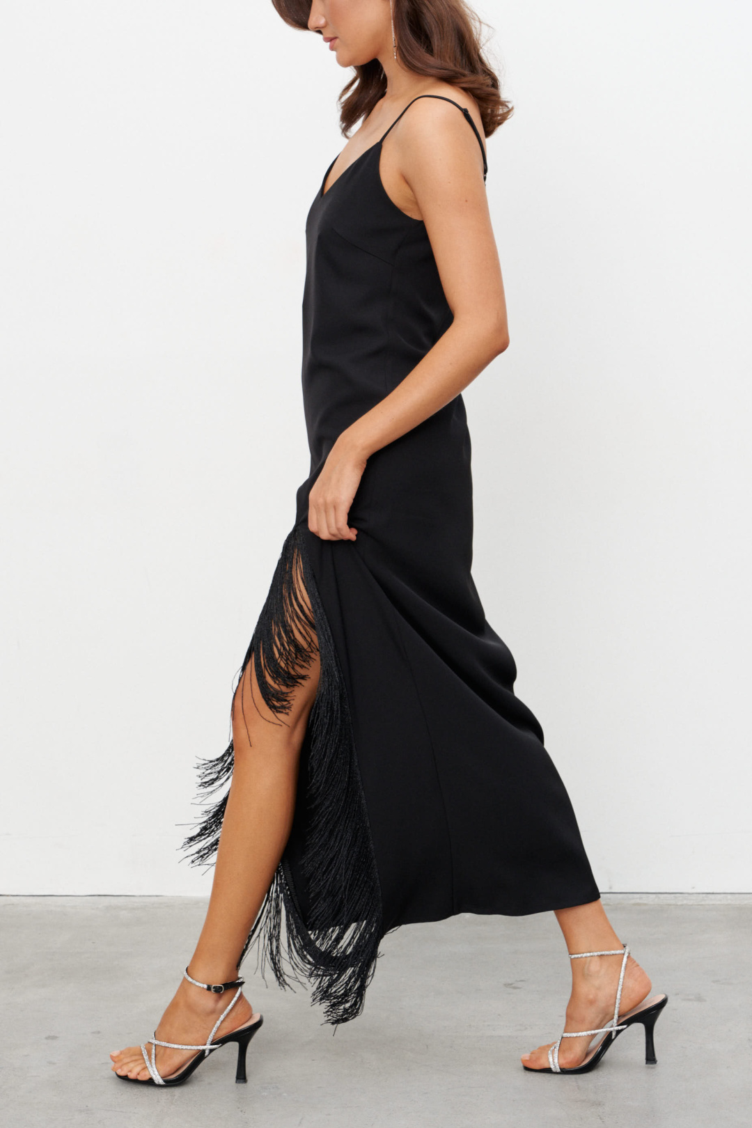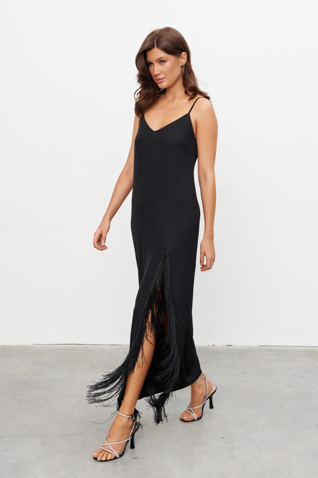 • платье-комбинация из струящейся ткани длиной макси с высоким разрезом, обрамлённым бахромой. Платье на бретелях длину которых можно регулировать. Застёжка на потайную молнию сбоку.