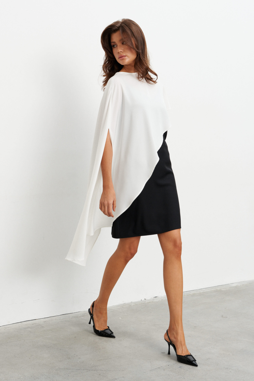 Комплект состоящий из платья-комбинации длиной мини и асимметричной блузки. Платье выполнено из струящейся ткани. Высота бретелей регулируется, в боковом шве потайная молния.