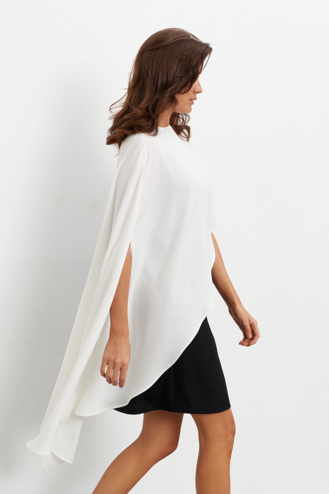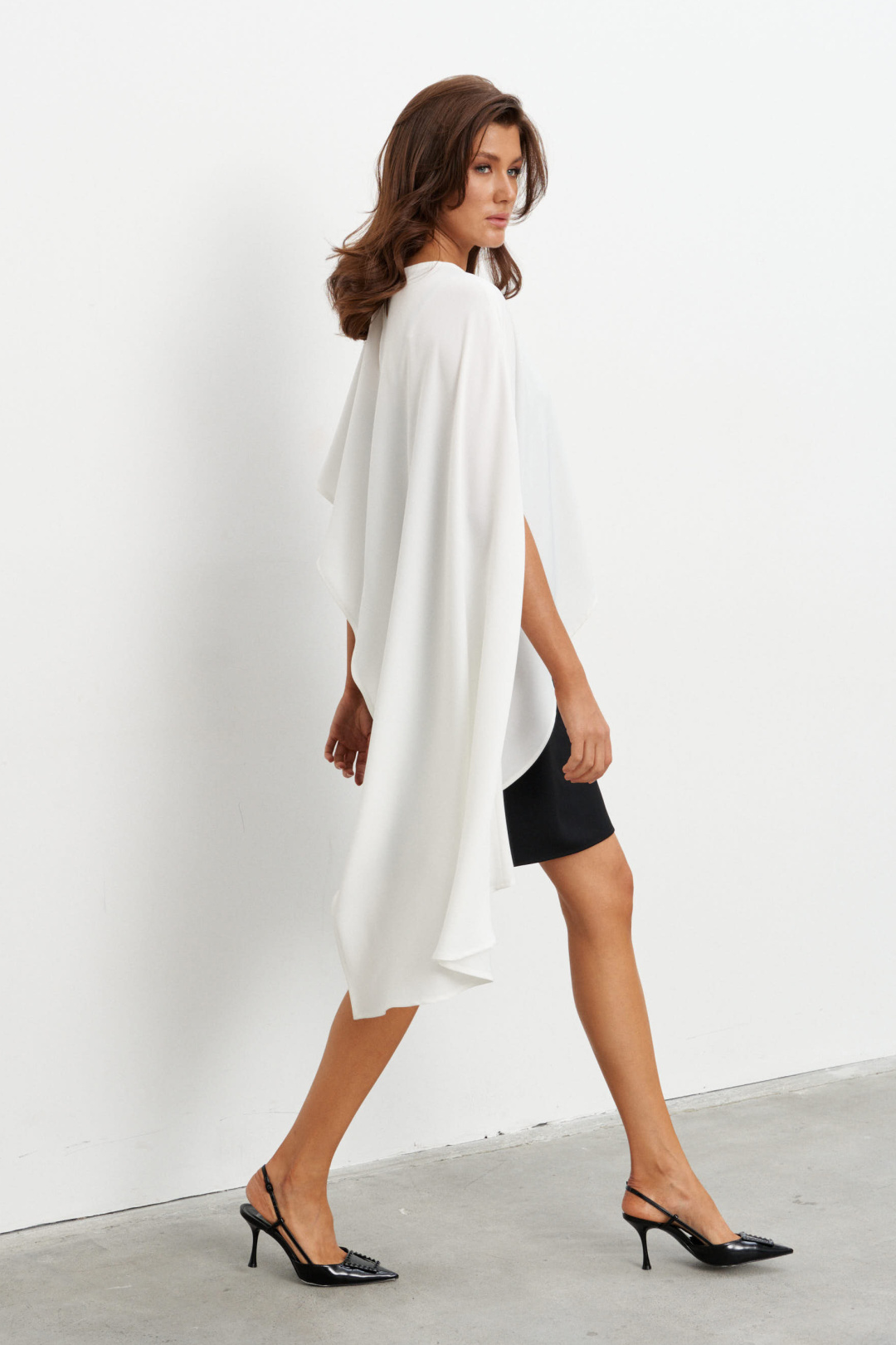 Блузка из струящейся ткани по форме напоминает кейп. Левая сторона короче и спадает с плеча, а правая - длинная с прорезью для руки. Сзади по горловине застёжка на пуговицу. Длина по середине спинки - 73 см Длина блузы- 115 см