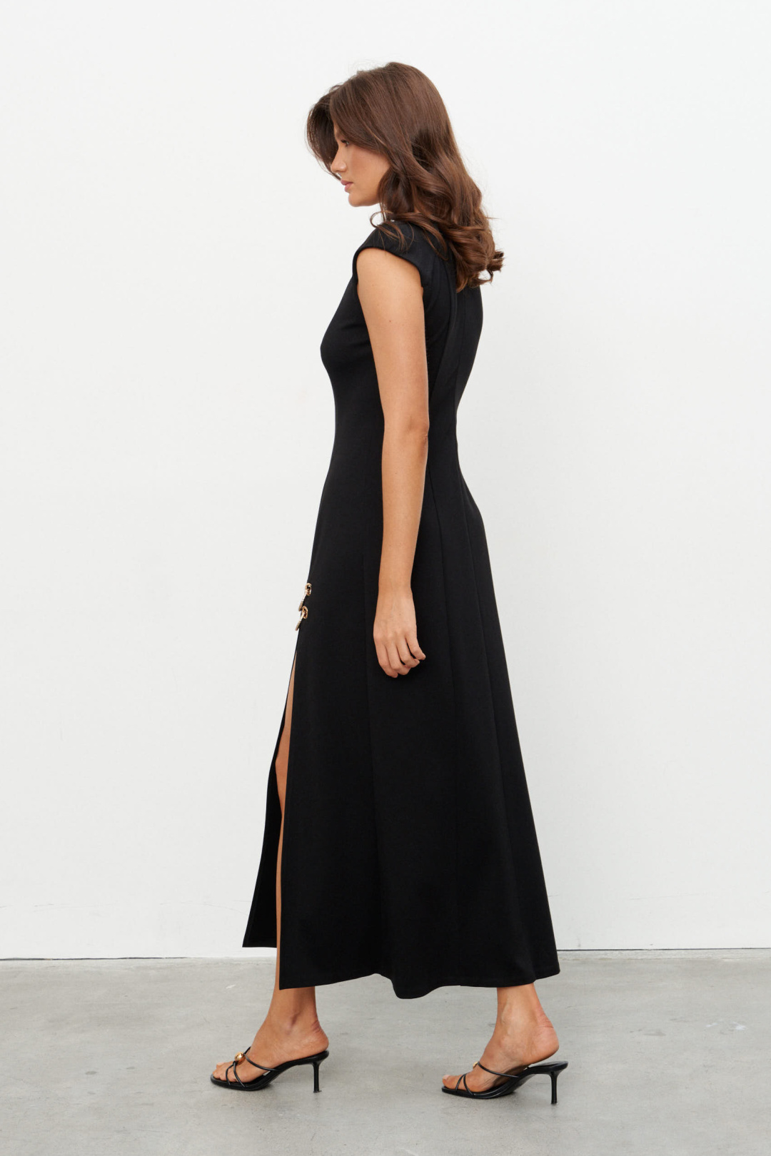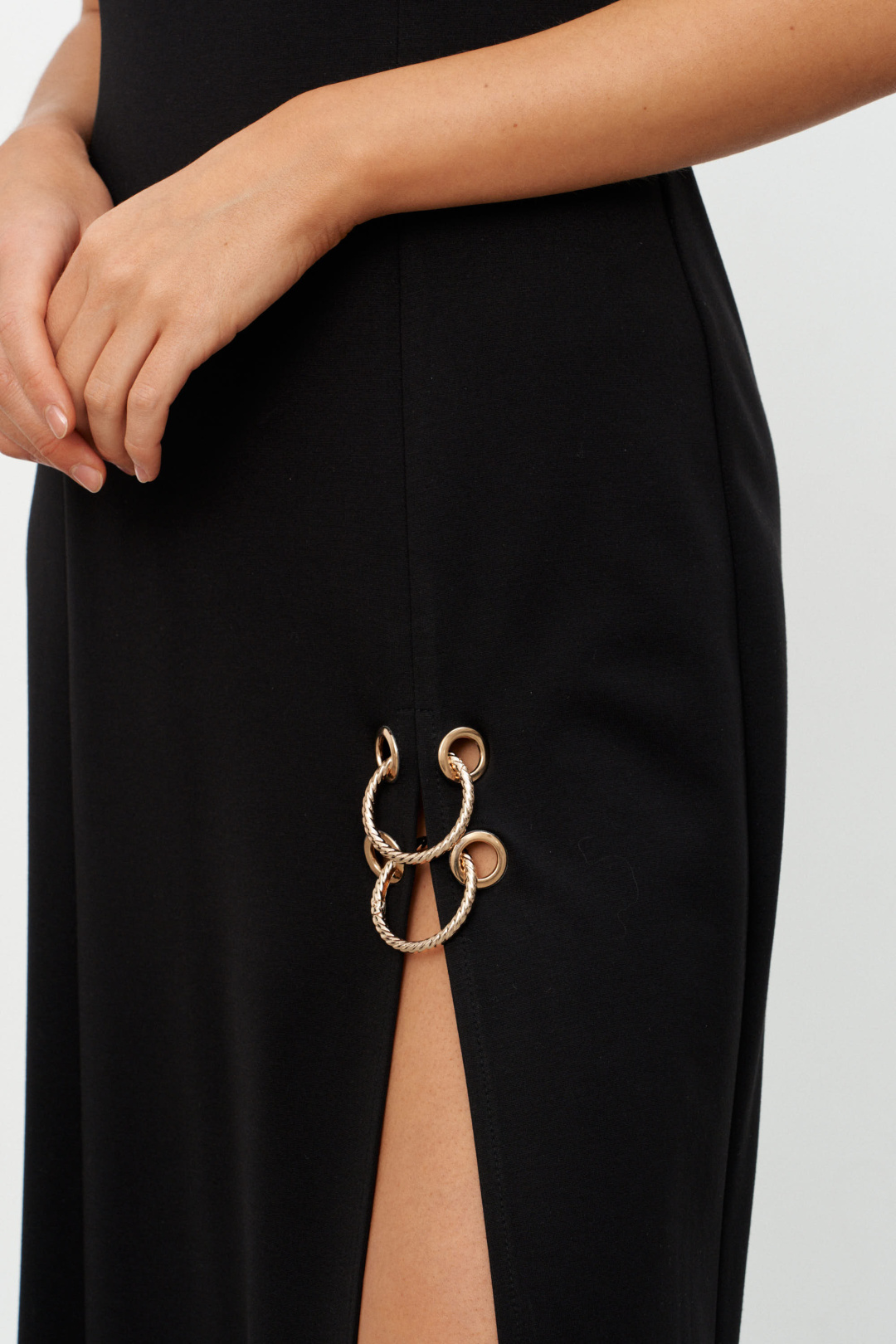 Платье из трикотажного полотна приталенного силуэта с расклешённой юбкой с высоким разрезом. Вырез горловины V-образный, По плечам - плечевые накладки. Верх разреза отделан люверсами и кольцами в качастве декора. Застёжка на потайную молнию сзади.