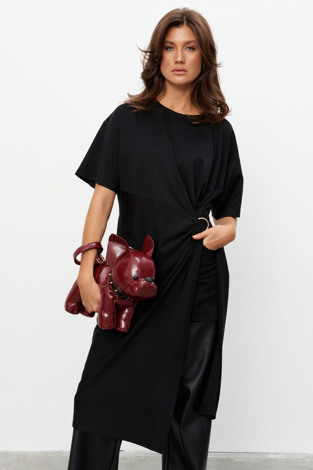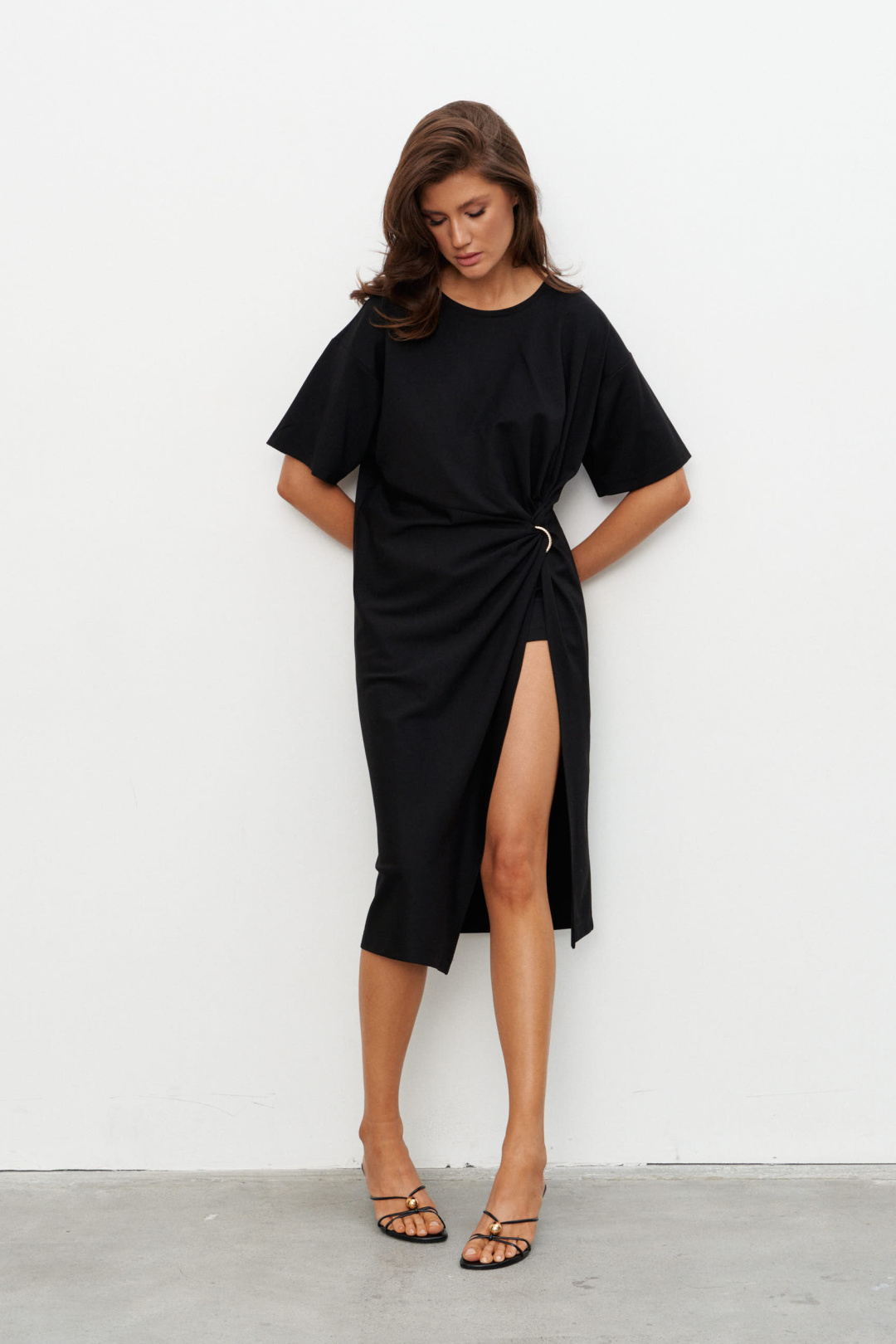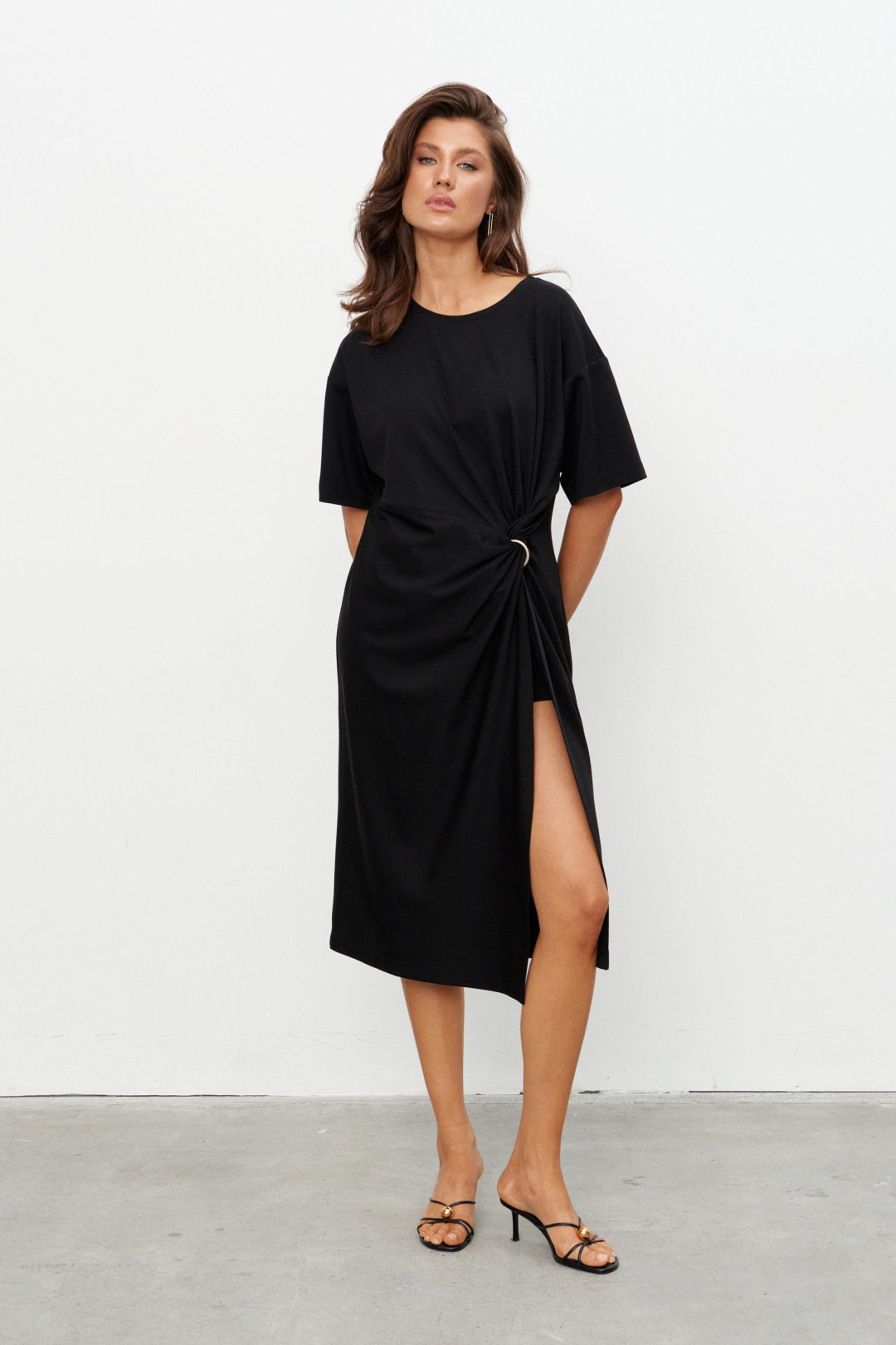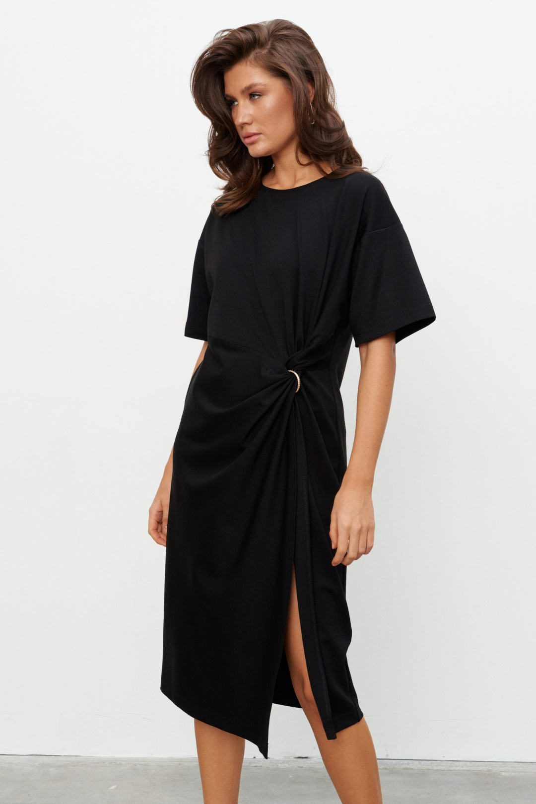 Комплект из трикотажного полотна состоящий из платья-туники и шорт. Платье со спущенным плечом и рукавом до локтя, горловина отделана эластичной бейкой. Сбоку, чуть ниже талии, конструктивный элемент в виде узла, переходящего в высокий разрез. Через узел протянуто декоративное золотое кольцо. Шорты плотно прилегающие на резинке по поясу. Длина по середине спинки 44-48р -112,5 см 50-54р -113 см Длина рукава 44-54р -20 см