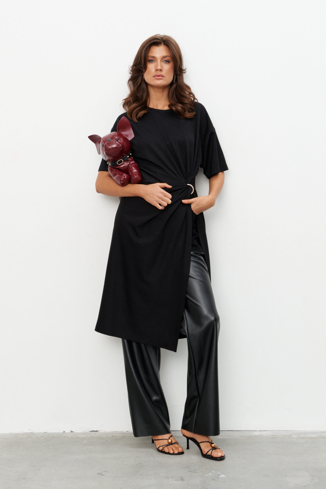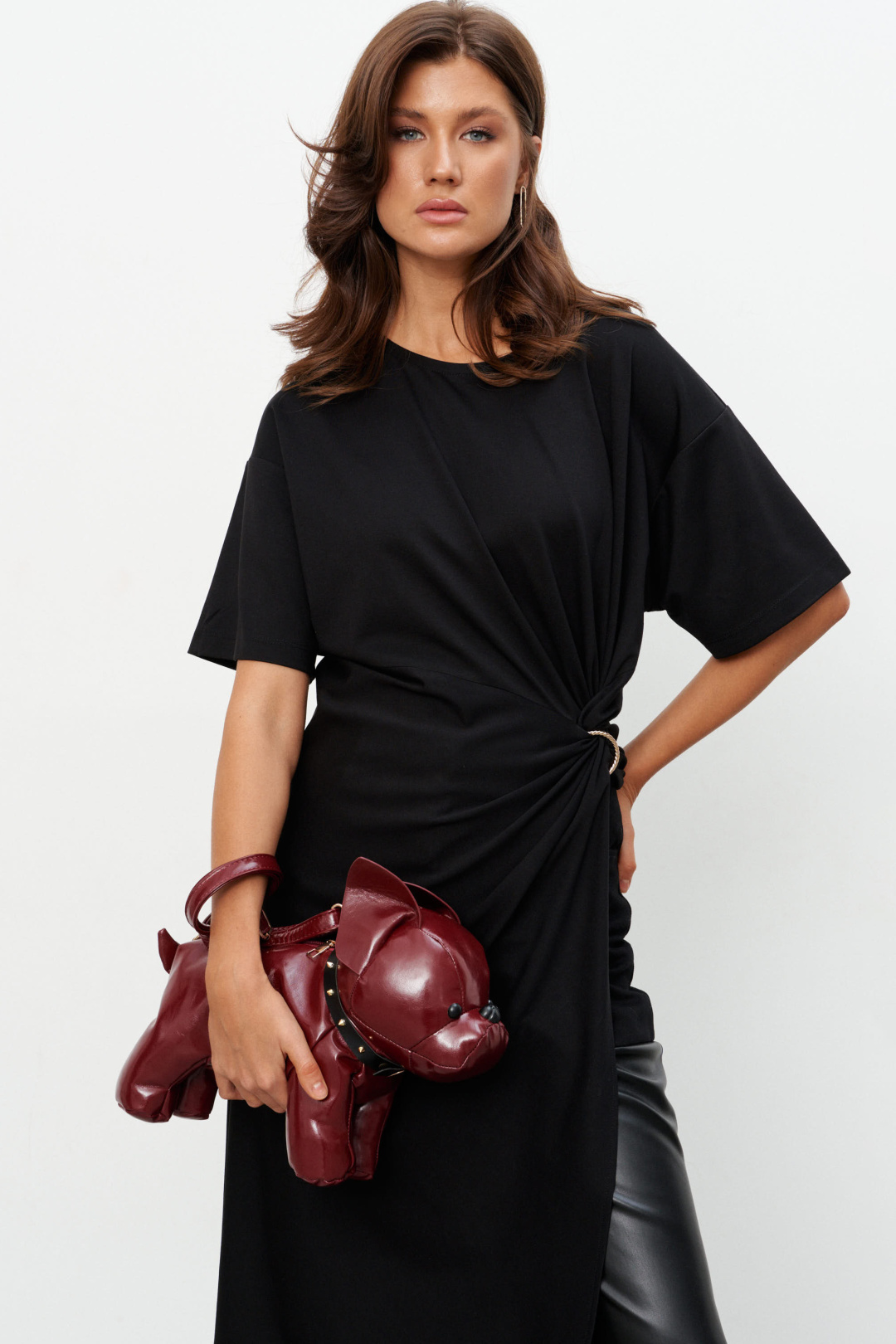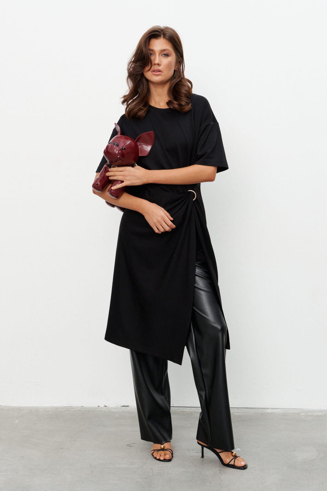 Комплект из трикотажного полотна состоящий из платья-туники и шорт. Платье со спущенным плечом и рукавом до локтя, горловина отделана эластичной бейкой. Сбоку, чуть ниже талии, конструктивный элемент в виде узла, переходящего в высокий разрез. Через узел протянуто декоративное золотое кольцо. Шорты плотно прилегающие на резинке по поясу. Длина по середине спинки 44-48р -112,5 см 50-54р -113 см Длина рукава 44-54р -20 см