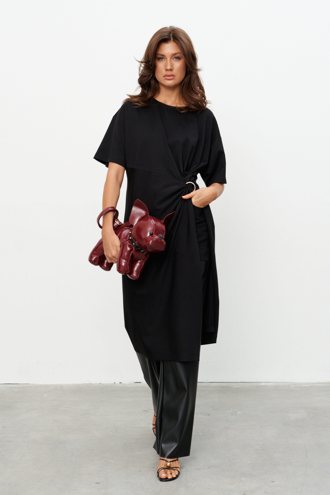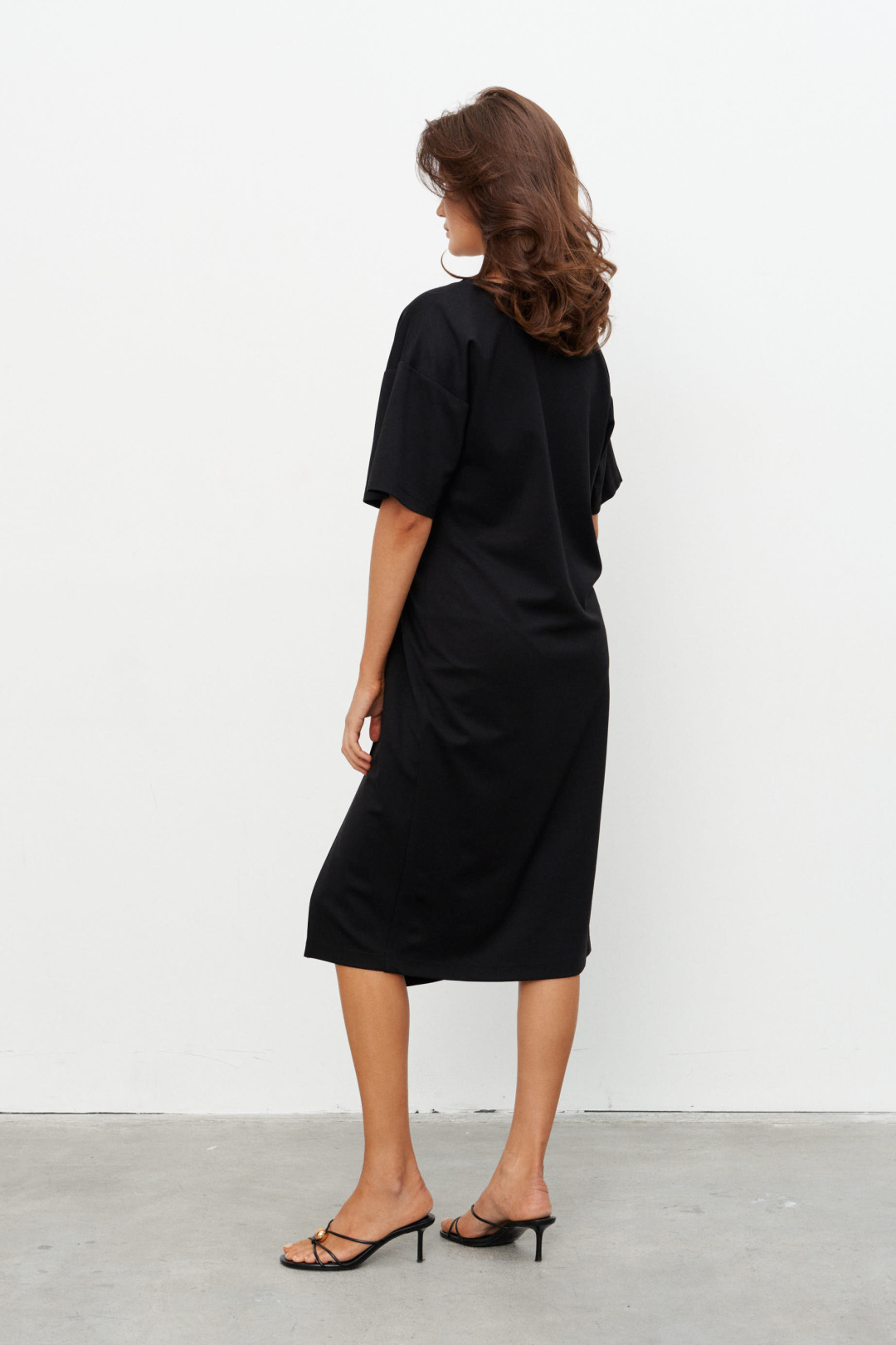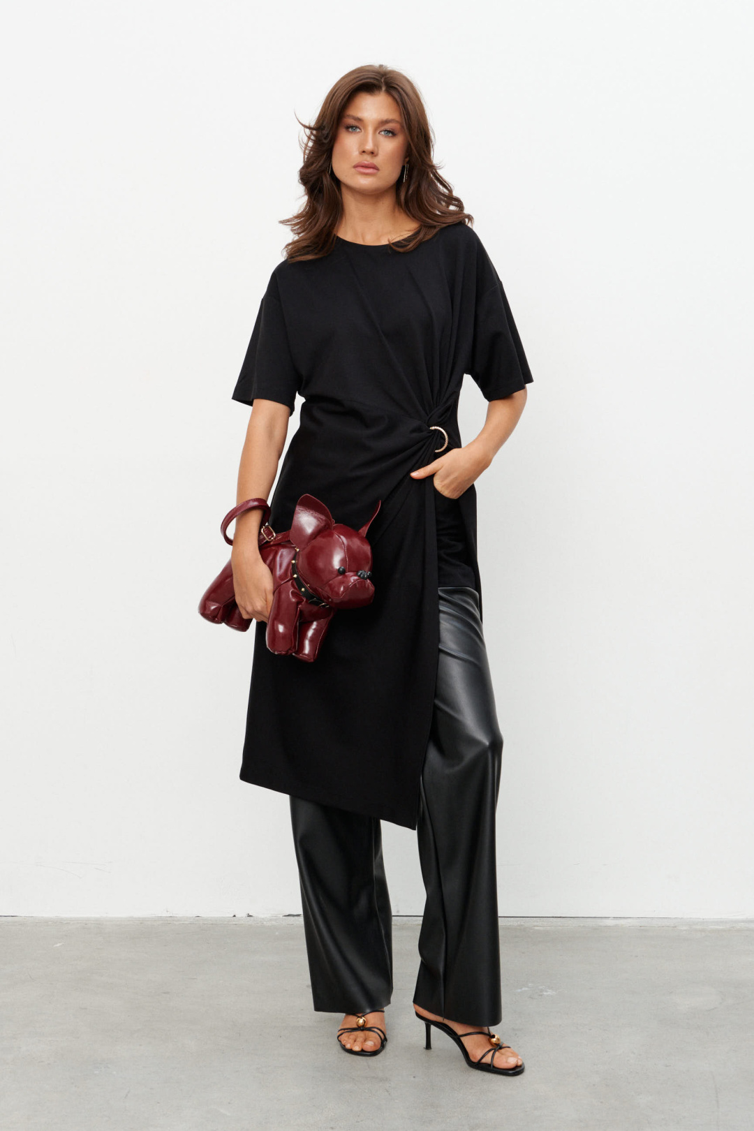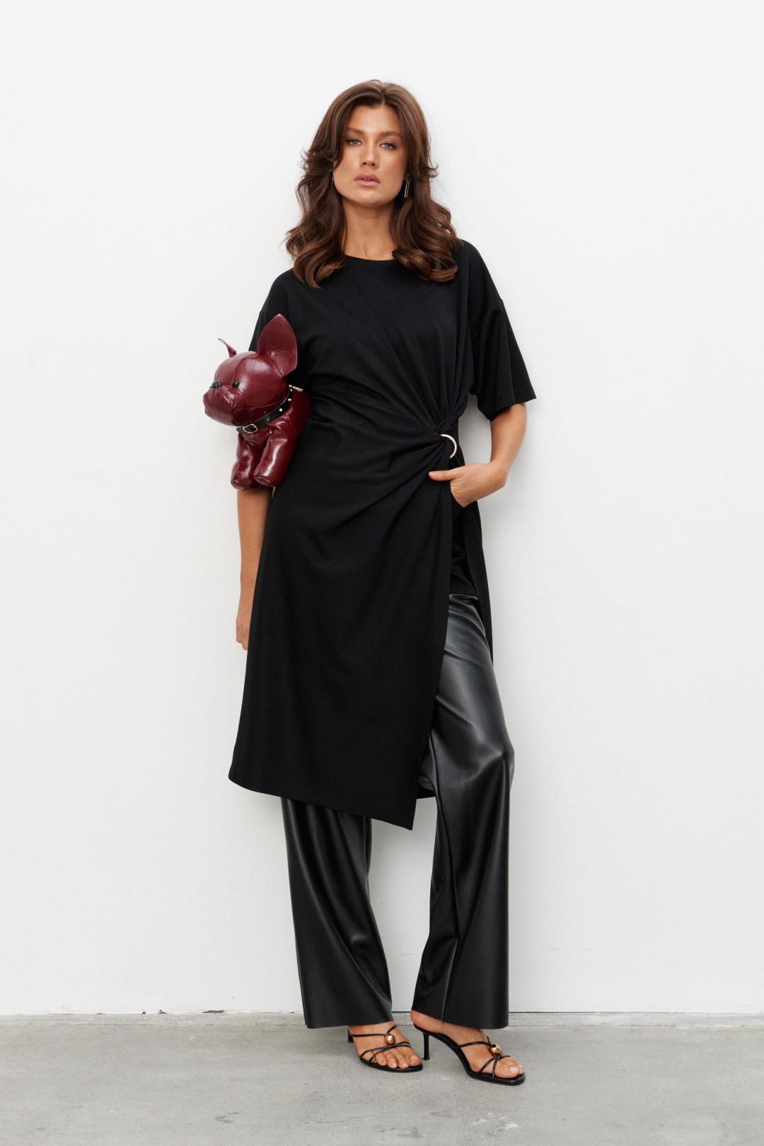 Комплект из трикотажного полотна состоящий из платья-туники и шорт. Платье со спущенным плечом и рукавом до локтя, горловина отделана эластичной бейкой. Сбоку, чуть ниже талии, конструктивный элемент в виде узла, переходящего в высокий разрез. Через узел протянуто декоративное золотое кольцо. Шорты плотно прилегающие на резинке по поясу. Длина по середине спинки 44-48р -112,5 см 50-54р -113 см Длина рукава 44-54р -20 см