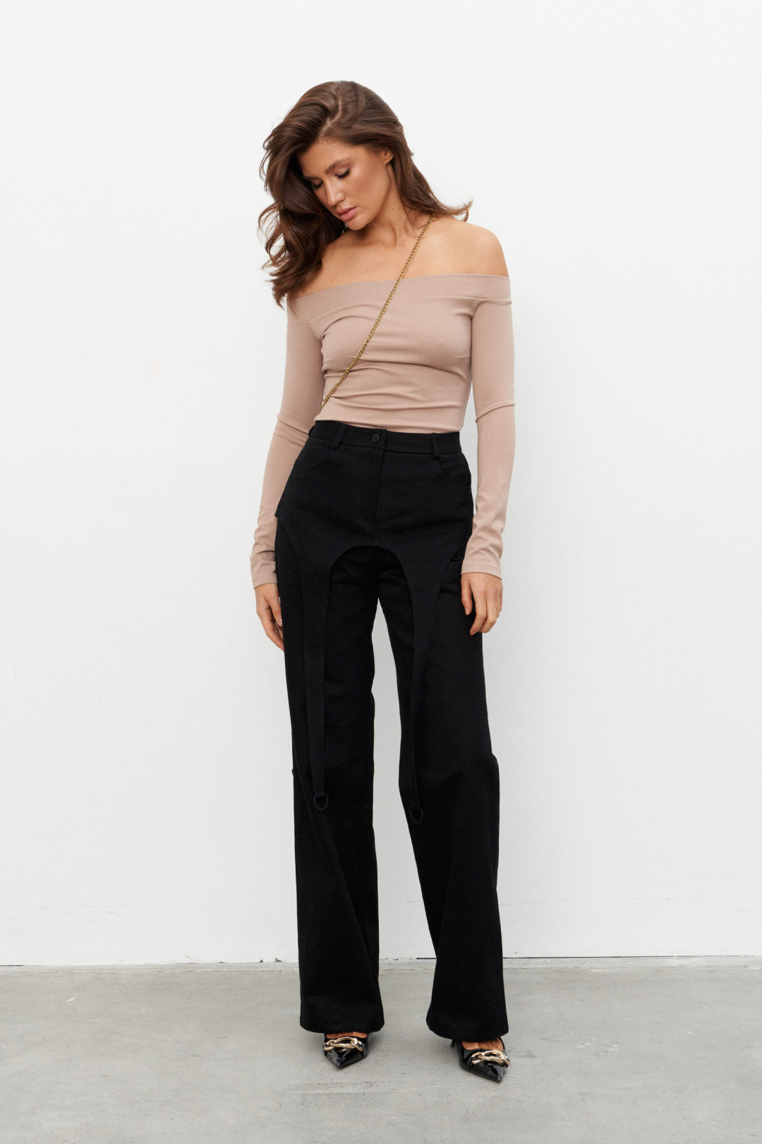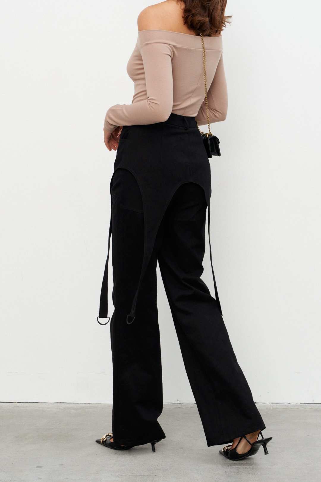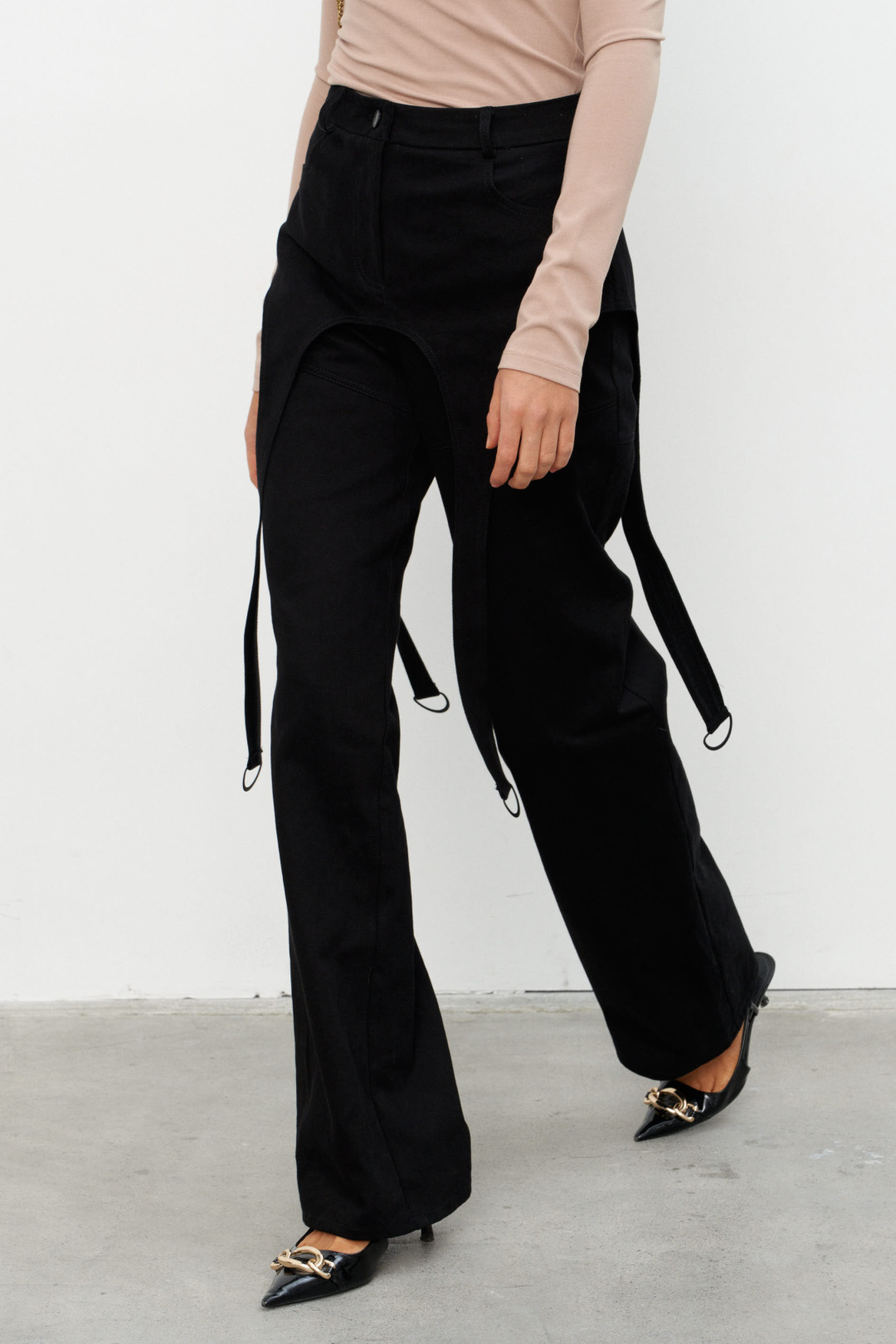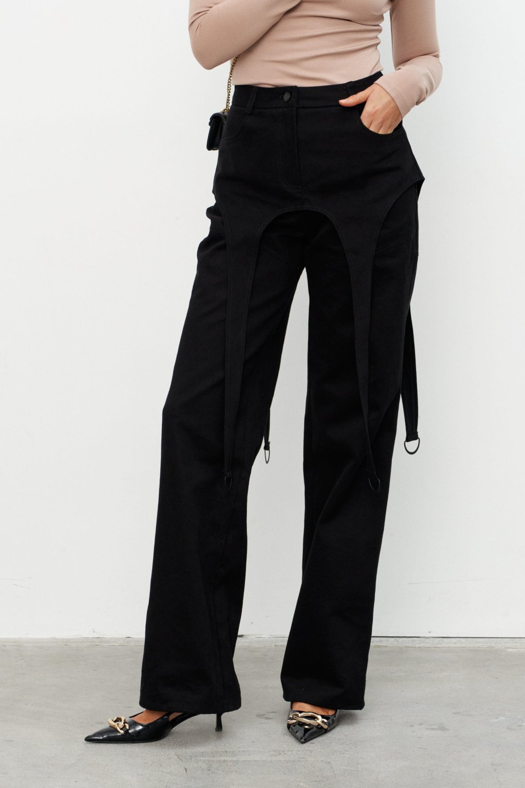 Брюки прямого силуэта из плотного джинса с баской. Брюки на поясе со шлёвками и застёжкой на пуговицу-болт и молнию. Чуть ниже шва сидения идут подрезы имитирующие по форме мини-шорты. По переду два прорезных кармана, по спинке - два накладных. Длина брюк от талии 44-48р - 112 см 50-54р - 113см