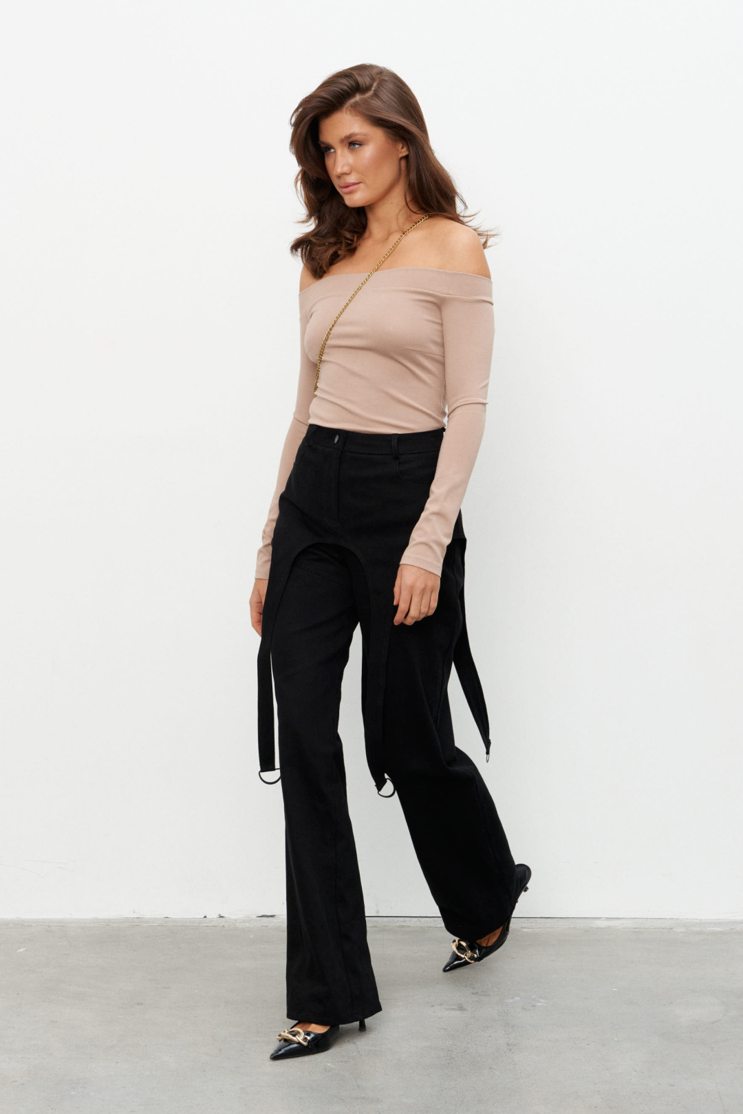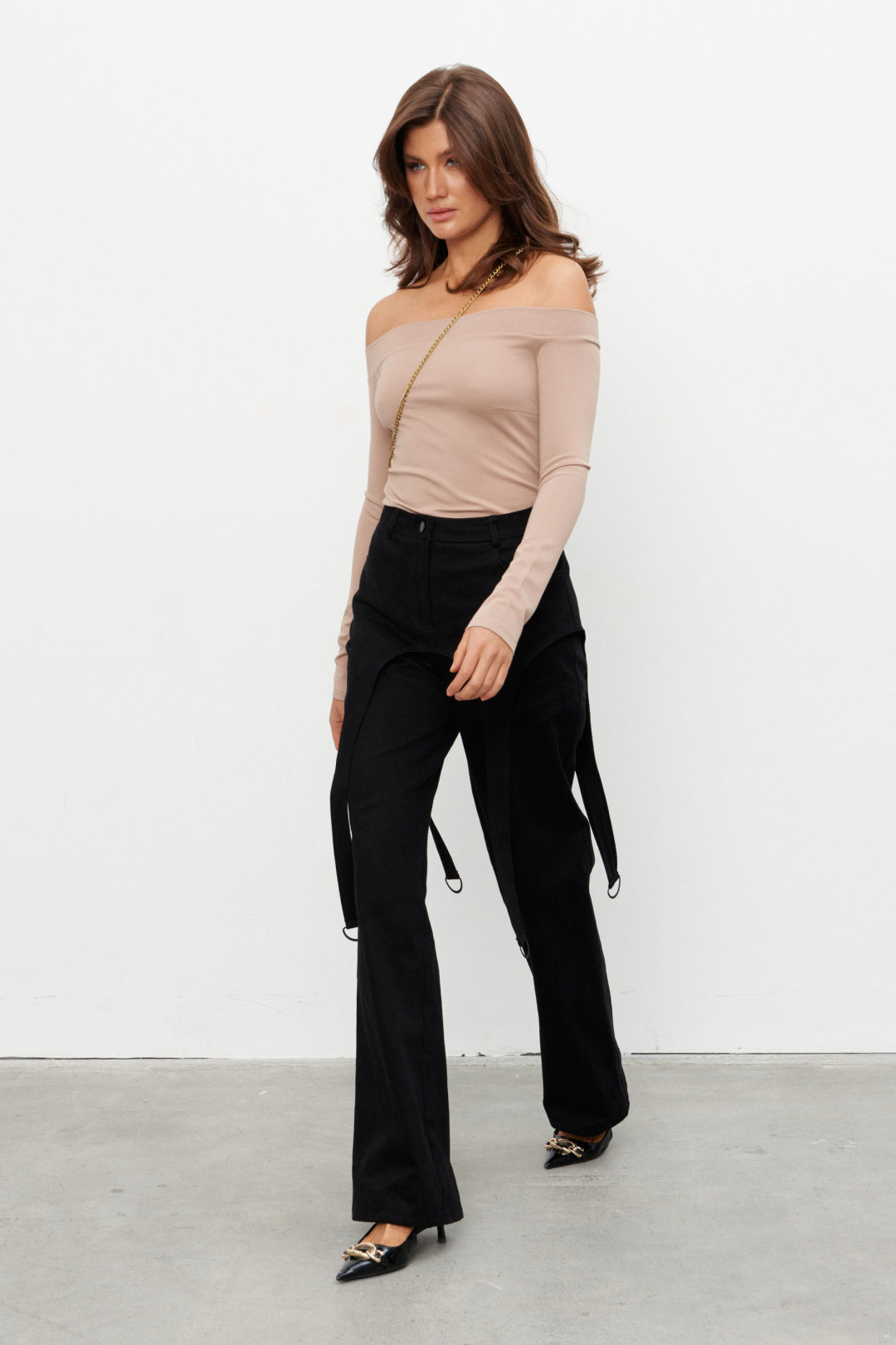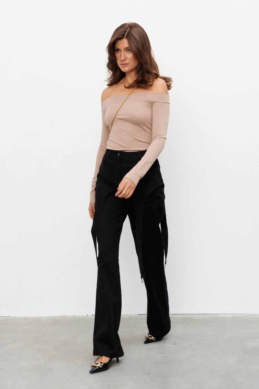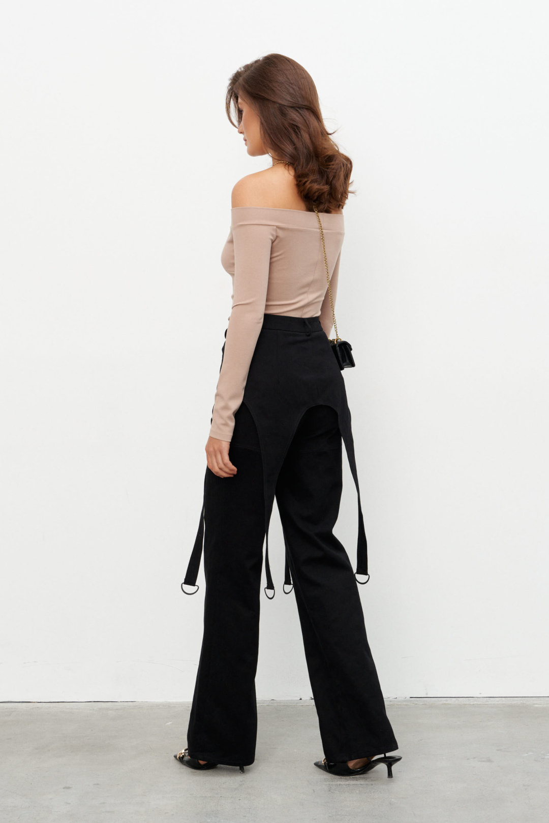 Брюки прямого силуэта из плотного джинса с баской. Брюки на поясе со шлёвками и застёжкой на пуговицу-болт и молнию. Чуть ниже шва сидения идут подрезы имитирующие по форме мини-шорты. По переду два прорезных кармана, по спинке - два накладных. Длина брюк от талии 44-48р - 112 см 50-54р - 113см