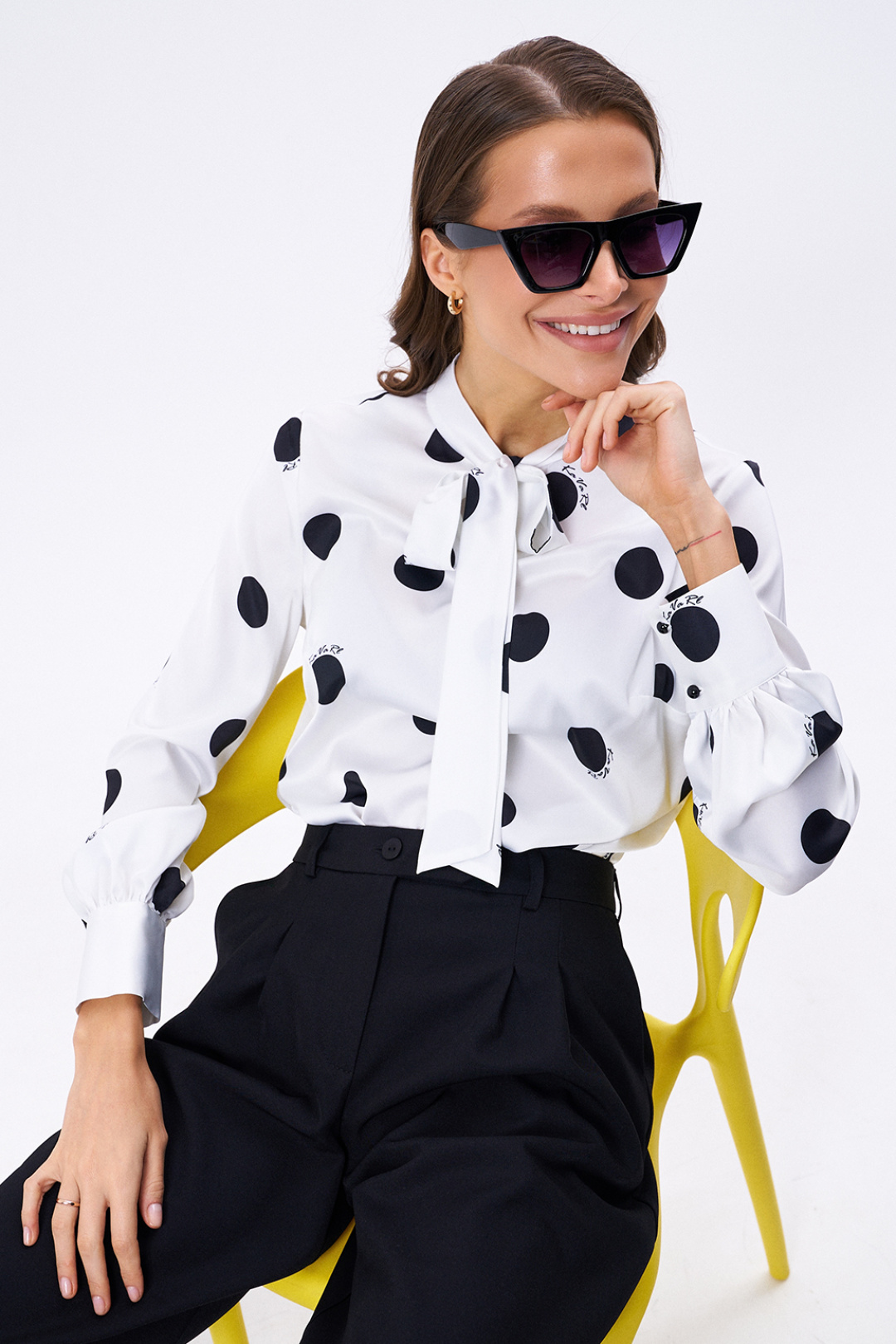 Классическая блузка из искусственного шёлка в крупный горох. Рукава на манжетах с застёжкой на пуговицу. По горловине стойка, переходящая в завязку для банта.