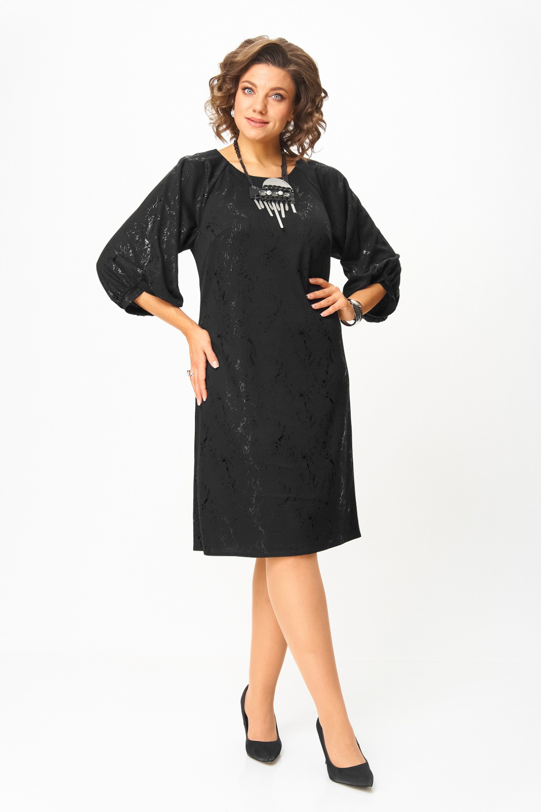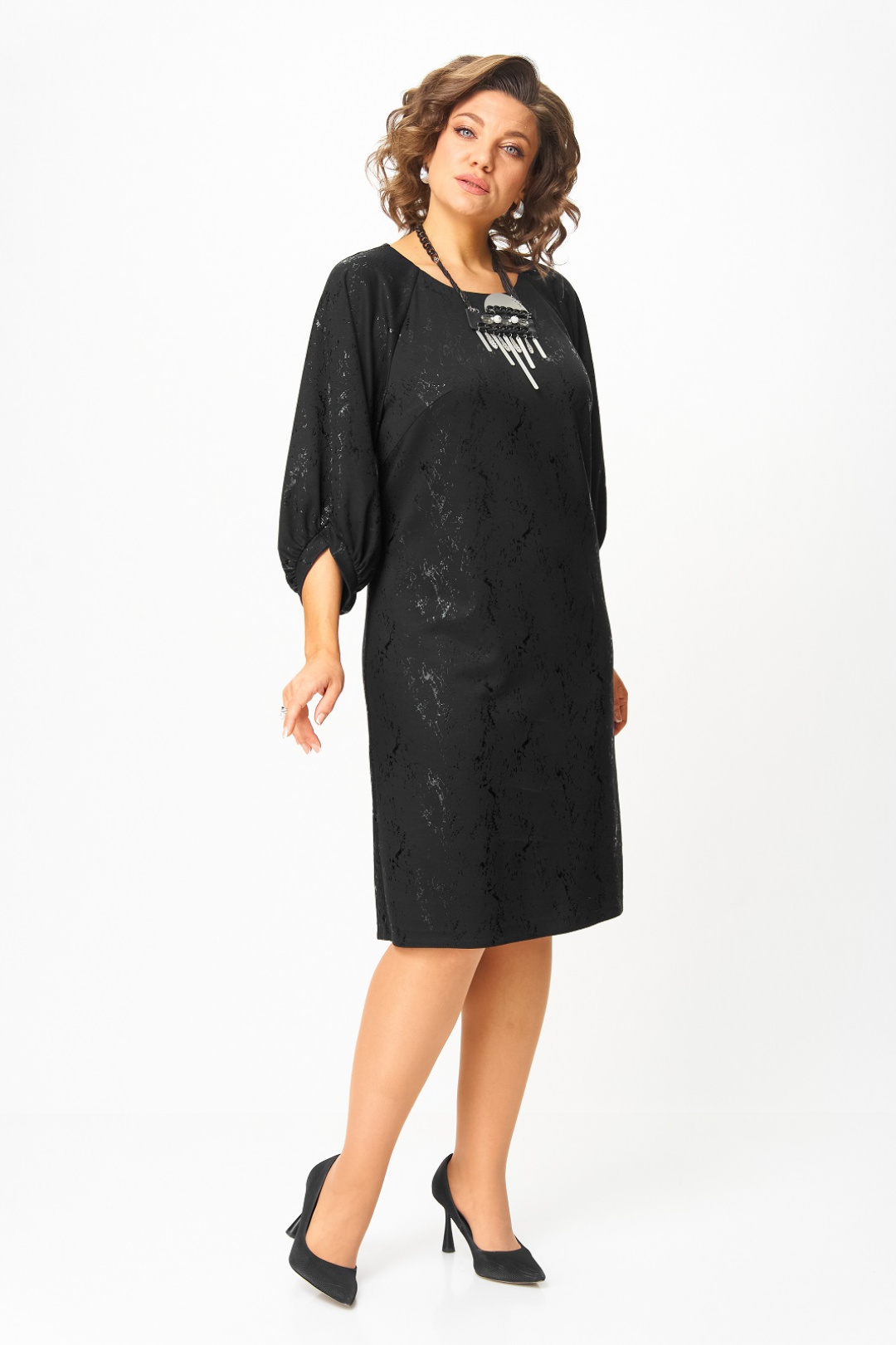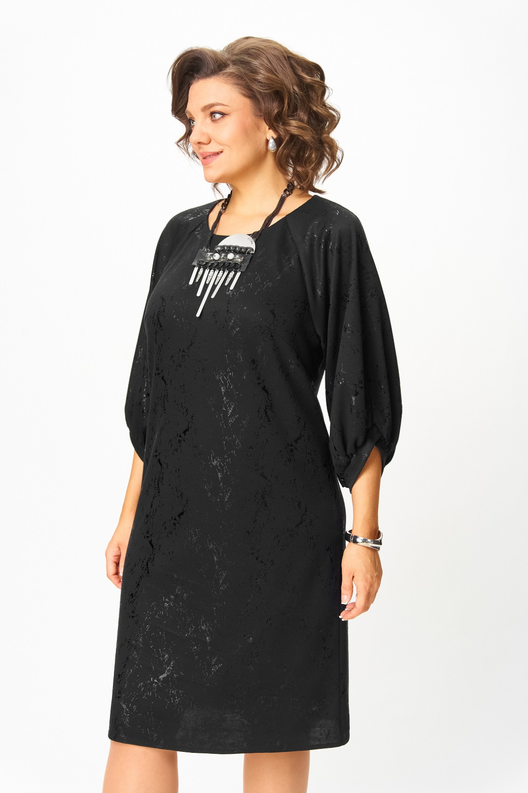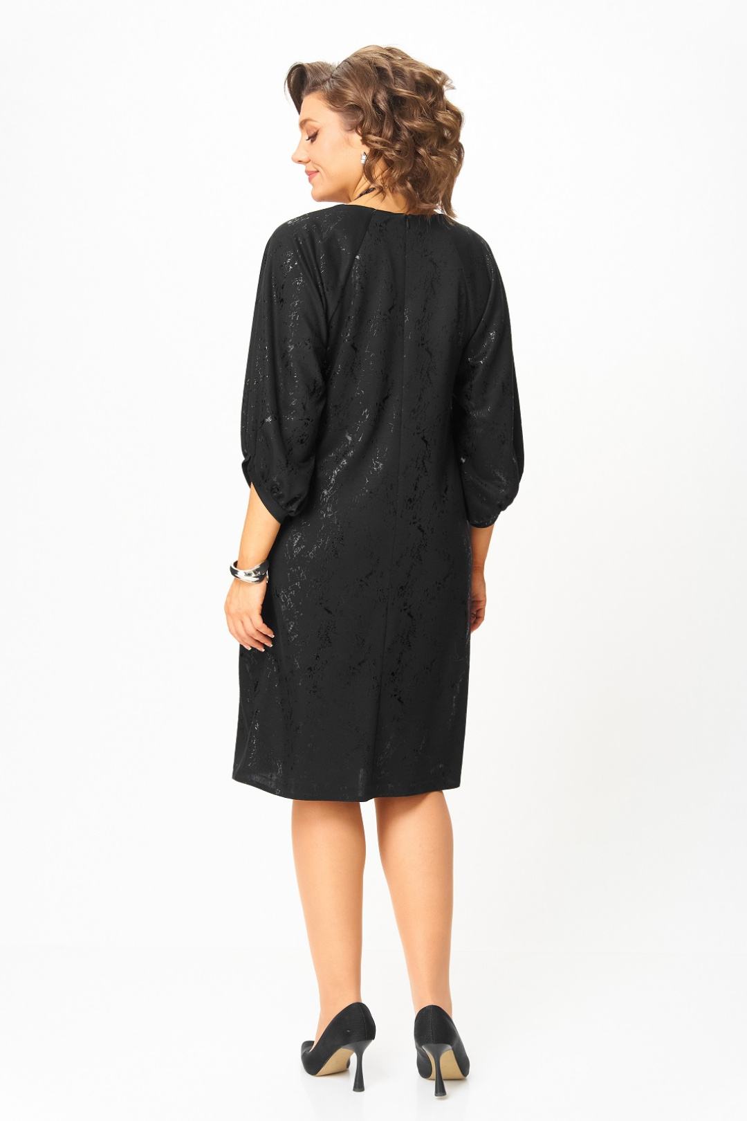 Нарядное женское платье из трикотажного полотна с добавлением вискозы. Нарядность платью придает блестящий рисунок в тон основного цвета. Силуэт прямой, длина чуть ниже колена, вырез горловины круглый с застежкой на потайную молнию в среднем шве по спинке, рукав реглан 3/4 с фигурным манжетом и сборкой по низу.