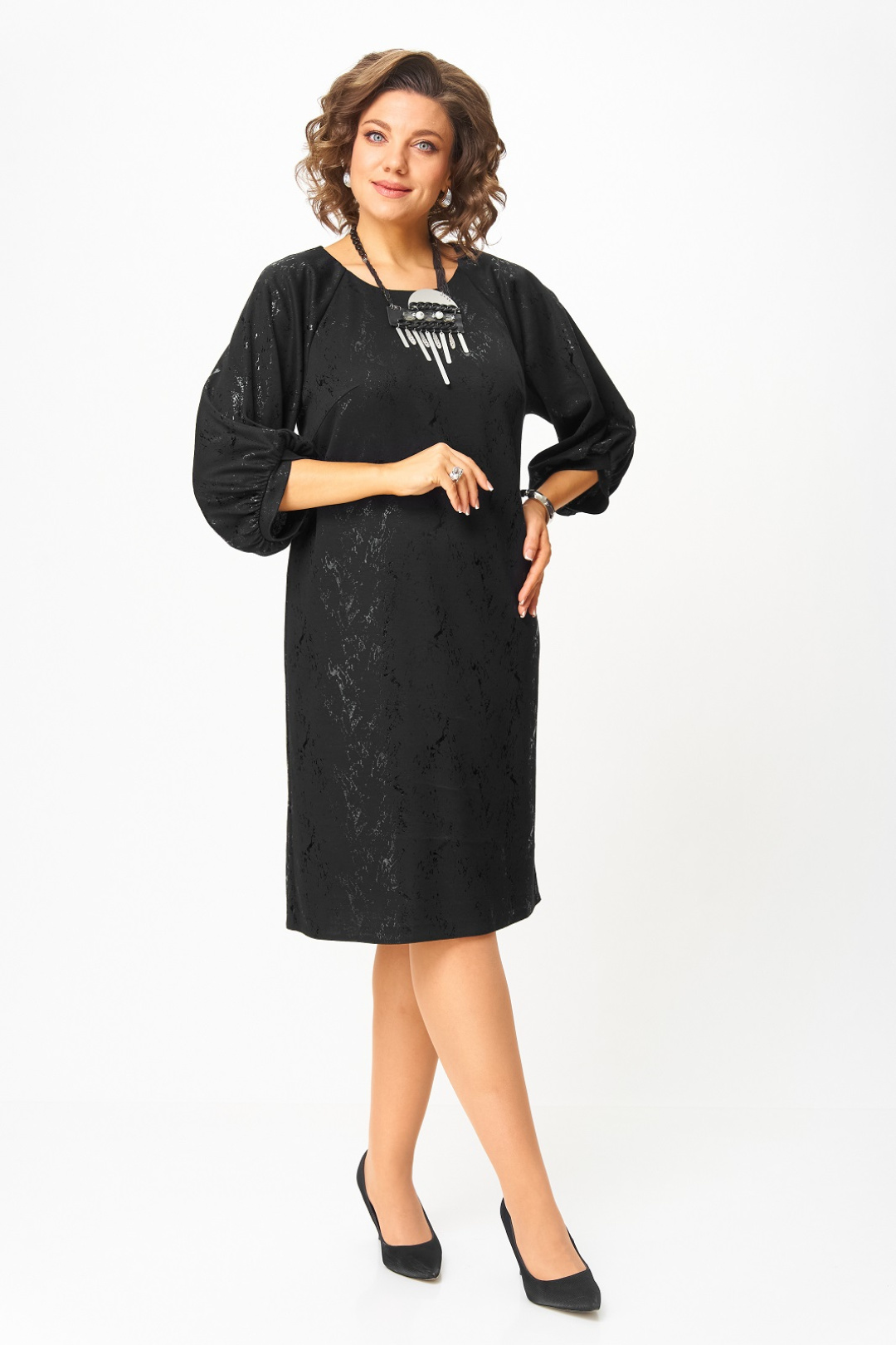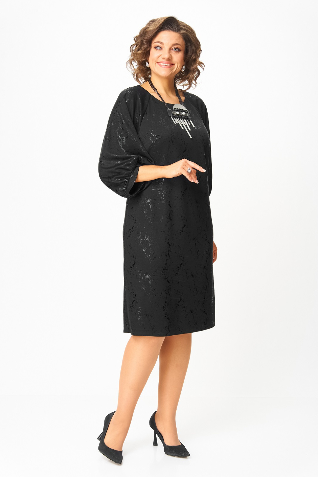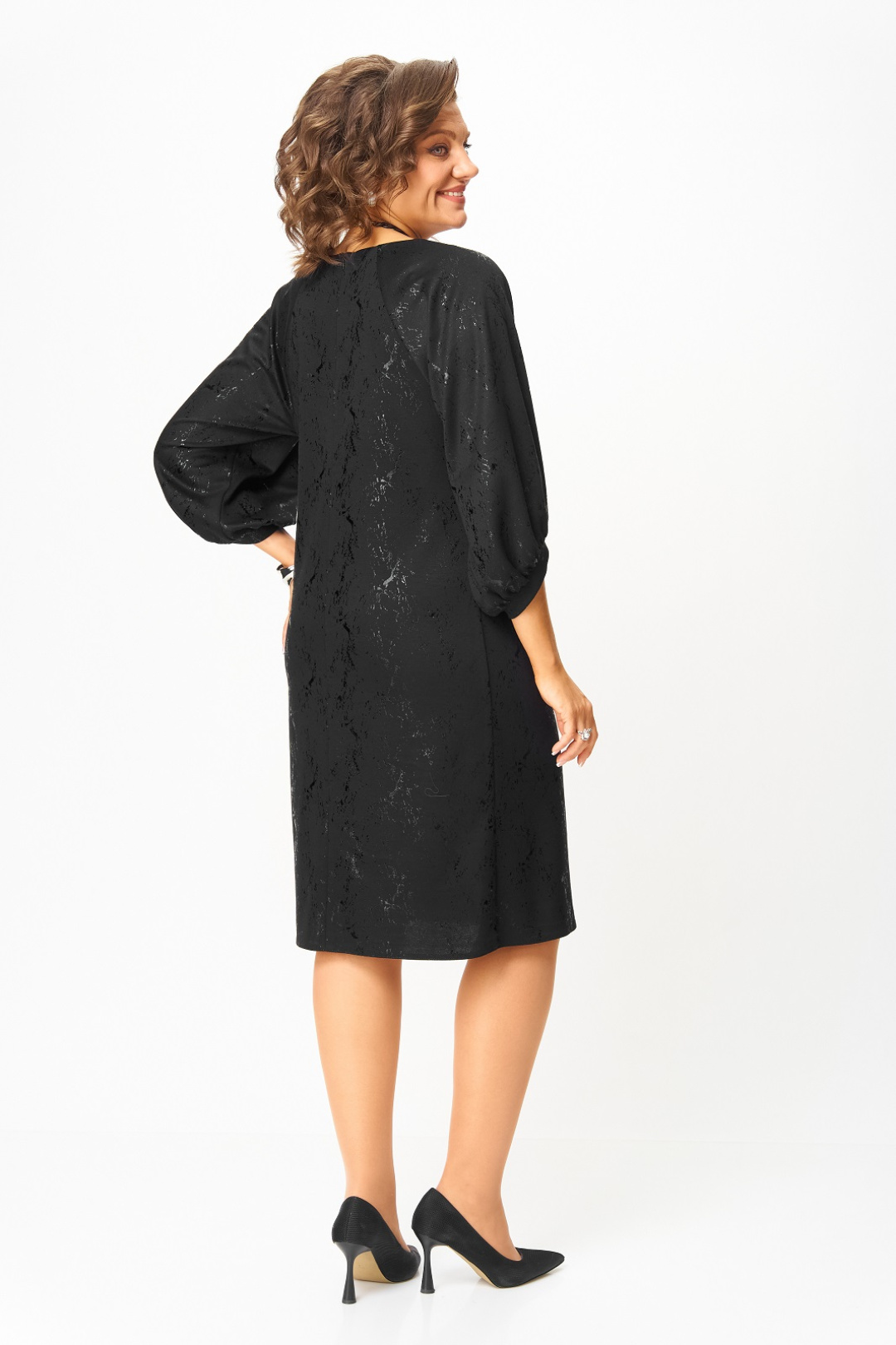 Нарядное женское платье из трикотажного полотна с добавлением вискозы. Нарядность платью придает блестящий рисунок в тон основного цвета. Силуэт прямой, длина чуть ниже колена, вырез горловины круглый с застежкой на потайную молнию в среднем шве по спинке, рукав реглан 3/4 с фигурным манжетом и сборкой по низу.