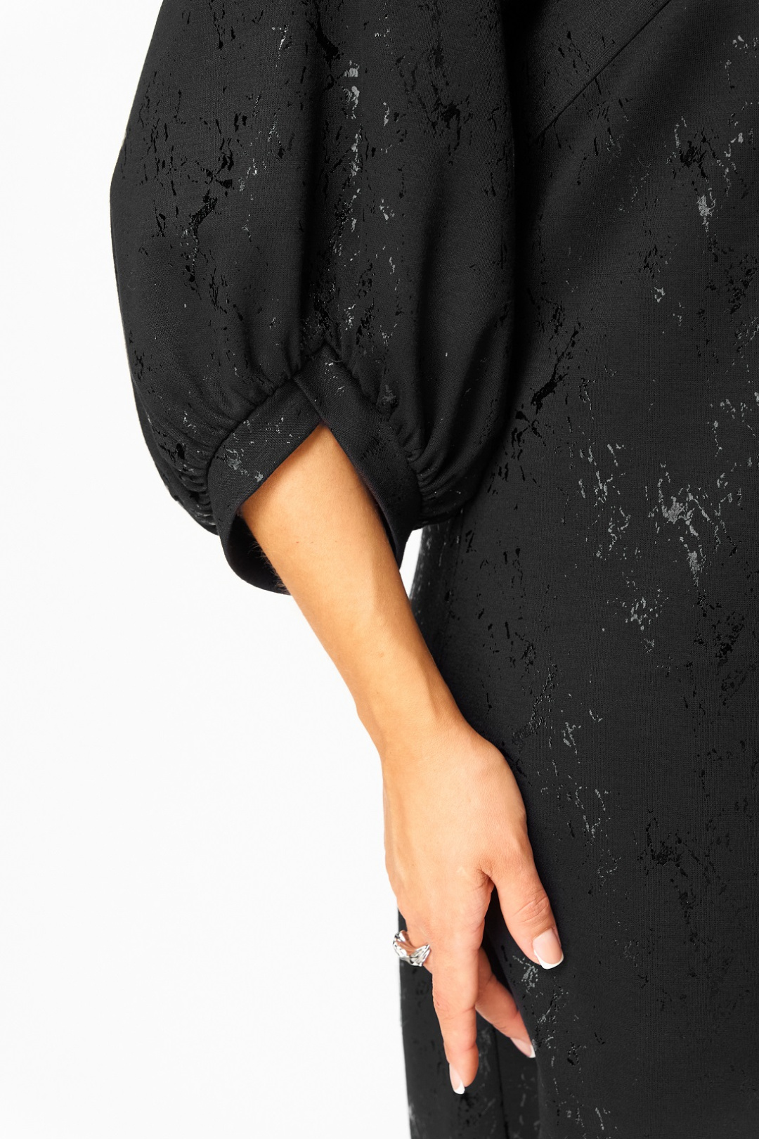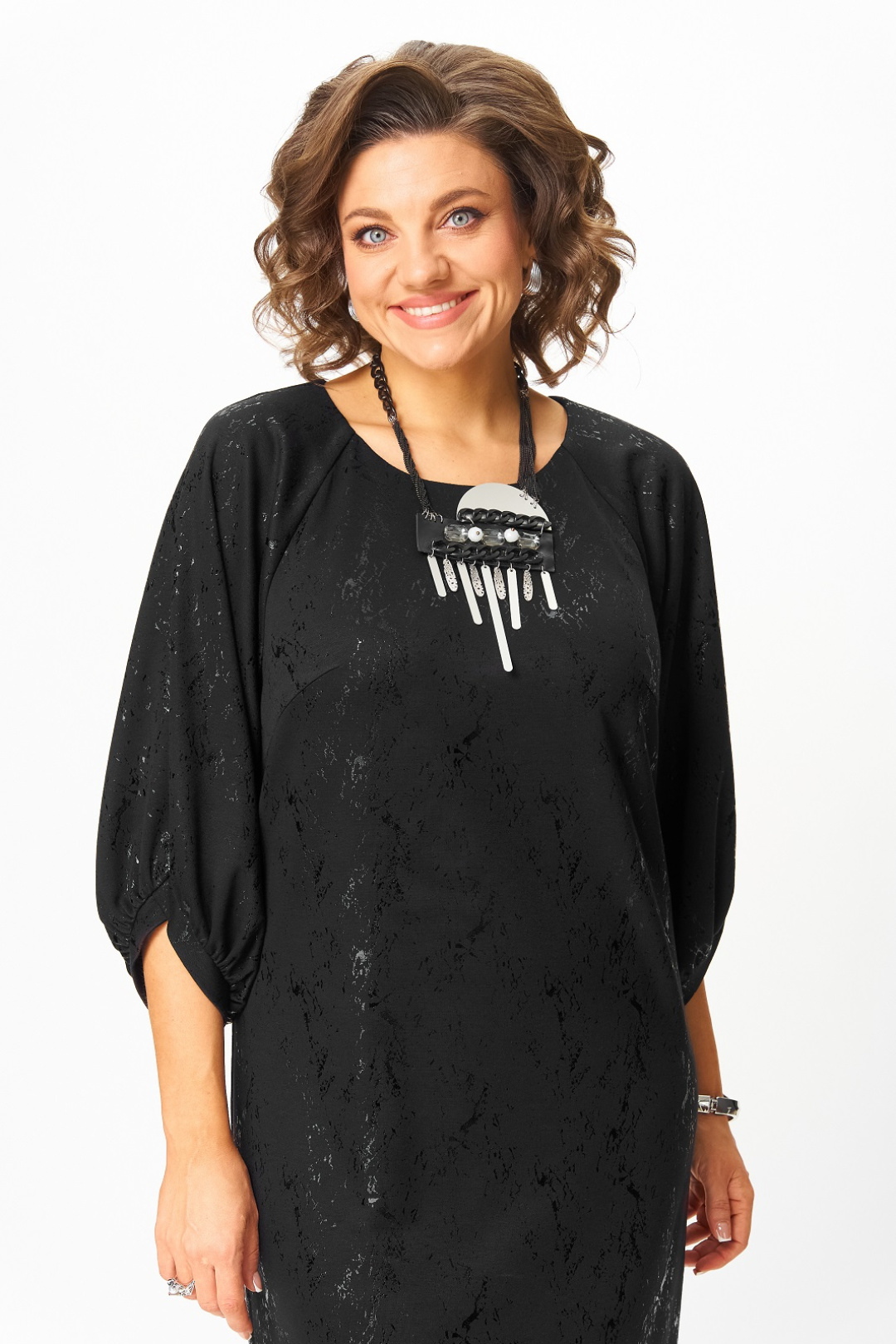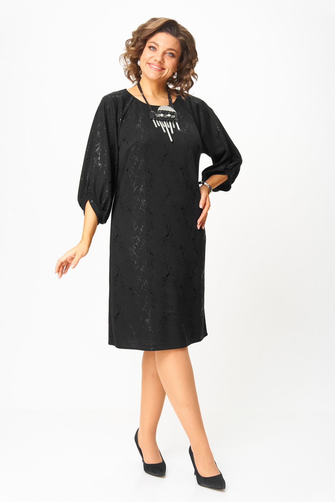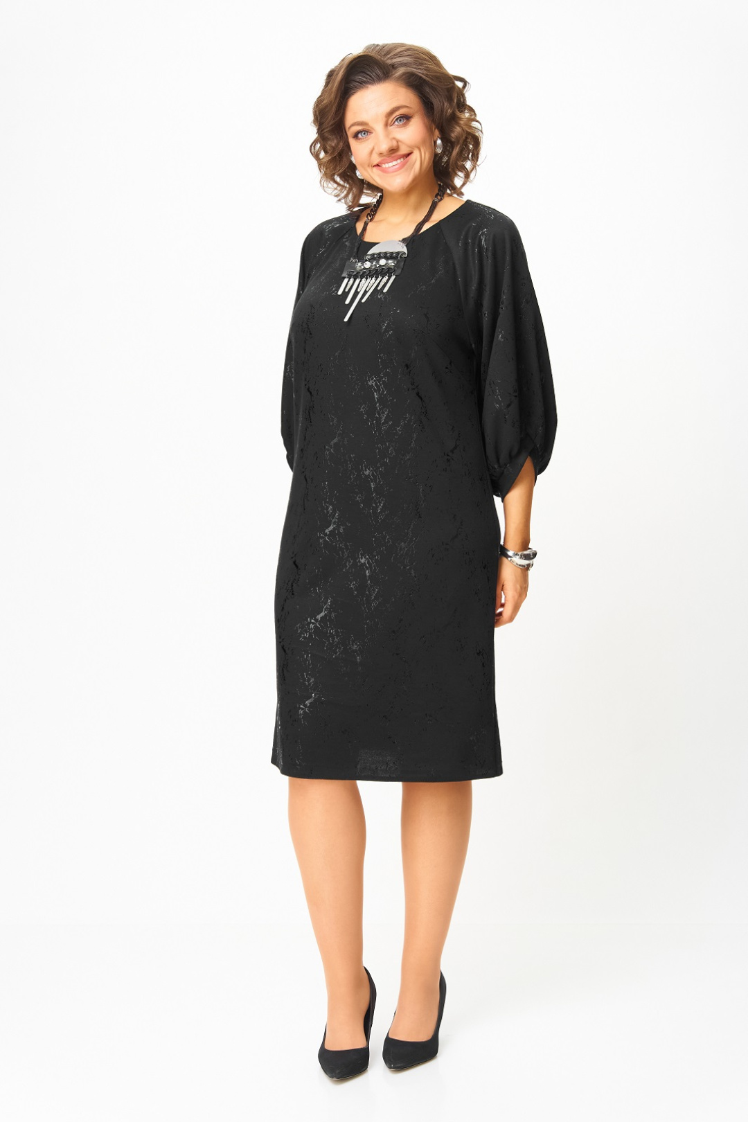 Нарядное женское платье из трикотажного полотна с добавлением вискозы. Нарядность платью придает блестящий рисунок в тон основного цвета. Силуэт прямой, длина чуть ниже колена, вырез горловины круглый с застежкой на потайную молнию в среднем шве по спинке, рукав реглан 3/4 с фигурным манжетом и сборкой по низу.