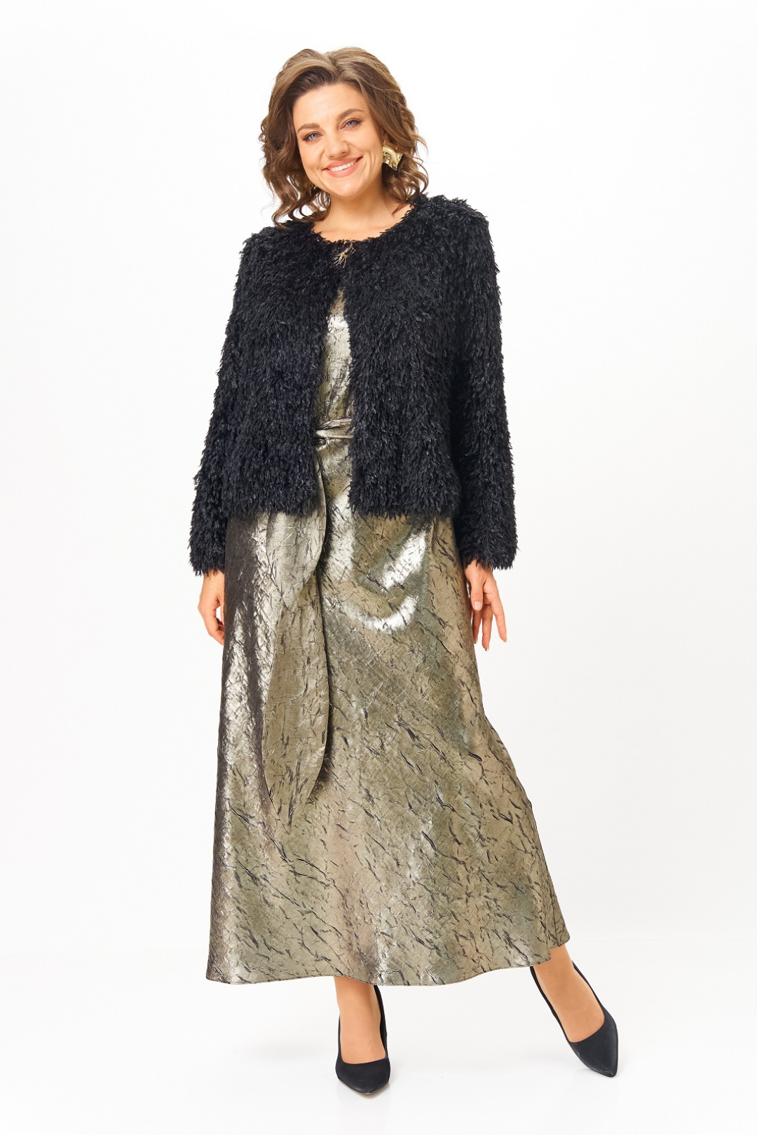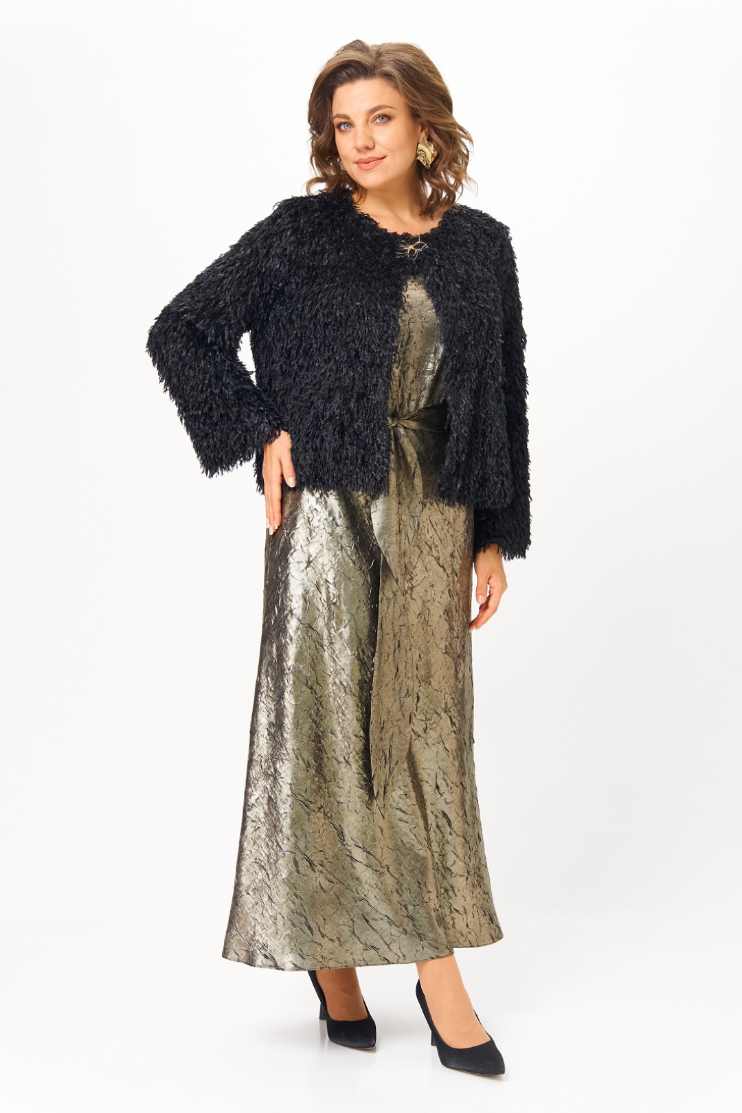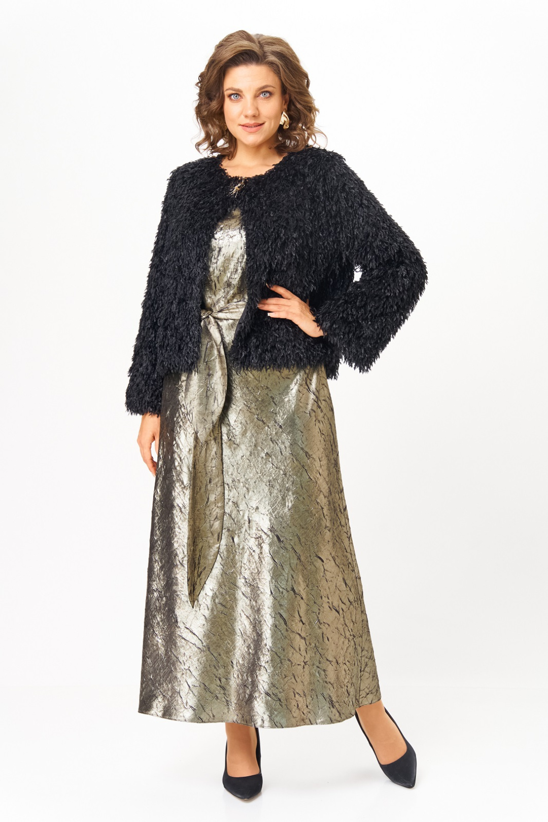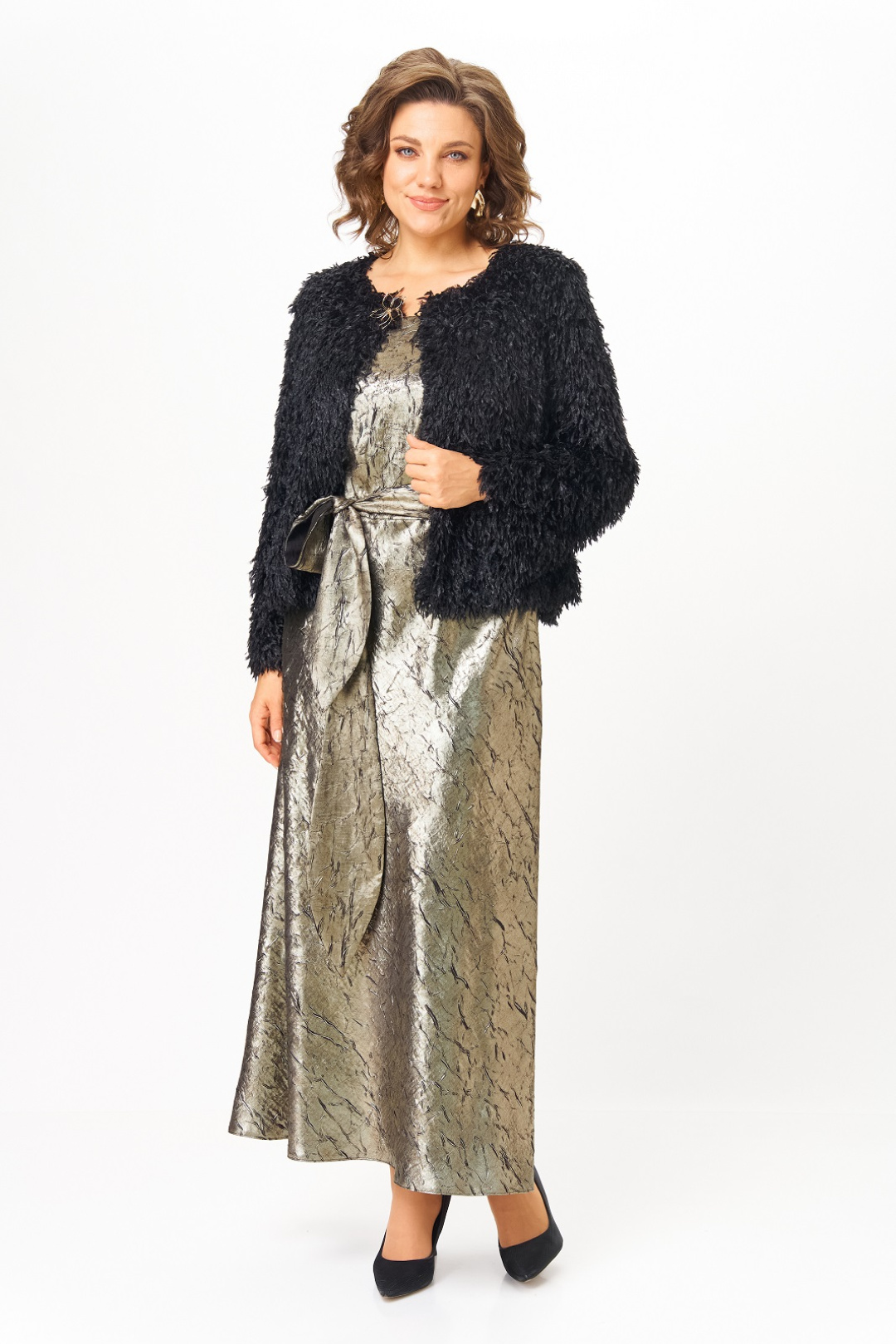Нарядный женский комплект, состоящий из платья и жакета на подкладке. Платье из атласа с добавлением шелка, фактура ткани с эффектом "крэш". Удлиненное, отрезное по линии талии, вырез горловины круглый, рукав цельнокроенный, короткий, в боковом шве потайная молния, юбка расширена к низу, съемный пояс двухсторонний. Жакет на подкладке, из ткани с имитацией ворса, что придает особенный шик и нарядность, вырез горловины круглый с застежкой на кнопку и декоративной брошью. Рукав длинный.
