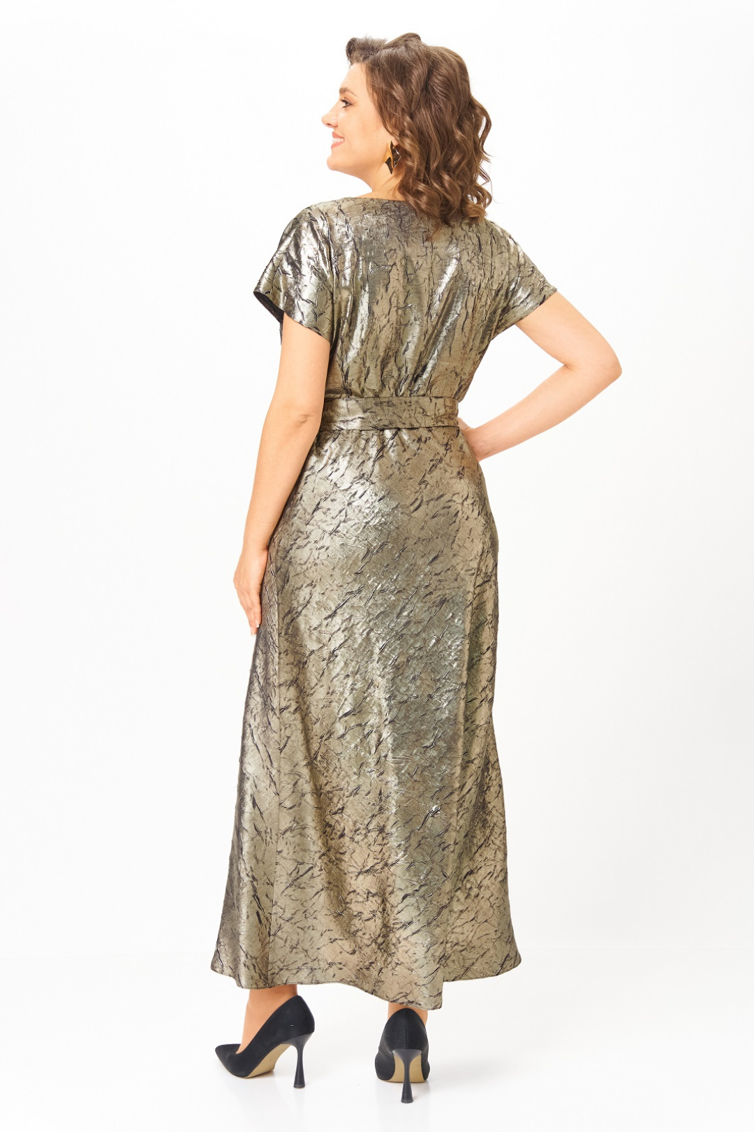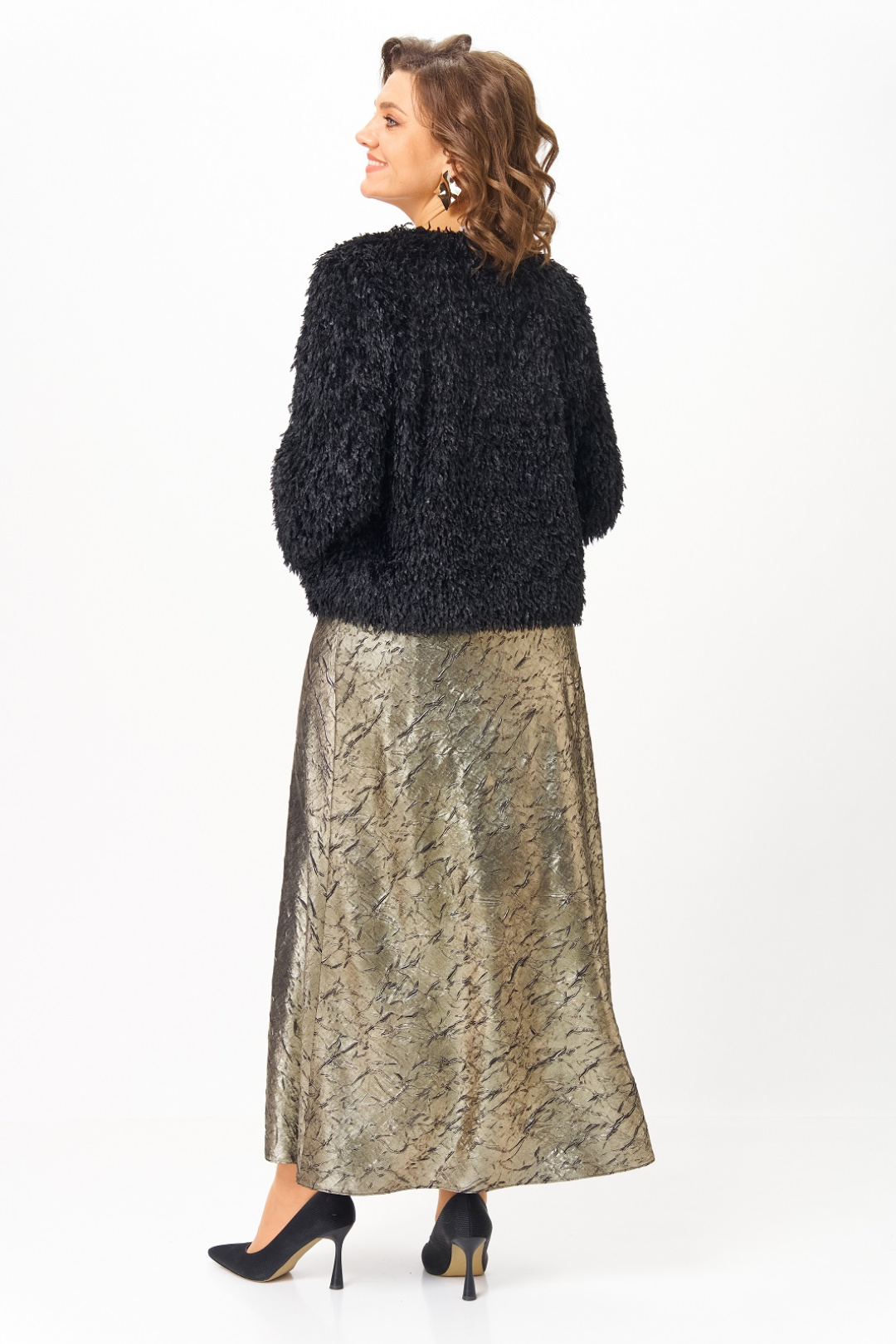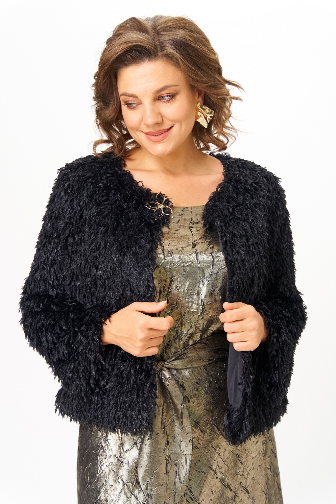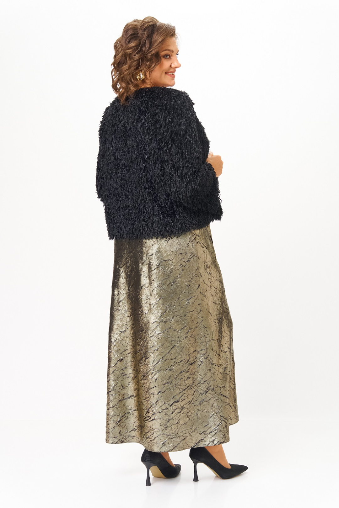 Нарядный женский комплект, состоящий из платья и жакета на подкладке. Платье из атласа с добавлением шелка, фактура ткани с эффектом "крэш". Удлиненное, отрезное по линии талии, вырез горловины круглый, рукав цельнокроенный, короткий, в боковом шве потайная молния, юбка расширена к низу, съемный пояс двухсторонний. Жакет на подкладке, из ткани с имитацией ворса, что придает особенный шик и нарядность, вырез горловины круглый с застежкой на кнопку и декоративной брошью. Рукав длинный.